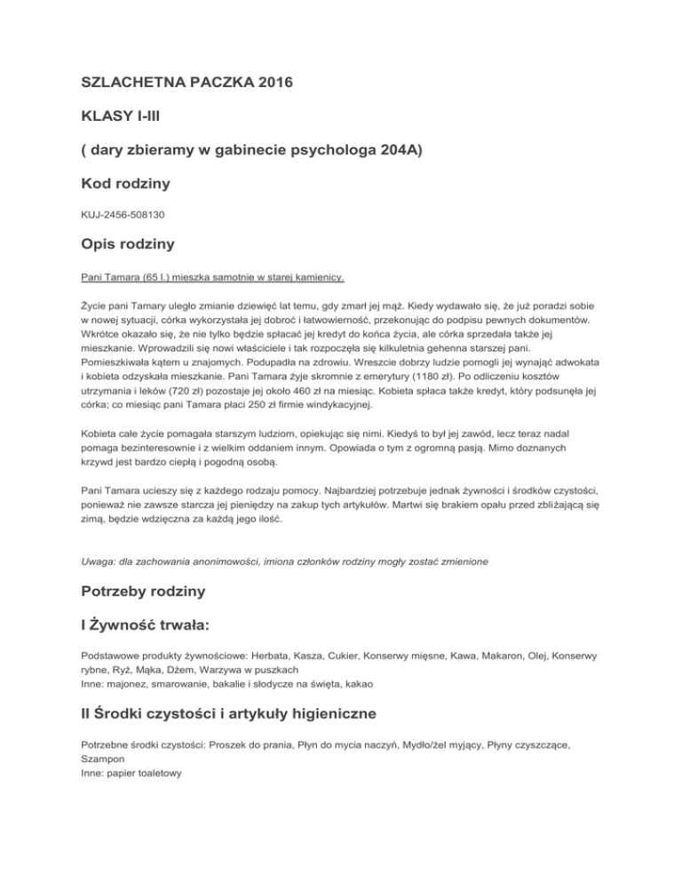 SZLACHETNA PACZKA 2016 KLASY I-III ( dary zbieramy w gabinecie psychologa 204A) Kod rodziny KUJ-2456-508130 Opis rodziny Pani Tamara (65 l.) mieszka samotnie w starej kamienicy. Życie pani Tamary uległo zmianie dziewięć lat temu, gdy zmarł jej mąż. Kiedy wydawało się, że już poradzi sobie w nowej sytuacji, córka wykorzystała jej dobroć i łatwowierność, przekonując do podpisu pewnych dokumentów. Wkrótce okazało się, że nie tylko będzie spłacać jej kredyt do końca życia, ale córka sprzedała także jej mieszkanie. Wprowadzili się nowi właściciele i tak rozpoczęła się kilkuletnia gehenna starszej pani. Pomieszkiwała kątem u znajomych. Podupadła na zdrowiu. Wreszcie dobrzy ludzie pomogli jej wynająć adwokata i kobieta odzyskała mieszkanie. Pani Tamara żyje skromnie z emerytury (1180 zł). Po odliczeniu kosztów utrzymania i leków (720 zł) pozostaje jej około 460 zł na miesiąc. Kobieta spłaca także kredyt, który podsunęła jej córka; co miesiąc pani Tamara płaci 250 zł firmie windykacyjnej. Kobieta całe życie pomagała starszym ludziom, opiekując się nimi. Kiedyś to był jej zawód, lecz teraz nadal pomaga bezinteresownie i z wielkim oddaniem innym. Opowiada o tym z ogromną pasją. Mimo doznanych krzywd jest bardzo ciepłą i pogodną osobą. Pani Tamara ucieszy się z każdego rodzaju pomocy. Najbardziej potrzebuje jednak żywności i środków czystości, ponieważ nie zawsze starcza jej pieniędzy na zakup tych artykułów. Martwi się brakiem opału przed zbliżającą się zimą, będzie wdzięczna za każdą jego ilość. Uwaga: dla zachowania anonimowości, imiona członków rodziny mogły zostać zmienione Potrzeby rodziny I Żywność trwała: Podstawowe produkty żywnościowe: Herbata, Kasza, Cukier, Konserwy mięsne, Kawa, Makaron, Olej, Konserwy rybne, Ryż, Mąka, Dżem, Warzywa w puszkach Inne: majonez, smarowanie, bakalie i słodycze na święta, kakao II Środki czystości i artykuły higieniczne Potrzebne środki czystości: Proszek do prania, Płyn do mycia naczyń, Mydło/żel myjący, Płyny czyszczące, Szampon Inne: papier toaletowy VII. INNE POTRZEBY: opał(węgiel) - pani Tamara będzie wdzięczna za każda ilość VIII Szczególne upominki: kosmetyki i drobna biżuteria dla pani Tamary żywność brakuje pieniędzy na jej zakup środki czystości nie można bez nich utrzymywać odpowiedniej czystości opał bardzo się przyda na nadchodzącą zimę
