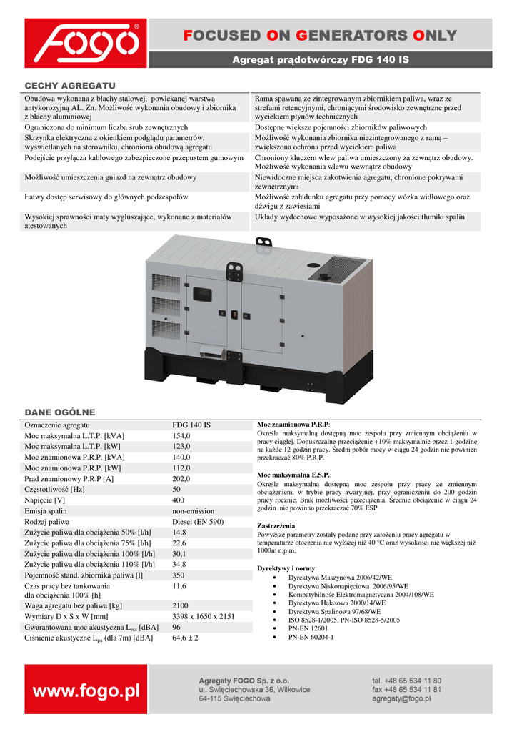 Agregat prądotwórczy FDG 140 IS CECHY AGREGATU Obudowa wykonana z blachy stalowej, powlekanej warstwą antykorozyjną AL. Zn. Możliwość wykonania obudowy i zbiornika z blachy aluminiowej Ograniczona do minimum liczba śrub zewnętrznych Skrzynka elektryczna z okienkiem podglądu parametrów, wyświetlanych na sterowniku, chroniona obudową agregatu Podejście przyłącza kablowego zabezpieczone przepustem gumowym Możliwość umieszczenia gniazd na zewnątrz obudowy Łatwy dostęp serwisowy do głównych podzespołów Wysokiej sprawności maty wygłuszające, wykonane z materiałów atestowanych Rama spawana ze zintegrowanym zbiornikiem paliwa, wraz ze strefami retencyjnymi, chroniącymi środowisko zewnętrzne przed wyciekiem płynów technicznych Dostępne większe pojemności zbiorników paliwowych Możliwość wykonania zbiornika niezintegrowanego z ramą – zwiększona ochrona przed wyciekiem paliwa Chroniony kluczem wlew paliwa umieszczony za zewnątrz obudowy. Możliwość wykonania wlewu wewnątrz obudowy Niewidoczne miejsca zakotwienia agregatu, chronione pokrywami zewnętrznymi Możliwość załadunku agregatu przy pomocy wózka widłowego oraz dźwigu z zawiesiami Układy wydechowe wyposażone w wysokiej jakości tłumiki spalin DANE OGÓLNE Oznaczenie agregatu Moc maksymalna L.T.P. [kVA] Moc maksymalna L.T.P. [kW] Moc znamionowa P.R.P. [kVA] Moc znamionowa P.R.P. [kW] Prąd znamionowy P.R.P [A] Częstotliwość [Hz] Napięcie [V] Emisja spalin Rodzaj paliwa Zużycie paliwa dla obciążenia 50% [l/h] Zużycie paliwa dla obciążenia 75% [l/h] Zużycie paliwa dla obciążenia 100% [l/h] Zużycie paliwa dla obciążenia 110% [l/h] Pojemność stand. zbiornika paliwa [l] Czas pracy bez tankowania dla obciążenia 100% [h] Waga agregatu bez paliwa [kg] Wymiary D x S x W [mm] Gwarantowana moc akustyczna Lwa [dBA] Ciśnienie akustyczne Lpa (dla 7m) [dBA] FDG 140 IS 154,0 123,0 140,0 112,0 202,0 50 400 non-emission Diesel (EN 590) 14,8 22,6 30,1 34,8 350 11,6 2100 3398 x 1650 x 2151 96 64,6 ± 2 Moc znamionowa P.R.P: Określa maksymalną dostępną moc zespołu przy zmiennym obciążeniu w pracy ciągłej. Dopuszczalne przeciążenie +10% maksymalnie przez 1 godzinę na każde 12 godzin pracy. Średni pobór mocy w ciągu 24 godzin nie powinien przekraczać 80% P.R.P. Moc maksymalna E.S.P.: Określa maksymalną dostępną moc zespołu przy pracy ze zmiennym obciążeniem, w trybie pracy awaryjnej, przy ograniczeniu do 200 godzin pracy rocznie. Brak możliwości przeciążenia. Średnie obciążenie w ciągu 24 godzin nie powinno przekraczać 70% ESP Zastrzeżenia: Powyższe parametry zostały podane przy założeniu pracy agregatu w temperaturze otoczenia nie wyższej niż 40 °C oraz wysokości nie większej niż 1000m n.p.m. Dyrektywy i normy: • Dyrektywa Maszynowa 2006/42/WE • Dyrektywa Niskonapięciowa 2006/95/WE • Kompatybilność Elektromagnetyczna 2004/108/WE • Dyrektywa Hałasowa 2000/14/WE • Dyrektywa Spalinowa 97/68/WE • ISO 8528-1/2005, PN-ISO 8528-5/2005 • PN-EN 12601 • PN-EN 60204-1 Agregat prądotwórczy FDG 140 IS STEROWNIK STANDARD Typ sterownika: AMF25 Intuicyjny interfejs graficzny Zegar czasu rzeczywistego z akumulatorem Kontrola zasilania sieciowego, automatyczny start generatora Dziennik zdarzeń: do 119 pozycji Pomiar wartości prądu w 3 fazach Pomiar wartości napięcia sieci i generatora Pomiar mocy czynnej, biernej i pozornej Licznik energii czynnej i biernej generatora Licznik czasu pracy Pomiar napięcia akumulatora Pomiar poziomu paliwa Ochrona generatora (częstotliwość, napięcie, asymetria, przeciążenie) Obsługa silników z protokołem CAN wg. standardu J1939 Komunikacja RS 485 Modbus oraz RS232 (wymagany moduł IL-NT RS232-485) Obsługa zdalna przez GPRS (wymagany moduł IL-NT GPRS) Obsługa zdalna przez Internet (wymagany moduł IB-Lite) Darmowy system InteliMonitor do podglądu parametrów agregatów Darmowa aplikacja WebSupervisor dla Android lub iOS do podglądu floty agregatów Wysyłanie powiadomień o błędach poprzez SMS lub e-mail (wymagany moduł IL-NT GPRS lub IB-Lite) SILNIK Producent silnika Typ silnika Kraj produkcji Moc silnika netto [kW] Emisja spalin* Obroty [obr/min] Regulacja obrotów Klasa wykonania** Pojemność silnika [l] Liczba cylindrów Układ paliwowy Instalacja [V] Płyn chłodzący Pojemność cieczy chłodzącej [l] Olej silnikowy Pojemność miski olejowej [l] Rodzaj paliwa Zużycie paliwa dla obciążenia 75% [l/h] Zużycie paliwa dla obciążenia 100% [l/h] * PRĄDNICA Iveco NEF67TM4 Włochy 149,7 non-emission 1500 mechaniczna G2 6,7 6 wtrysk bezpośredni 12 Shell Anti Freeze 15,0 Shell Rimula R4L 17,2 Diesel (EN 590) 22,6 30,1 Zgodnie z Dyrektywą 97/68/WE dotyczącą ograniczenia emisji zanieczyszczeń gazowych i pyłowych z silników spalinowych, montowanych w maszynach samojezdnych, nieporuszających się po drogach. ** Zgodnie z normą PN-ISO 8528-5/1997 Producent prądnicy Typ prądnicy Kraj produkcji Moc prądnicy (40 ºC, 1000m n.p.m.) [kVA] Moc prądnicy (27 ºC, 1000m n.p.m.) [kVA] Sprawność prądnicy [%] Stabilizacja napięcia Poziom stabilizacji napięcia [%] Ochrona Klasa izolacji Odkształcenia harmoniczne prądu THD [%] Reaktancja Xd’’ [%] * Sincro* SK225LM Chorwacja 140,0 155,0 91,7 AVR analogowy +/- 1 IP 23 H < 2,5 10,3 Możliwość zabudowy prądnicy firmy STAMFORD lub innej, wskazanej przez klienta. Dane znamionowe agregatu mogą w takim przypadku ulec zmianie. Agregat prądotwórczy FDG 140 IS WYPOSAŻENIE STANDARDOWE Sterownik AMF25 Wyłącznik sterownika Wyłącznik agregatu Eaton LZMC2-VE250 Cewka wzrostowa wyłącznika generatora Sygnalizator dźwiękowy awarii Przycisk awaryjnego zatrzymania Akumulator rozruchowy 2x 100 Ah Ładowarka akumulatora Grzałka silnika z termostatem Olej silnikowy Shell Rimula R4L Kontrola niskiego ciśnienia oleju Kontrola wysokiej temperatury silnika Ramozbiornik z przestrzenią retencyjną Zamykany wlew paliwa na zewnątrz obudowy 