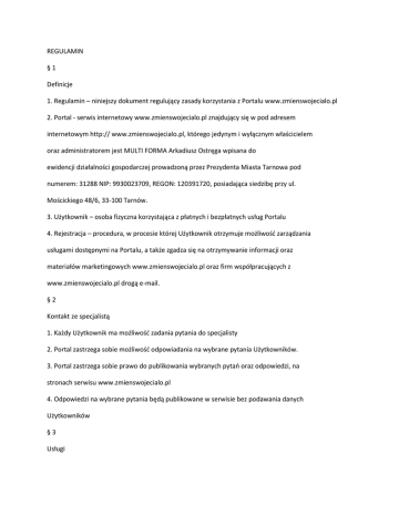 REGULAMIN §1 Definicje 1. Regulamin – niniejszy dokument regulujący zasady korzystania z Portalu www.zmienswojecialo.pl 2. Portal - serwis internetowy www.zmienswojecialo.pl znajdujący się w pod adresem internetowym http:// www.zmienswojecialo.pl, którego jedynym i wyłącznym właścicielem oraz administratorem jest MULTI FORMA Arkadiusz Ostręga wpisana do ewidencji działalności gospodarczej prowadzoną przez Prezydenta Miasta Tarnowa pod numerem: 31288 NIP: 9930023709, REGON: 120391720, posiadająca siedzibę przy ul. Mościckiego 48/6, 33-100 Tarnów. 3. Użytkownik – osoba fizyczna korzystająca z płatnych i bezpłatnych usług Portalu 4. Rejestracja – procedura, w procesie której Użytkownik otrzymuje możliwośd zarządzania usługami dostępnymi na Portalu, a także zgadza się na otrzymywanie informacji oraz materiałów marketingowych www.zmienswojecialo.pl oraz firm współpracujących z www.zmienswojecialo.pl drogą e-mail. §2 Kontakt ze specjalistą 1. Każdy Użytkownik ma możliwośd zadania pytania do specjalisty 2. Portal zastrzega sobie możliwośd odpowiadania na wybrane pytania Użytkowników. 3. Portal zastrzega sobie prawo do publikowania wybranych pytao oraz odpowiedzi, na stronach serwisu www.zmienswojecialo.pl 4. Odpowiedzi na wybrane pytania będą publikowane w serwisie bez podawania danych Użytkowników §3 Usługi W celu rozpoczęcia korzystania z odpłatnych usług www.zmienswojecialo.pl Użytkownik winien: 1. Dokonad wyboru jednego z planów treningowych, planów diety lub innych usług, 2. Uzupełnid w formularzu kontaktowym informacje niezbędne do wygenerowania indywidualnego planu treningowego, diety lub innej usługi 3. Dokonad przedpłaty wybranej usługi 4. Zamówienie indywidualnej diety, planu treningowego lub innych płatnych usług możliwe jest poprzez dokonanie płatności za pośrednictwem zwykłego przelewu bankowego na numer konta podany w wiadomości email wygenerowanej po wypełnieniu formularza konsultacji §4 Warunki świadczenia usług 1. Rozpoczęcie świadczenia odpłatnych usług www.zmienswojecialo.pl nastąpi, na co Użytkownik wyraża zgodę, nie wcześniej niż w ciągu 1 (jednej) doby i nie później niż w 7 (siedem) dni od dnia potwierdzenia zaksięgowania zapłaty za wybraną usługę. 2. Indywidualny plan dietetyczny lub treningowy zostanie niezwłocznie przesłany w formie elektronicznej na wskazany przez użytkownika adres e-mail. 3. Ceny usług wyrażone są w złotych polskich (PLN) i są cenami brutto, co oznacza, iż zawierają one podatek od towarów i usług (VAT). 4. Użytkownik oświadcza, iż przyjął do wiadomości i rozumie, że: 1. stosowanie diety określonego rodzaju może byd wykluczone w przypadku istnienia przeciwwskazao zdrowotnych do jej stosowania. Użytkownik oświadcza, iż przed przystąpieniem do stosowania wybranej spośród oferowanych w ramach odpłatnej usługi www.zmienswojecialo.pl, przeprowadził z odpowiednim lekarzem konsultacje celem ustalenia wszelkich zaleceo lub przeciwwskazao co do sposobu żywienia Użytkownika zgodnie z wybranym rodzajem diety, 2. uprawianie sportu wiąże się z ryzykiem wystąpienia kontuzji oraz, że w przypadku jakichkolwiek wątpliwości lub dolegliwości winien je niezwłocznie konsultowad wyłącznie z osobami posiadającymi stosowne kompetencje i uprawnienia. Użytkownik oświadcza, iż przed przystąpieniem do korzystania z odpłatnych usług www.zmienswojecialo.pl stanowiących indywidualny plan treningowy skonsultował swój stan zdrowia z odpowiednim lekarzem, który stwierdził brak przeciwwskazao do wykonywania dwiczeo fizycznych, 3. korzystając z odpłatnych usług www.zmienswojecialo.pl winien ściśle stosowad się do indywidualnych planów dietetycznych lub indywidualnych planów treningowych, które mogą byd modyfikowane wyłącznie po uprzedniej konsultacji z osobami upoważnionymi do tego przez specjalistów z firmy Multi Forma, w szczególności zaś, że nie wolno mu modyfikowad tych planów samodzielnie lub przy pomocy lub udziale innych niż wyraźnie do tego wskazane przez firmę Multi Forma osób, a także w sposób inny niż umożliwiony w ramach odpłatnych usług www.zmienswojecialo.pl 4. indywidualne plany dietetyczne oraz indywidualne treningowe mimo, iż przygotowywane będą w oparciu o stan aktualnej wiedzy naukowej, to jednak ze względu na specyfikę i złożonośd ludzkiego organizmu nie gwarantują osiągnięcia pożądanych przez Użytkownika efektów, za co Multi Forma nie ponosi odpowiedzialności. 5. Użytkownik oświadcza, iż wyraża zgodę na otrzymywanie od firmy Multi Forma, współpracowników lub kontrahentów firmy Multi Forma, informacji handlowych w rozumieniu obowiązujących przepisów prawa oraz do otrzymywania na adres wskazanego konta poczty elektronicznej wykorzystywanej przez Użytkownika do korespondencji w związku z usługami www.zmienswojecialo.pl dowolnych ankiet, z tym jednak zastrzeżeniem, iż udzielanie na nie odpowiedzi pozostawione jest do wyłącznej woli Użytkownika, a także informacji związanych z konkursami organizowanymi przez firmę Multi Forma lub na zlecenie firmy Multi Forma lub przy jej udziale. §5 Zbieranie informacji 1. W żadnym momencie nie są pobierane dodatkowe informacje identyfikujące użytkownika jeśli nie wyraził na to zgody. Tylko w przypadku rejestracji są zapisywane i przechowywane dane dobrowolnie podane przez użytkownika. Rejestracja jest wymagana tylko w przypadkach zakupu produktów, zapytao przez formularze, przystępowania do programów lojalnościowych i innych form komunikacji związanych z www.zmienswojecialo.pl czy jego ofertą. 2. Multi Forma wykorzystuje informacje gromadzone online w celu świadczenia usług, sprzedaży produktów, prowadzenia marketingu oraz komunikacji związanej z zapytaniami i wymianą informacji. W określonych prawem przypadkach lub jeśli użytkownik wyraził na to zgodę www.zmienswojecialo.pl będzie udost