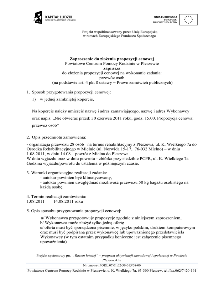 Projekt współfinansowany przez Unię Europejską w ramach Europejskiego Funduszu Społecznego Zaproszenie do złożenia propozycji cenowej Powiatowe Centrum Pomocy Rodzinie w Pleszewie zaprasza do złożenia propozycji cenowej na wykonanie zadania: przewóz osób (na podstawie art. 4 pkt 8 ustawy − Prawo zamówień publicznych) 1. Sposób przygotowania propozycji cenowej: 1) w jednej zamkniętej kopercie, Na kopercie należy umieścić nazwę i adres zamawiającego, nazwę i adres Wykonawcy oraz napis: „Nie otwierać przed: 30 czerwca 2011 roku, godz. 15.00. Propozycja cenowa: przewóz osób” 2. Opis przedmiotu zamówienia: - organizacja przewozu 28 osób na turnus rehabilitacyjny z Pleszewa, ul. K. Wielkiego 7a do Ośrodka Rehabilitacyjnego w Mielnie (ul. Norwida 15-17, 76-032 Mielno) – w dniu 1.08.2011, w dniu 14.08 – powrót z Mielna do Pleszewa. W dniu wyjazdu oraz w dniu powrotu - zbiórka przy siedzibie PCPR, ul. K. Wielkiego 7a Godzina wyjazdu/powrotu do ustalenia w późniejszym czasie. 3. Warunki organizacyjne realizacji zadania: - autokar powinien być klimatyzowany, - autokar powinien uwzględniać możliwość przewozu 50 kg bagażu osobistego na każdą osobę. 4. Termin realizacji zamówienia: 1.08.2011 14.08.2011 roku 5. Opis sposobu przygotowania propozycji cenowej: a/ Wykonawca przygotowuje propozycję zgodnie z niniejszym zaproszeniem, b/ Wykonawca może złożyć tylko jedną ofertę c/ oferta musi być sporządzona pisemnie, w języku polskim, drukiem komputerowym oraz musi być podpisana przez wykonawcę lub upoważnionego przedstawiciela Wykonawcy (w tym ostatnim przypadku konieczne jest załączenie pisemnego upoważnienia) Projekt systemowy pn. „Razem łatwiej” – program aktywizacji zawodowej i społecznej w Powiecie Pleszewskim Nr umowy: POKL.07.01.02-30-015/08-00 Powiatowe Centrum Pomocy Rodzinie w Pleszewie, u. K. Wielkiego 7a, 63-300 Pleszew, tel./fax.062/7420-161 d/ wszystkie miejsca, w których Wykonawca naniósł zmiany powinny być parafowane przez Wykonawcę, e/ propozycja cenowa musi być sporządzona na formularzu ofertowym, którego wzór przedstawiono w załączniku do niniejszego zaproszenia, f/ do propozycji cenowej muszą być załączone wszystkie dokumenty wymagane odpowiednimi postanowieniami punktu 7, podpisane przez Wykonawcę lub upoważnionego przedstawiciela g/ cena musi być wyrażona słownie oraz cyfrowo h/ Wykonawca ponosi wszystkie koszty związane z przygotowaniem i złożeniem oferty 6. Oferta musi zawierać następujące dokumenty: a/ wypełniony i podpisany formularz ofertowy, którego wzorzec stanowi załącznik nr 1 do niniejszego zaproszenia, b/ oświadczenie Wykonawcy – załącznik nr 2 c/kopia aktualnej licencji na wykonywanie krajowego transportu drogowego (potwierdzona za zgodność z oryginałem), d/ kopia aktualnego odpisu z właściwego rejestru lub zaświadczenia o wpisie do ewidencji działalności gospodarczej (potwierdzona za zgodność z oryginałem) e/ kopia polisy OC i NW lub innego dokumentu potwierdzającego, że Wykonawca jest ubezpieczony od odpowiedzialności cywilnej pojazdów drogowych (potwierdzona za zgodność z oryginałem) f/ Oświadczenie o spełnieniu wymogów organizacyjnych określonych w pkt 3 niniejszego zaproszenia 7. Termin i miejsce złożenia propozycji cenowej: Oferty należy złożyć w terminie do dnia 27 czerwca 2011 r., do godz. 15.00 w siedzibie zamawiającego: ul. K. Wielkiego 7a, 63-300 Pleszew (Sekretariat) 8. Osobą uprawnioną do kontaktów z wykonawcami są: p. Ewelina Grygiel, pok. nr 4, tel. 062/7420-162, [email protected], fax. 062/7420-161 p. Małgorzata Szeląg – 062/7420-161 9. Miejsce i termin otwarcia propozycji cenowych: Otwarcie propozycji cenowych nastąpi w dniu 27 czerwca 2011 r., o godz. 15.30 w siedzibie zamawiającego: ul. K. Wielkiego 7a, 63-300 Pleszew (pokój nr 6). Otwarcie ofert jest jawne. Podczas otwierania kopert z ofertami Zamawiający ogłosi nazwy Wykonawców i ich adresy, ceny ofertowe. 10. Opis sposobu obliczania ceny i kryterium wyboru oferty: Rozliczenia między Zamawiającym a Wykonawcą będą prowadzone w PLN. Projekt systemowy pn. „Razem łatwiej” – program aktywizacji zawodowej i społecznej w Powiecie Pleszewskim Nr umowy: POKL.07.01.02-30-015/08-00 Powiatowe Centrum Pomocy Rodzinie w Pleszewie, u. K. Wielkiego 7a, 63-300 Pleszew, tel./fax.062/7420-161 Wykonawca zobowiązany jest sporządzić kosztorys ofertowy z uwzględnieniem wszystkich elementów mających wpływ na cenę zgodnie z w/w przedmiotem zamówienia. Do wartości netto należy doliczyć podatek VAT. Ostateczną cenę oferty stanowi suma wartości brutto kosztorysu ofertowego. Wszystkie ceny określone przez Wykonawcę zostaną ustalone na okres ważności umowy i nie będą podlegały zmianom. Zamawiający dokona wyboru oferty najkorzystniejszej w oparciu o kryterium CENA. 11. Informacje dotyczące zawierania umowy: Niezwłocznie po wyborze najkorzystniejszej propozycji cenowej zamawiający wyśle do wykonawcy zamówienie/zlecenie/umowę w sprawie zamówienia publicznego. 12. Istotne postanowienia, które zostaną wprowadzone do treści umowy: Płatność za realizację zadania nastąpi po otrzymaniu środków z Instytucji Pośredniczącej, tj. Wojewódzkiego Urzędu Pracy w Poznaniu i nastąpi nie później niż do 31.12.2011 roku. .………………………… [przygotował] ........……………………..………… [podpisał w imieniu zamawiającego] W załączeniu: 1. Wzór formularza oferty 2. Oświadczenie Wykonawcy 3. Oświadczenie o spełnieniu wymogów organizacyjnych Projekt systemowy pn. „Razem łatwiej” – program aktywizacji zawodowej i społecznej w Powiecie Pleszewskim Nr umowy: POKL.07.01.02-30-015/08-00 Powiatowe Centrum Pomocy Rodzinie w Pleszewie, u. K. Wielkiego 7a, 63-300 Pleszew, tel./fax.062/7420-161