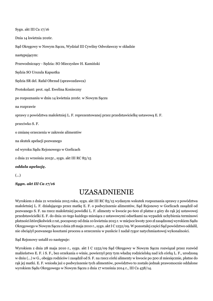 Sygn. akt III Ca 17/16 Dnia 14 kwietnia 2016r. Sąd Okręgowy w Nowym Sączu, Wydział III Cywilny Odwoławczy w składzie następującym: Przewodniczący - Sędzia: SO Mieczysław H. Kamiński Sędzia SO Urszula Kapustka Sędzia SR del. Rafał Obrzud (sprawozdawca) Protokolant: prot. sąd. Ewelina Konieczny po rozpoznaniu w dniu 14 kwietnia 2016r. w Nowym Sączu na rozprawie sprawy z powództwa małoletniej L. F. reprezentowanej przez przedstawicielkę ustawową E. F. przeciwko S. F. o zmianę orzeczenia w zakresie alimentów na skutek apelacji pozwanego od wyroku Sądu Rejonowego w Gorlicach z dnia 21 września 2015r., sygn. akt III RC 85/15 oddala apelację. (...) Sygn. akt III Ca 17/16 UZASADNIENIE Wyrokiem z dnia 21 września 2015 roku, sygn. akt III RC 85/15 wydanym wskutek rozpoznania sprawy z powództwa małoletniej L. F. działającego przez matkę E. F. o podwyższenie alimentów, Sąd Rejonowy w Gorlicach zasądził od pozwanego S. F. na rzecz małoletniej powódki L. F. alimenty w kwocie po 600 zł płatne z góry do rąk jej ustawowej przedstawicielki E. F. do dnia 10-tego każdego miesiąca z ustawowymi odsetkami na wypadek uchybienia terminowi płatności którejkolwiek z rat, począwszy od dnia 10 kwietnia 2015 r. w miejsce kwoty 500 zł zasądzonej wyrokiem Sądu Okręgowego w Nowym Sączu z dnia 28 maja 2010 r., sygn. akt I C 1252/09. W pozostałej części Sąd powództwo oddalił, nie obciążył pozwanego kosztami procesu a orzeczeniu w punkcie I nadał rygor natychmiastowej wykonalności. Sąd Rejonowy ustalił co następuje: Wyrokiem z dnia 28 maja 2010 r., sygn. akt I C 1252/09 Sąd Okręgowy w Nowym Sączu rozwiązał przez rozwód małżeństwo E. F. i S. F., bez orzekania o winie, powierzył przy tym władzę rodzicielską nad ich córką L. F., urodzoną w dniu (...) w G., obojgu rodziców i zasądził od S. F. na rzecz córki alimenty w kwocie po 500 zł miesięcznie, płatne do rąk jej matki. E. F. wniosła już o podwyższenie tych alimentów, powództwo to zostało jednak prawomocnie oddalone wyrokiem Sądu Okręgowego w Nowym Sączu z dnia 17 września 2014 r., III Ca 438/14. Bezspornym było, że S. F. regularnie opłaca zasądzone alimenty. Kontakty między L. F. a jej rodzicami zostały uregulowane na mocy ugody sądowej z 8 listopada 2011 r. L. F. była ostatnio w miejscu zamieszkania ojca przy okazji Świąt Bożego Narodzenia w 2014 r., od tego czasu kontaktuje się z ojcem telefonicznie, widziała się z dnia zaś przy okazji dnia kobiet na wiosnę 2015 roku. Od września 2015 r. L. F. chodzi do piątej klasy szkoły podstawowej, w nowym roku szkolnym uczęszcza przy tym na zajęcia pozalekcyjne z siatkówki (zajęcia te wymagają zakupu stroju, ochraniaczy, torby, ponadto należy za nie zapłacić 50 zł raz na pół roku i 20 zł miesięcznie), języka angielskiego (płatne 45 w tygodniu), plastyki (na które należy zakupić akcesoria), oraz nieregularnie, w zależności od pogody i chęci dziecka, na zajęcia jazdy konnej (w R., do którego dojazd kosztuje 30 zł, zaś sama jazda 25 zł). Dziecko szybko rośnie, z tego powodu wymaga wymiany garderoby butów i ubrań przynajmniej raz do roku. L. zaczyna miesiączkować, wymaga więc: zakupu odpowiednich artykułów higienicznych, poza tym potrzebuje kosmetyków odpowiednich do swojego wieku. Dziewczynka czasem spotyka się ze znajomymi, wychodzi z nimi na pizzę, raz lub dwa razy do roku jeździ na zagraniczne wakacje z dziadkami od strony matki - dziadkowie finansują takie wyjazdy, zaś matka daje dziewczynce kieszonkowe rzędu 100-150 dolarów. Ojciec lub jego krewni przekazują L. prezenty z okazji urodzin czy świąt. S. F. zabierał córkę na wycieczki do N., L. i K.. Łączny koszt utrzymania L. F., w tym koszty wyżywienia, utrzymania domu w którym mieszka wraz z matką, wynosi ok. 1.200 zł miesięcznie. Nie było sporu co do tego, że S. F. pracuje jako cywilny pracownik Komendy Powiatowej Policji w G. i otrzymuje wynagrodzenie w kwocie 1.883,99 zł netto. Ponadto posiada on uprawnienia z zakresu BHP i zdarzało się, że prowadził w tym zakresie szkolenia w innych firmach. Do grudnia 2015r. miał on podpisaną umowę na tego typu usługi i otrzymuje z tego tytułu dodatkowo 800 zł miesięcznie. Z kolei E. F. pracuje na pół etatu w (...) (...) w G. i otrzymuje wynagrodzenie w kwocie 920 zł plus dodatek stażowy, przy czym wraz z nadgodzinami zarabia ona 1.300-1.400 zł miesięcznie. Dokonując powyższych ustaleń Sąd I instancji zaznaczył, że w większości okoliczności faktyczne były bezsporne. W zakresie usprawiedliwionych potrzeb małoletniej oraz kosztów jej aktualnego utrzymania oparł się na zeznaniach stron i świadków a także pomocniczo na przedstawionych w sprawie dokumentach, w tym paragonach i fakturach. Wskazał również, że dokonał ustaleń w zakresie tego kto i w jakiej części sfinansował remont pokoju dziecka, a także całego mieszkania, w którym mieszkały strony, gdyż nie ma to bezpośredniego związku z niniejszą sprawą, która dotyczy aktualnych potrzeb L. F. i możliwości zarobkowych jej rodziców - wspomniany remont miał zaś miejsce jeszcze przed rozwodem stron. W oparciu o ustalony stan faktyczny Sąd Rejonowy stwierdził, że wysokość alimentów zasądzonych wyrokiem z dnia 28 maja 2010 r. na kwotę po 500 zł miesięcznie nie odpowiada już prawu (art. 133 § 1 kro) jako nieadekwatna do potrzeb małoletniej powódki. Stwierdzona w ten sposób zmiana stosunków majątkowych (art. 138 kro), także w stosunku do ostatniego orzeczenia w przedmiocie alimentów, to jest od wyroku Sądu Okręgowego w Nowym Sączu z dnia 17 września 2014 r., kiedy to zostało prawomocnie oddalone powództwo o podwyższenie alimentów, legła u podstaw częściowego uwzględnienia przez Sąd roszczeń strony powodowej i zasądzenia od pozwanego na rzecz dziecka alimentów w kwocie po 600 zł miesięcznie począwszy od dnia 10 w kwietnia 2015 roku. W mot