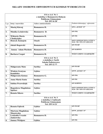 SKŁADY OSOBOWE OBWODOWYCH KOMISJI WYBORCZYCH L.p. Imię i nazwisko O b w ó d Nr 1 z siedzibą w Romanowie Dolnym Publiczne Gimnazjum Tel. 255 16 20 Adres zamieszkania Podmiot dokonujący zgłoszenia 1. Maciej Kieruj Romanowo D. KWw „KUKIZ’ 15” 3. Monika Leśniewska Romanowo D. KW PSL 4. Romanowo D. KW PiS 5. Wiktoria Maria Chodzyńska Henryk Źamojcin Osuch KKW ZJEDNOCZONA LEWICA SLD+ TR+ PPS+UP+ZIELONI 6. Jakub Rogowski Romanowo D. KW PO RP 7. Janusz Adam Piechota Romanowo D. KW KORWiN 8. Barbara Czeguś Romanowo D. WÓJT GMINY CZARNKÓW O b w ó d Nr 2 z siedzibą w Sarbi Szkoła Podstawowa Tel. 255 12 77 1. Małgorzata Matz Sarbka KW PO RP 2. Gębice KWW „KUKIZ’ 15” 3. Wioleta Grażyna Kamińska Małgorzata Kotasa Romanowo G. KW PSL 4. Anna Maria Szuta Sarbka KW PiS 5. Sabina Przewdzięk Sarbka KW KORWiN 6. Bogusława Magdalena Spicker Gębice KKW ZJEDNOCZONA LEWICA SLD+ TR+ PPS+UP+ZIELONI 7. Renata Sikora Sarbka WÓJT GMINY CZARNKÓW O b w ó d Nr 3 z siedzibą w Gębicach Publiczne Gimnazjum Tel. 255 14 21 1. Renata Fąferek Gębice KW PO RP 2. Martyna Magdalena Maszewska Leokadia Urszula Jankowska Janusz Wielgosz Gębice KWW „KUKIZ’ 15” Romanowo D. KW PSL Gębice KW PiS 3. 4. SKŁADY OSOBOWE OBWODOWYCH KOMISJI WYBORCZYCH 5. Iwona Teresa Kitcza Paliszewo 6. Emilia Grochowska Romanowo D. 7. Alina Magdalena Lewandowska Czarnków KKW ZJEDNOCZONA LEWICA SLD+ TR+ PPS+UP+ZIELONI WÓJT GMINY CZARNKÓW UZUPEŁNIENIE WÓJT GMINY CZARNKÓW O b w ó d Nr 4 z siedzibą w Hucie Szkoła Podstawowa Tel. 255 13 17 1. Remigiusz Molski Huta KW PSL 2. Danuta Wielgosz Gębice KWW „ KUKIZ’ 15 ” 3. Katarzyna Maria Szulc Huta KW PiS 4. Anna Rybińska Huta 5. Justyna Kaźmierczak Jędrzejewo KW ZJEDNOCZONA LEWICA SLD+ TR+ PPS+UP+ZIELONI KW KORWiN 6. Aneta Jaworska Sarbia KW PO RP 7. Grażyna Maria Stochaj Brzeźno 1. WÓJT GMINY CZARNKÓW O b w ó d Nr 5 z siedzibą w Śmieszkowie Szkoła Podstawowa Tel. 255 10 26 Śmieszkowo KW PO RP Śmieszkowo KW PSL Huta KWW „KUKIZ’15” 2. Barbara Jolanta Zawadzka Ryszard Banachowicz 3. Anna Wolniewicz 4. Dominik Kitcza- Spicker Paliszewo KW ZJEDNOCZONA LEWICA SLD+ TR+ PPS+UP+ZIELONI 5. Urszula Stachowska Sarbia KW PiS 6. Halina Maria Nowak Śmieszkowo KW KORWiN 7. Małgorzata Zborowska Śmieszkowo WÓJT GMINY CZARNKÓW SKŁADY OSOBOWE OBWODOWYCH KOMISJI WYBORCZYCH O b w ó d Nr 6 z siedzibą w Ciszkowie ul. Lipowa 7 Tel. 735 017 848 Kuźnica Czarnkowska KW PO RP 2. Magdalena Joanna Andrzejewska Małgorzata Woźniak Ciszkowo KW PSL 3. Henryka Irena Tecław Radosiew KW PiS 4. Artur Paweł Wyrwa Ciszkowo KW KORWiN 5. Goraj -Zamek KKW ZJEDNOCZONA LEWICA SLD+ TR+ PPS+UP+ZIELONI 6. Andrzej Mieczysław Przesłański Wiesława Jadwiga Mac Marunowo KWW „ KUKIZ’15” 7. Paulina Bukowska Marunowo 1. Genowefa Rybarczyk O b w ó d Nr 7 z siedzibą w Jędrzejewie Zespół Szkół Tel. 256 35 08 Średnica KW PO RP 2. Karolina Szutkowska Średnica KW PSL 3. Zofia Chestkowska Jędrzejewo KW PiS 4. Kamila Grot Bukowiec KWW „ KUKIZ’ 15” 5. Dorota Anna Trzeźwińska Jędrzejewo KKW ZJEDNOCZONA LEWICA SLD+ TR+ PPS+UP+ZIELONI 6. Alicja Barłożek Jędrzejewo KW KORWIN 7. Sławomir Szymański Jędrzejewo 1. 1. 2. 3. Dorota Małgorzata Naplocha Wiesław Hryncewicz Andrzej Stanisław Walczyk WÓJT GMINY CZARNKÓW WÓJT GMINY CZARNKÓW O b w ó d Nr 8 z siedzibą w Gajewie 51 sala wiejska Tel. 600 542 407 Romanowo D. KW PO RP Gajewo KW PSL Jędrzejewo KW PiS SKŁADY OSOBOWE OBWODOWYCH KOMISJI WYBORCZYCH 4. Sandra Magdalena Chaińska Gajewo KW KORWiN 5. Jan Pawlak Bukowiec KKW ZJEDNOCZONA LEWICA SLD+ TR+ PPS+UP+ZIELONI 6. Radosław Łukasz Kosmowski Teresa Kina Gębice KWW „KUKIZ’ 15” 7. Gajewo WÓJT GMINY CZARNKÓW O b w ó d Nr 9 z siedzibą w Kuźnicy Czarnkowskiej Zespół Szkół Tel. 255 05 29 Kuźnica Czarnkowska, KW PO RP 2. Jacek Krzysztof Pietraszak Helena Piątek Kuźnica Czarnkowska KW PSL 3. Maria Zofia Pawłowska Radolinek KW PiS 4. Agnieszka Lachowicz Kuźnica Czarnkowska KWW „KUKIZ’15” 5. Monika Czerniak Zofiowo KKW ZJEDNOCZONA LEWICA SLD+ TR+ PPS+UP+ZIELONI 6. Malwina Tecław Radosiew WÓJT GMINY CZARNKÓWUZUPEŁNIENIE 7. Anna Renata Kulak Kuźnica Czarnkowska 1. Szymon Mac O b w ó d Nr 10 z siedzibą w Romanowie Górnym Szkoła Podstawowa Te. 255 16 29 Marunowo KWW „KUKIZ’15” 2. Honorata Matz Romanowo D. KW PSL 3. Karolina Frąckowiak Romanowo G. KKW ZJEDNOCZONA LEWICA SLD+ TR+ PPS+UP+ZIELONI 4. Dorota Piechota Romanowo D. KW KORWiN 5. Michał Towpik Kuźnica Czarnkowska KW PiS 6. Marcin Matz Sarbia KW PO RP 7. Małgorzata Dreczka Romanowo D. WÓJT GMINY CZARNKÓW 1. WÓJT GMINY CZARNKÓW SKŁADY OSOBOWE OBWODOWYCH KOMISJI WYBORCZYCH O b w ó d Nr 11 z siedzibą w Brzeźnie Budynek byłej szkoły podstawowej Tel. 255 19 11 Sarbka KW PO RP 2. Jerzy Hubert Przychodniak Przemysław Zawadzki Brzeźno KW PSL 3. Ewa Deuter Zofiowo KW PiS 4. Dorota Kamińska Brzeźno KWW „KUKIZ’15” 5. Barbara Chyży Śmieszkowo KKW ZJEDNOCZONA LEWICA SLD+ TR+ PPS+UP+ZIELONI 6. Agnieszka Kawczyńska Elżbieta Zawadzka Brzeźno KW KORWiN Brzeźno WÓJT GMINY CZARNKÓW 1. 7.