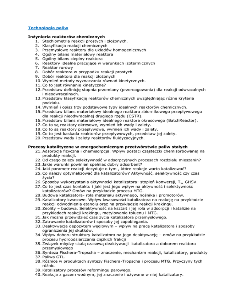 Technologia paliw Inżynieria reaktorów chemicznych 1. Stechiometria reakcji prostych i złożonych. 2. Klasyfikacja reakcji chemicznych 3. Przemysłowe reaktory dla układów homogenicznych 4. Ogólny bilans materiałowy reaktora 5. Ogólny bilans cieplny reaktora 6. Reaktory idealne pracujące w warunkach izotermicznych 7. Reaktor rurowy 8. Dobór reaktora w przypadku reakcji prostych 9. Dobór reaktora dla reakcji złożonych 10. Wymień metody wyznaczania równań kinetycznych. 11. Co to jest równanie kinetyczne? 12. Przedstaw definicję stopnia przemiany (przereagowania) dla reakcji odwracalnych i nieodwracalnych. 13. Przedstaw klasyfikację reaktorów chemicznych uwzględniając różne kryteria podziału. 14. Wymień i opisz trzy podstawowe typy idealnych reaktorów chemicznych. 15. Przedstaw bilans materiałowy idealnego reaktora zbiornikowego przepływowego dla reakcji nieodwracalnej drugiego rzędu (CSTR). 16. Przedstaw bilans materiałowy idealnego reaktora okresowego (BatchReactor). 17. Co to są reaktory okresowe, wymień ich wady i zalety. 18. Co to są reaktory przepływowe, wymień ich wady i zalety. 19. Co to jest kaskada reaktorów przepływowych, przedstaw jej zalety. 20. Przedstaw wady i zalety reaktorów fluidyzacyjnych. Procesy katalityczne w energochemicznym przetwórstwie paliw stałych 21. Adsorpcja fizyczna i chemisorpcja. Wpływ postaci cząsteczki chemisorbowanej na produkty reakcji. 22. Od czego zależy selektywność w adsorpcyjnych procesach rozdziału mieszanin? 23. Jakie warunki powinien spełniać dobry adsorbent? 24. Jaki parametr reakcji decyduje o tym , które reakcje warto katalizować? 25. Co należy optymalizować dla katalizatorów? Aktywność, selektywność czy czas życia? 26. Sposoby wykorzystania aktywności katalizatora: stopień konwersji, T x, GHSV. 27. Co to jest czas kontaktu i jaki jest jego wpływ na aktywność i selektywność katalizatorów? Omów na przykładzie procesu MTG. 28. Budowa katalizatora- rola materiału aktywnego, nośnika i promotorów. 29. Katalizatory kwasowe. Wpływ kwasowości katalizatora na reakcję na przykładzie reakcji odwodnienia etanolu oraz na przykładzie reakcji krakingu. 30. Zeolity – budowa. Selektywność na kształt i jej rola w adsorpcji i katalizie na przykładach reakcji krakingu, metylowania toluenu i MTG. 31. Jak można przewidzieć czas życia katalizatora przemysłowego. 32. Zatruwanie katalizatorów i sposoby jej zapobiegania. 33. Deaktywacja depozytem węglowym – wpływ na pracę katalizatora i sposoby ograniczenia jej skutków. 34. Wpływ doboru struktury katalizatora na jego deaktywację – omów na przykładzie procesu hydroodsiarczania ciężkich frakcji 35. Związek między skalą czasową deaktywacji katalizatora a doborem reaktora przemysłowego 36. Synteza Fischera-Tropscha – znaczenie, mechanizm reakcji, katalizatory, produkty 37. Paliwa GTL. 38. Różnice w produktach syntezy Fischera-Tropscha i procesu MTG. Przyczyny tych różnic. 39. Katalizatory procesów reformingu parowego. 40. Reakcja z gazem wodnym, jej znaczenie i używane w niej katalizatory. Nowoczesne technologie węglowe i biomasowe 41. Geneza złóż węglowych 42. Zalety biomasy jako paliwa stałego, na czym polega proces fotosyntezy 43. Wykazać różnice między procesem spalania i pirolizy paliwa stałego 44. Definicja ciepła spalania i wartości opałowej paliwa stałego, od czego zależą wartości tych parametrów 45. Na czym polega spalanie całkowite i zupełne 46. Co to jest współczynnik nadmiaru powietrza i jaka jest jego rola w procesie spalania 47. Na czym polega analiza techniczna paliwa stałego 48. Na czym polega analiza elementarna węgla 49. W jaki sposób można ocenić stopień uwęglenia paliwa stałego 50. Omówić polską klasyfikacją węgla kamiennego wg typów i sortymentów 51. Od czego zależy temperatura topliwości popiołu, omówić znaczenie temperatury topliwości popiołu w procesach spalania i zgazowania 52. Porównać węgiel i biomasę jako surowce energetyczne 53. Omówić podstawowe sposoby waloryzacji właściwości energetycznych biomasy 54. Opisać przebieg procesu spalania cząstki biomasy. 55. Omówić schematy technologiczne współspalania węgla i biomasy 56. Koncepcja technologiczna koksowni dwuproduktowej 57. Omówić podstawowe reakcje chemiczne w procesie zgazowania węgla 58. Podział reaktorów zgazowania paliw stałych 59. Charakterystyka złoża fluidalnego 60. Na czym polega spalanie paliwa w warunkach nadkrytycznych i ultranadkrytycznych Technologia wyrobów węglowych i grafitowych 61. Odmiany alotropowe pierwiastka „C”, 62. Co to jest mezofaza ? 63. Z czego produkujemy koks elektrodowy ? 64. Różnica pomiędzy koksem „Regular” i „Premium”, 65. Co to jest kalcynacja? 66. Udział lepiszcza w suchym zestawie do produkcji mas elektrodowych, 67. Metody wypalania wyrobów, 68. Różnica pomiędzy wyrobami węglowymi i grafitowymi, 69. Co to jest grafityzacja ? 70. Jak długo trwa proces grafityzacji a jak długo grzanie prądowe ? 71. Do czego służy nasycanie ? 72. Co oznacza EGHW ? 73. Do czego służy impregnacja ? 74. Jak łączy się elektrody w kolumny ? 75. Jakie jest zużycie grafitu w elektrycznych piecach łukowych na 1 tonę stali ? Paliwa ciekłe: konwencjonalne i biopaliwa 76. Zasady komponowania paliw ciekłych. 77. Węglowodorowe i nie węglowodorowe komponenty benzyn. 78. Addytywne i nieaddytywne właściwości benzyn samochodowych 79. Parametry charakteryzujące lotność benzyn. 80. Klimatyczne kryteria podziału benzyn na klasy. 81. Liczba oktanowa: RON i MON 82. Wpływ struktury węglowodorów na liczbę oktanową. 83. Sposoby podwyższenia liczby oktanowej benzyn. 84. Organiczne związki tlenowe obecne w benzynach. 85. Wpływ bioetanolu na właściwości benzyn. 86. Surowce i procesy wytwarzania bioetanolu pierwszej generacji. 87. Liczba cetanowa oraz indeks cetanowy olejów napędowych. 88. Klimatyczne wymagania dla o