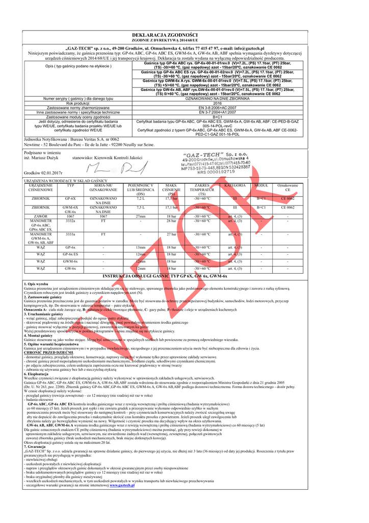 DEKLARACJA ZGODNOŚCI ZGODNIE Z DYREKTYWĄ 2014/68/UE „GAZ-TECH” sp. z o.o., 49-200 Grodków, ul. Otmuchowska 4, tel/fax 77 415 47 97, e-mail: [email protected] Niniejszym poświadczamy, że gaśnica przenośna typ: GP-6x ABC, GP-6x ABC ES, GWM-6x A, GW-6x AB, ABF spełnia wymagania dyrektywy dotyczącej urządzeń ciśnieniowych 2014/68/UE i jej transpozycji krajowej. Deklaracja ta została wydana na wyłączną odpowiedzialność producenta. Opis ( typ gaśnicy podano na etykiecie ) Numer seryjny ( gaśnicy ) dla danego typu Rok produkcji: Zastosowane normy zharmonizowane Inne zastosowane normy i specyfikacje techniczne Zastosowane moduły oceny zgodności Jeśli dotyczy, odniesienie do certyfikatu badania typu WE/UE, certyfikatu badania projektu WE/UE lub certyfikatu zgodności WE/UE Gaśnica typ GP-6x ABC rys. GP-6x-00-01-01rev.0 (V)=7.2L, (PS) 17.1bar, (PT) 25bar, (TS) -30/+60 ºC, (gaz napędowy) azot - 15bar/20ºC, oznakowanie CE 0062 Gaśnica typ GP-6x ABC ES rys. GP-6x-00-01-02rev.0 (V)=7.2L, (PS) 17.1bar, (PT) 25bar, (TS) -30/+60 ºC, (gaz napędowy) azot - 15bar/20ºC, oznakowanie CE 0062 Gaśnica typ GWM-6x A rys. GWM-6x-00-01-01rev.0 (V)=7.5L, (PS) 17.1bar, (PT) 25bar, (TS) +5/+60 ºC, (gaz napędowy) azot - 15bar/20ºC, oznakowanie CE 0062 Gaśnica typ GW-6x AB, ABF rys.GW-6x-00-01-01rev.0 (V)=7.5L, (PS) 17.1bar, (PT) 25bar, (TS) 0/+60 ºC, (gaz napędowy) azot - 15bar/20ºC, oznakowanie CE 0062 OZNAKOWANO NA DNIE ZBIORNIKA 2016 EN 3-8:2006+AC:2007 EN 3-7:2004+A1:2007 B+C1 Certyfikat badania typu GP-6x ABC, GP-6x ABC ES, GWM-6x A, GW-6x AB, ABF: CE-PED-B-GAZ 005-14-POL-revC Certyfikat zgodności z typem GP-6x ABC, GP-6x ABC ES, GWM-6x A, GW-6x AB, ABF CE-0062PED-C1-GAZ 001-16-POL Jednostka Notyfikowana : Bureau Veritas S.A. nr 0062 Newtime - 52 Boulevard du Parc - Ile de la Jatte - 92200 Neuilly sur Seine. Podpisano w imieniu inż. Mariusz Dużyk stanowisko: Kierownik Kontroli Jakości Grodków 02.01.2017r URZĄDZENIA WCHODZĄCE W SKŁAD GAŚNICY URZĄDZENIE TYP SERIA-NR/ CIŚNIENIOWE OZNAKOWANIE ZBIORNIK GP-6X ZBIORNIK GWM-6X GW-6x 1067 3332a OZNAKOWANO NA DNIE OZNAKOWANO NA DNIE 1067 FT 3333a ZAWÓR MANOMETR GP-6x ABC, GP6x ABC ES, MANOMETR GWM-6x A, GW-6x AB, ABF WĄŻ MAKS. CIŚNIENIE (PS) 17,1 bar ZAKRES TEMPERATUR (TS) -30/+60 ºC KATEGORIA MODUŁ Oznakowanie CE III B+C1 CE 0062 7,5 L 17,1 bar -30/+60 ºC III B+C1 CE 0062 27mm - 18 bar 28 bar -30/+60 ºC -30/+60 ºC art. 4, (3) art. 4, (3) - - FT - 27 bar -30/+60 ºC art. 4, (3) - - GP-6x - 13mm 18 bar -30/+60 ºC art. 4, (3) - - GWM-6x - 12mm 18 bar -30/+60 ºC art. 4, (3) - WĄŻ GP-6x ES WĄŻ GW-6x WĄŻ POJEMNOŚĆ V LUB ŚREDNICA (DN) 7,2 L - - 12mm 12mm 18 bar 18 bar -30/+60 ºC -30/+60 ºC INSTRUKCJA OBSŁUGI GAŚNIC TYP GP 6X, GW 6x, GWM-6x art. 4, (3) art. 4, (3) - - - - 1. Opis wyrobu Gaśnica przenośna jest urządzeniem ciśnieniowym składającym się ze stalowego, spawanego zbiornika jako podstawowego elementu konstrukcyjnego i zaworu z rurką syfonową. Czynnikiem roboczym jest środek gaśniczy a czynnikiem napędowym azot (N). 2. Zastosowanie gaśnicy Gaśnica przenośna przeznaczona jest do gaszenia pożarów w zarodku. Może być stosowana do ochrony przeciwpożarowej budynków, samochodów, łodzi motorowych, przyczep kempingowych, itp. Do stosowania w zakresie temperatur – patrz etykieta Oznaczenia A- ciała stałe żarzące się, B- substancje ciekłe tworzące płomienie, C- gazy palne, F- tłuszcze i oleje w urządzeniach kuchennych 3. Uruchamianie gaśnicy - wziąć gaśnicę, zdjąć zabezpieczenie podejść do ognia- patrz etykieta - skierować prądownicę na źródło ognia i nacisnąć dźwignię, gasić powstałym strumieniem środka gaśniczego - gaśnicę stosować wyłącznie w pozycji pionowej, zaworem skierowanym ku górze Wyżej przedstawiony sposób użycia w postaci piktogramów i opisu znajduje się na etykiecie gaśnicy. 4. Montaż gaśnicy Gaśnice stosowane są jako wolno stojące. Mogą być umieszczone w specjalnych szafkach lub powieszone za pomocą odpowiedniego wieszaka. 5. Ogólne warunki bezpieczeństwa Gaśnica jest urządzeniem ciśnieniowym i w przypadku niewłaściwego, niezgodnego z jej przeznaczeniem użycia może być niebezpieczna dla zdrowia i życia. CHRONIĆ PRZED DZIEĆMI. - demontaż gaśnicy, przeglądy okresowe, konserwacje, naprawy mogą być wykonane tylko przez uprawnione zakłady serwisowe. - chronić gaśnicę przed niepożądanymi uszkodzeniami mechanicznymi, źródłami ciepła, szkodliwymi czynnikami chemicznymi. - po zdjęciu zabezpieczenia, celem uniknięcia zaprószenia oczu nie kierować prądownicy w stronę twarzy - zabrania się używania gaśnicy bez lub z nieczytelną etykietą 6. Eksploatacja Wszelkie czynności związane z eksploatacją gaśnicy należy wykonywać w uprawnionych zakładach usługowych, serwisowych. Gaśnica GP-6x ABC, GP-6x ABC ES, GWM-6x A, GW-6x AB,ABF została wdrożona do stosowania zgodnie z rozporządzeniem Ministra Gospodarki z dnia 21 grudnia 2005 (Dz. U. Nr 263, poz. 2200). Zbiornik gaśnicy GP-6x ABC,GP-6x ABC ES, GWM-6x A, GW-6x AB,ABF podlega dozorowi technicznemu. Forma dozoru technicznego - dozór pełny. W czasie eksploatacji należy wykonać: - przegląd gaśnicy (rewizja zewnętrzna) – co 12 miesięcy (nie rzadziej niż raz w roku) - badania okresowe GP-6x ABC, GP-6x ABC ES kontrola środka gaśniczego wraz z rewizją wewnętrzną i próbą ciśnieniową (badania wytrzymałościowe) co 60 miesięcy (5 lat). Jeżeli proszek jest sypki i nie zawiera grudek a przesypywanie wykonano odpowiednio szybko w suchym pomieszczeniu proszek może być stosowany do następnej kontroli – przy czynnościach konserwacyjnych należy zwrócić szczególną uwagę aby nie dopuścić do zawilgocenia proszku i maksymalnie skrócić czas kontaktu proszku z powietrzem. Jeżeli proszek uległ zawilgoceniu lub zbryleniu należy go bezwzględnie wymienić na nowy. Wilgotność i czystość proszku ma decydujący wpły