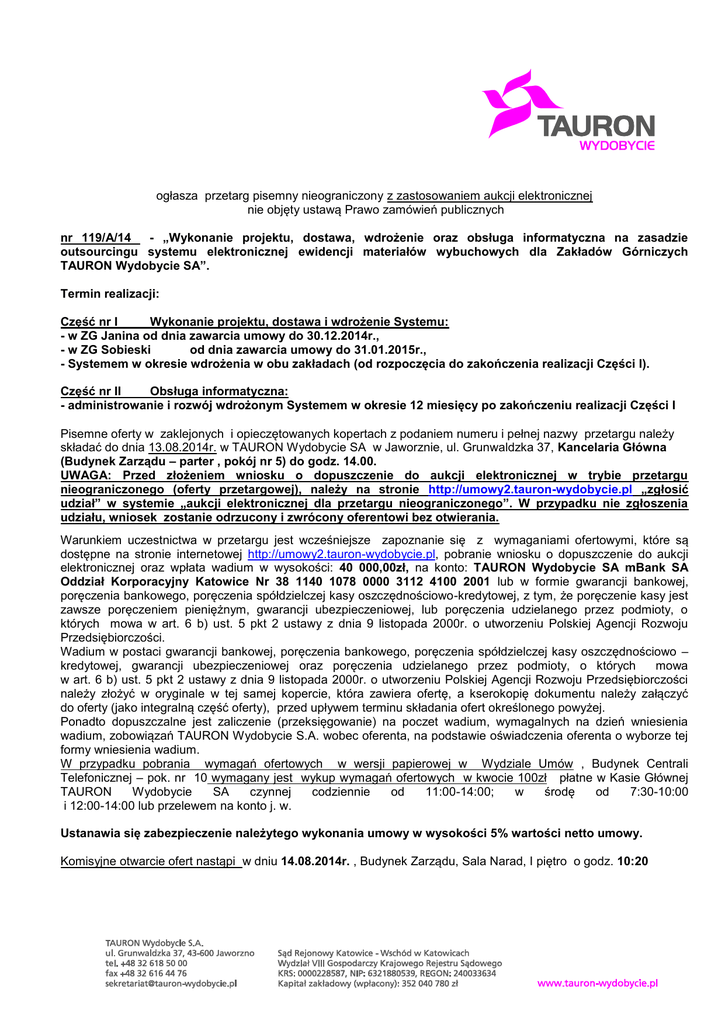 ogłasza przetarg pisemny nieograniczony z zastosowaniem aukcji elektronicznej nie objęty ustawą Prawo zamówień publicznych nr 119/A/14 - „Wykonanie projektu, dostawa, wdrożenie oraz obsługa informatyczna na zasadzie outsourcingu systemu elektronicznej ewidencji materiałów wybuchowych dla Zakładów Górniczych TAURON Wydobycie SA”. Termin realizacji: Część nr I Wykonanie projektu, dostawa i wdrożenie Systemu: - w ZG Janina od dnia zawarcia umowy do 30.12.2014r., - w ZG Sobieski od dnia zawarcia umowy do 31.01.2015r., - Systemem w okresie wdrożenia w obu zakładach (od rozpoczęcia do zakończenia realizacji Części I). Część nr II Obsługa informatyczna: - administrowanie i rozwój wdrożonym Systemem w okresie 12 miesięcy po zakończeniu realizacji Części I Pisemne oferty w zaklejonych i opieczętowanych kopertach z podaniem numeru i pełnej nazwy przetargu należy składać do dnia 13.08.2014r. w TAURON Wydobycie SA w Jaworznie, ul. Grunwaldzka 37, Kancelaria Główna (Budynek Zarządu – parter , pokój nr 5) do godz. 14.00. UWAGA: Przed złożeniem wniosku o dopuszczenie do aukcji elektronicznej w trybie przetargu nieograniczonego (oferty przetargowej), należy na stronie http://umowy2.tauron-wydobycie.pl „zgłosić udział” w systemie „aukcji elektronicznej dla przetargu nieograniczonego”. W przypadku nie zgłoszenia udziału, wniosek zostanie odrzucony i zwrócony oferentowi bez otwierania. Warunkiem uczestnictwa w przetargu jest wcześniejsze zapoznanie się z wymaganiami ofertowymi, które są dostępne na stronie internetowej http://umowy2.tauron-wydobycie.pl, pobranie wniosku o dopuszczenie do aukcji elektronicznej oraz wpłata wadium w wysokości: 40 000,00zł, na konto: TAURON Wydobycie SA mBank SA Oddział Korporacyjny Katowice Nr 38 1140 1078 0000 3112 4100 2001 lub w formie gwarancji bankowej, poręczenia bankowego, poręczenia spółdzielczej kasy oszczędnościowo-kredytowej, z tym, że poręczenie kasy jest zawsze poręczeniem pieniężnym, gwarancji ubezpieczeniowej, lub poręczenia udzielanego przez podmioty, o których mowa w art. 6 b) ust. 5 pkt 2 ustawy z dnia 9 listopada 2000r. o utworzeniu Polskiej Agencji Rozwoju Przedsiębiorczości. Wadium w postaci gwarancji bankowej, poręczenia bankowego, poręczenia spółdzielczej kasy oszczędnościowo – kredytowej, gwarancji ubezpieczeniowej oraz poręczenia udzielanego przez podmioty, o których mowa w art. 6 b) ust. 5 pkt 2 ustawy z dnia 9 listopada 2000r. o utworzeniu Polskiej Agencji Rozwoju Przedsiębiorczości należy złożyć w oryginale w tej samej kopercie, która zawiera ofertę, a kserokopię dokumentu należy załączyć do oferty (jako integralną część oferty), przed upływem terminu składania ofert określonego powyżej. Ponadto dopuszczalne jest zaliczenie (przeksięgowanie) na poczet wadium, wymagalnych na dzień wniesienia wadium, zobowiązań TAURON Wydobycie S.A. wobec oferenta, na podstawie oświadczenia oferenta o wyborze tej formy wniesienia wadium. W przypadku pobrania wymagań ofertowych w wersji papierowej w Wydziale Umów , Budynek Centrali Telefonicznej – pok. nr 10 wymagany jest wykup wymagań ofertowych w kwocie 100zł płatne w Kasie Głównej TAURON Wydobycie SA czynnej codziennie od 11:00-14:00; w środę od 7:30-10:00 i 12:00-14:00 lub przelewem na konto j. w. Ustanawia się zabezpieczenie należytego wykonania umowy w wysokości 5% wartości netto umowy. Komisyjne otwarcie ofert nastąpi w dniu 14.08.2014r. , Budynek Zarządu, Sala Narad, I piętro o godz. 10:20 Informacji udziela w sprawach: proceduralnych : Wydział Umów technicznych: Paweł Ciągło Krzysztof Palka Informatycznych: Henryk Kubica tel. (32) 618 51 08 /fax. ( 32) 618 5078/ tel. (32) 618 55 18 tel. (32) 627 05 18 tel. (32) 618 55 99