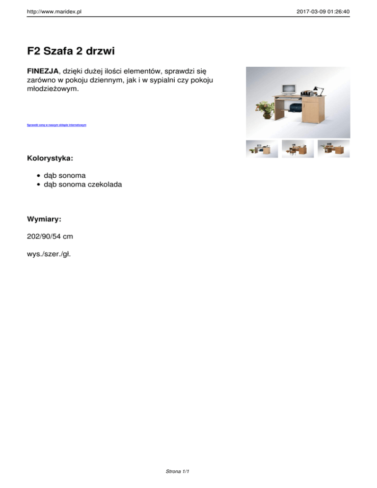 http://www.maridex.pl 2017-03-09 01:26:40 F2 Szafa 2 drzwi FINEZJA, dzięki dużej ilości elementów, sprawdzi się zarówno w pokoju dziennym, jak i w sypialni czy pokoju młodzieżowym. Sprawdź cenę w naszym sklepie internetowym Kolorystyka: dąb sonoma dąb sonoma czekolada Wymiary: 202/90/54 cm wys./szer./gł. Strona 1/1