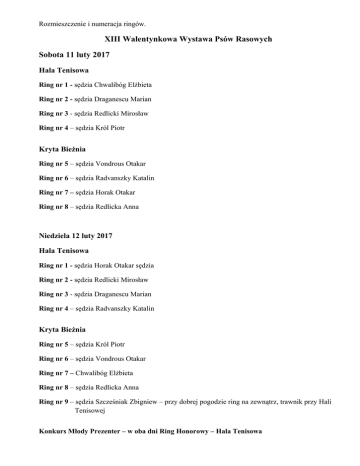 Rozmieszczenie i numeracja ringów. XIII Walentynkowa Wystawa Psów Rasowych Sobota 11 luty 2017 Hala Tenisowa Ring nr 1 - sędzia Chwalibóg Elżbieta Ring nr 2 - sędzia Draganescu Marian Ring nr 3 - sędzia Redlicki Mirosław Ring nr 4 – sędzia Król Piotr Kryta Bieżnia Ring nr 5 – sędzia Vondrous Otakar Ring nr 6 – sędzia Radvanszky Katalin Ring nr 7 – sędzia Horak Otakar Ring nr 8 – sędzia Redlicka Anna Niedziela 12 luty 2017 Hala Tenisowa Ring nr 1 - sędzia Horak Otakar sędzia Ring nr 2 - sędzia Redlicki Mirosław Ring nr 3 - sędzia Draganescu Marian Ring nr 4 – sędzia Radvanszky Katalin Kryta Bieżnia Ring nr 5 – sędzia Król Piotr Ring nr 6 – sędzia Vondrous Otakar Ring nr 7 – Chwalibóg Elżbieta Ring nr 8 – sędzia Redlicka Anna Ring nr 9 – sędzia Szcześniak Zbigniew – przy dobrej pogodzie ring na zewnątrz, trawnik przy Hali Tenisowej Konkurs Młody Prezenter – w oba dni Ring Honorowy – Hala Tenisowa VIII Nocna Wystawa Psów Rasowych Sobota 11 luty 2017 Hala Tenisowa Ring nr 1 – sędzia Pieczyńska Anna Ring nr 2 - sędzia Król Piotr Ring nr 3 – sędzia Kościańska Marta (później Ring Honorowy) Ring nr 4 – sędzia Olszewski Jerzy Ring nr 5 – sędzia Draganescu Marian Sala Bokserska Ring nr 6 – sędzia Jaworska Aleksandra Hala Gier Ring nr 7 – sędzia Lorenc Małgorzata Ring nr 8 – sędzia Jedlińska Anna Ring nr 9 - sędzia Vondrous Otakar Kryta Bieżnia Ring nr 10 – sędzia Radvanszky Katalin Ring nr 11 – sędzia Redlicka Anna Ring nr 12 – sędzia Horak Otakar Ring nr 13 – sędzia Chwalibóg Elżbieta Ring nr 14 – sędzia Redlicki Mirosław Ring nr 15 – sędzia Gęsinowski Jarosław – przy dobrej pogodzie ring na zewnątrz, boisko przy wjeździe na obiekty CWZS „Zawisza”