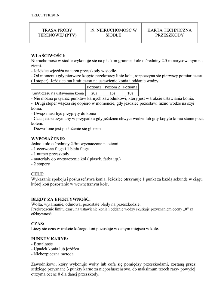 TREC PTTK 2016 TRASA PRÓBY TERENOWEJ (PTV) 19. NIERUCHOMOŚĆ W SIODLE KARTA TECHNICZNA PRZESZKODY WŁAŚCIWOŚCI: Nieruchomość w siodle wykonuje się na płaskim gruncie, kole o średnicy 2.5 m narysowanym na ziemi. - Jeździec wjeżdża na teren przeszkody w siodle. - Od momentu gdy pierwsze kopyto przekroczy linię koła, rozpoczyna się pierwszy pomiar czasu ( I stoper). Jeździec ma limit czasu na ustawienie konia i oddanie wodzy. Poziom1 Poziom 2 Poziom3 Limit czasu na ustawienie konia 20s 15s 10s - Nie można przyznać punktów karnych zawodnikowi, który jest w trakcie ustawiania konia. - Drugi stoper włącza się dopiero w momencie, gdy jeździec pozostawi luźno wodze na szyi konia. - Uwiąz musi być przypięty do konia - Czas jest zatrzymany w przypadku gdy jeździec chwyci wodze lub gdy kopyto konia stanie poza kołem. - Dozwolone jest posłużenie się głosem WYPOSAŻENIE: Jedno koło o średnicy 2.5m wyznaczone na ziemi. - 1 czerwona flaga i 1 biała flaga - 1 numer przeszkody - materiały do wyznaczenia kół ( piasek, farba itp.) - 2 stopery CELE: Wykazanie spokoju i posłuszeństwa konia. Jeździec otrzymuje 1 punkt za każdą sekundę w ciągu której koń pozostanie w wewnętrznym kole. BŁĘDY ZA EFEKTYWNOŚĆ: Wolta, wyłamanie, odmowa, pozostałe błędy na przeszkodzie. Przekroczenie limitu czasu na ustawienie konia i oddanie wodzy skutkuje przyznaniem oceny „0” za efektywność CZAS: Liczy się czas w trakcie którego koń pozostaje w danym miejscu w kole. PUNKTY KARNE: - Brutalność - Upadek konia lub jeźdźca - Niebezpieczna metoda Zawodnikowi, który wykonuje wolty lub cofa się pomiędzy przeszkodami, zostaną przez sędziego przyznane 3 punkty karne za nieposłuszeństwo, do maksimum trzech razy- powyżej otrzyma ocenę 0 dla danej przeszkody. TREC PTTK 2016 KARTA OCENY PRZESZKODY NIERUCHOMOŚĆ W SIODLE NR PRZESZKODY……………. SĘDZIA…………………………. NR START. E+ T- P= RAZEM Uwagi: SCHEMAT OCENIANIA : E+S-P EFEKTYWNOŚĆ E CZAS T PKT.KARNE P Poprawna ok 10 s 10 Brutalność -3 1 błąd -3 9s 9 Niebezpieczna metoda -3 2 błąd -6 8s 8 3 błąd 0 7s 6s 5s 4s itd… 1s 7 6 5 4 Przekroczenie limitu czasu na ustawienie konia i oddanie wodzy 0 Upadek 1 Punktacja 0 za efektywność lub za punkty karne oznacza całkowitą ocenę 0 za daną przeszkodę OK= 0 błędów za efektywność: brak ucieczki, brak cofania, brak odmowy, brak wolty -3 = 1 błąd: 1- ucieczka, 1-wyłamanie, etc. -6 = 2 błąd: 2- ucieczka, etc. 0 = 3 błąd: etc. 0= Przekroczenie limitu czasu na ustawienie konia i oddanie wodzy Te oceny należy wpisać w kratkę E w karcie oceny 0