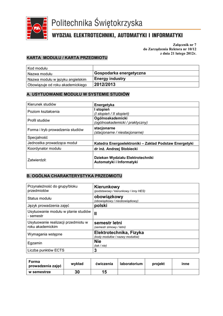 Załącznik nr 7 do Zarządzenia Rektora nr 10/12 z dnia 21 lutego 2012r. KARTA MODUŁU / KARTA PRZEDMIOTU Kod modułu Nazwa modułu Nazwa modułu w języku angielskim Obowiązuje od roku akademickiego Gospodarka energetyczna Energy industry 2012/2013 A. USYTUOWANIE MODUŁU W SYSTEMIE STUDIÓW Kierunek studiów Energetyka I stopień (I stopień / II stopień) Ogólnoakademicki (ogólnoakademicki / praktyczny) Poziom kształcenia Profil studiów Forma i tryb prowadzenia studiów Specjalność Jednostka prowadząca moduł Koordynator modułu stacjonarne (stacjonarne / niestacjonarne) Katedra Energoelektroniki – Zakład Podstaw Energetyki dr inż. Andrzej Stobiecki Dziekan Wydziału Elektrotechniki Automatyki i Informatyki Zatwierdził: B. OGÓLNA CHARAKTERYSTYKA PRZEDMIOTU Przynależność do grupy/bloku przedmiotów Kierunkowy Status modułu obowiązkowy Język prowadzenia zajęć polski Usytuowanie modułu w planie studiów - semestr II Usytuowanie realizacji przedmiotu w roku akademickim semestr letni Wymagania wstępne Elektrotechnika, Fizyka Egzamin Nie Liczba punktów ECTS 3 Forma prowadzenia zajęć w semestrze (podstawowy / kierunkowy / inny HES) (obowiązkowy / nieobowiązkowy) (semestr zimowy / letni) (kody modułów / nazwy modułów) (tak / nie) wykład ćwiczenia 30 15 laboratorium projekt inne C. EFEKTY KSZTAŁCENIA I METODY SPRAWDZANIA EFEKTÓW KSZTAŁCENIA Celem kształcenia jest zapoznanie studentów z procesami wykorzystania energii oraz podstawowymi przemianami energetycznymi jakie zachodzą w procesach przemysłowych. Cel Uzyskanie umiejętności w zakresie zasad budowy i przekształcania energii, sporządzania modułu bilansów energetycznych. Odrębnym problemem jest analiza kosztów użytkowania paliw i energii. (3-4 linijki) Symbol efektu W_01 W_02 W_03 W_04 U_01 U_02 K_01 K_02 Efekty kształcenia student, który zaliczył przedmiot: Ma podstawową i uporządkowaną wiedzę w zakresie gospodarki energetycznej i zasobów energii przydatną do formułowania i rozwiązywania zadań z zakresu studiowanego kierunku Ma podstawową i szczegółową wiedzę związaną z zasadami sporządzania bilansów energetycznych Powinien znać zasady gospodarowania energią, rozpoznawać przebiegi obciążeń systemów Ma wiedzę niezbędną do rozumienia technicznych i ekonomicznych aspektów gospodarki energetycznej Potrafi sporządzić bilans energetyczny dowolnego urządzenia lub obiektu Potrafi planować koszty energii dowolnego systemu energetycznego, obliczać koszty jednostkowe i wskaźniki zużycia energii Ma świadomość ważności zagadnień związanych z odpowiednim użytkowaniem i gospodarowaniem energią Jest świadomy wpływu energetyki na środowisko Forma odniesienie do odniesienie do prowadzenia efektów efektów zajęć kierunkowych obszarowych (w/ć/l/p/inne) W/Ć K_W18 W/Ć K_W18 W/Ć K_W18 W/Ć K_W18 W/Ć K_U15 W/Ć K_U15 W/Ć K_K01 K_K04 W/Ć K_K02 T1A_W01 T1A_W02 T1A_W03 T1A_W03 T1A_W04 T1A_W04 T1A_W05 T1A_W07 T1A_W05 T1A_U01 T1A_U08 T1A_U02 T1A_U09 T1A_U10 T1A_K01 T1A_K02 T1A_K04 T1A_K02 Treści kształcenia: 1. Treści kształcenia w zakresie wykładu konwersatoryjnego Nr wykładu Treści kształcenia 1 Zasoby energetyczne energii pierwotnej i struktura zużycia energii w kraju 2 Krajowy system energetyczny i jego podsystemy – paliw stałych, gazowy, elektroenergetyczny, cieplno-energetyczny, cz. 1 3 Krajowy system energetyczny i jego podsystemy – paliw stałych, gazowy, elektroenergetyczny, cieplno-energetyczny, cz. 2 4 Zasady sporządzania bilansów materiałowych i energetycznych 5 Energia i egzergia. Bilanse energetyczne i egzergetyczne. 6 Przebiegi obciążeń i charakterystyki energetyczne urządzeń. Odniesienie do efektów kształcenia dla modułu W_01 K_01 W_01 W_02 W_01 W_02 K_02 W_02 W_03 U_01 W_02 W_03 U_01 W_02 W_03 7 Rachunek ekonomiczny w energetyce. Koszty inwestycyjne i eksploatacyjne. 8 Zasady wyboru optymalnych parametrów technicznych i mocy urządzeń energetycznych. 9 Wskaźniki zużycia mocy i energii. Energochłonność skumulowana. 10 11 Skojarzona gospodarka cieplno-elektryczna. Koszty wytwarzania energii elektrycznej i ciepła. 12 Użytkowanie energii w ciepłownictwie. 13 Metody badania efektywności inwestowania w energetyce. 14 Zasady racjonalnego użytkowania energii w przemyśle i gospodarce komunalnej. 15 Zaliczenie końcowe W_03 W_04 U_02 W_03 W_04 W_03 W_04 W_03 W_04 W_03 W_04 W_03 W_04 W_03 W_04 W_03 W_04 U_01 U_02 2. Treści kształcenia w zakresie ćwiczeń Nr zajęć ćwicz. 1 2 3 4 Treści kształcenia Bilanse materiałowe i energetyczne nośników energii dla różnych form wytwarzania ciepła, energii elektrycznej i pracy mechanicznej, cz.1 Bilanse materiałowe i energetyczne nośników energii dla różnych form wytwarzania ciepła, energii elektrycznej i pracy mechanicznej, cz.2 Rachunek kosztów rocznych. Wyznaczanie kosztów nakładów inwestycyjnych i eksploatacyjnych, cz.1 Rachunek kosztów rocznych. Wyznaczanie kosztów nakładów inwestycyjnych i eksploatacyjnych, cz.2 5 Wybór optymalnych parametrów urządzeń energetycznych 6 Koszty wytwarzania ciepła i energii elektrycznej 7 8 Bilanse energii w wybranych procesach energetycznych. Bilanse energii w wybranych procesach energetycznych. Kolokwium zaliczeniowe Odniesienie do efektów kształcenia dla modułu U_01 U_02 U_01 U_02 U_01 U_02 U_01 U_02 U_01 U_02 U_01 U_02 U_01 U_02 U_01 U_02 Metody sprawdzania efektów kształcenia Symbol efektu W_01 W_02 W_03 W_04 U_01 U_02 K_01 K_02 Metody sprawdzania efektów kształcenia (sposób sprawdzenia, w tym dla umiejętności – odwołanie do konkretnych zadań projektowych, laboratoryjnych, itp.) Kolokwium pisemne Kolokwium pisemne Kolokwium pisemne Kolokwium pisemne Kolokwium pisemne Kolokwium pisemne Kolokwium pisemne Kolokwium pisemne D. NAKŁAD PRACY STUDENTA Bilans punktów ECTS obciążenie studenta Rodzaj aktywności 1 2 3 4 5 6 7 8 9 10 Udział w wykładach Udział w ćwiczeniach Udział w laboratoriach 