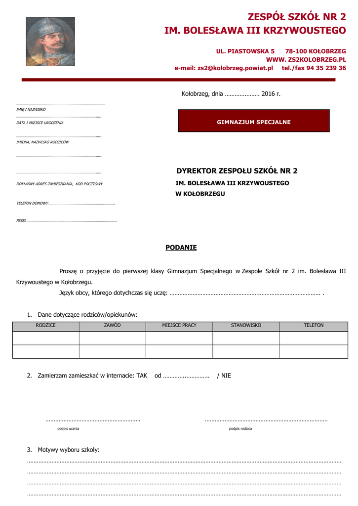ZESPÓŁ SZKÓŁ NR 2 IM. BOLESŁAWA III KRZYWOUSTEGO UL. PIASTOWSKA 5 78-100 KOŁOBRZEG WWW. ZS2KOLOBRZEG.PL e-mail: [email protected] tel./fax 94 35 239 36 Kołobrzeg, dnia …………..……. 2016 r. ……………………………………………………………………………… IMIĘ I NAZWISKO ………………………………………………………………………...... GIMNAZJUM SPECJALNE DATA I MIEJSCE URODZENIA ………………………………………………………………………...... IMIONA, NAZWISKO RODZICÓW ………………………………………………………………………...... ………………………………………………………………………...... DYREKTOR ZESPOŁU SZKÓŁ NR 2 DOKŁADNY ADRES ZAMIESZKANIA, KOD POCZTOWY IM. BOLESŁAWA III KRZYWOUSTEGO W KOŁOBRZEGU TELEFON DOMOWY………………………………………………………….. PESEL ………………………………………………………………………………. PODANIE Proszę o przyjęcie do pierwszej klasy Gimnazjum Specjalnego w Zespole Szkół nr 2 im. Bolesława III Krzywoustego w Kołobrzegu. Język obcy, którego dotychczas się uczę: ……………………………………………….………………………………. . 1. Dane dotyczące rodziców/opiekunów: RODZICE ZAWÓD 2. Zamierzam zamieszkać w internacie: TAK …………………………………………………. podpis ucznia MIEJSCE PRACY STANOWISKO od …………..………….. TELEFON / NIE ………………………………………………………………… podpis rodzica 3. Motywy wyboru szkoły: ………………………………………………………………………………………………………………………………………………………………………… ………………………………………………………………………………………………………………………………………………………………………… ………………………………………………………………………………………………………………………………………………………………………… ………………………………………………………………………………………………………………………………………………………………………… 4. Uzdolnienia ucznia: …………………………………………………………………………………………...……………………………… …………………………………………………………………………………………………………………………………………………………………… …………………………………………………………………………………………………………………………………………………………………… …………………………………………………………………………………………………………………………………………………………………… …………………………………………………………………………………………………………………………………………………………………… …………………………………………………………………………………………………………………………………………………………………… …………………………………………………………………………………………………………………………………………………………………… …………………………………………………………………………………………………………………………………………………………………… 5. Uwagi wychowawcy: …………………………………………………………………….…………………………………………………… ……………………………………………………………………………………………………………………………………………………………..…… …………………………………………………………………………………………………………………………………………………………………… …………………………………………………………………………………………………………………………………………………………………… …………………………………………………………………………………………………………………………………………………………………… …………………………………………………………………………………………………………………………………………………………………… …………………………………………………………………………………………………………………………………………………………………… …………………………………………………………………………………………………………………………………………………………………… …………………………………………………………………………………………………………………………………………………………………… …………………………………………………………………………………………………………………………………………………………..……… ………………………………………………… …………………………………………… PIECZĘĆ SZKOŁY PODSTAWOWEJ podpis wychowawcy WYMAGANE DOKUMENTY: Do wypełnionego podania o przyjęcie do szkoły należy