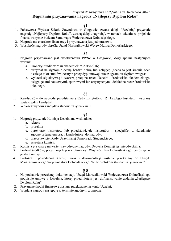 Załącznik do zarządzenia nr 16/2016 z dn. 16 czerwca 2016 r. Regulamin przyznawania nagrody „Najlepszy Dyplom Roku” §1 1. Państwowa Wyższa Szkoła Zawodowa w Głogowie, zwana dalej „Uczelnią” przyznaje nagrodę „Najlepszy Dyplom Roku”, zwaną dalej „nagrodą”, w ramach udziału w projekcie finansowanym z budżetu Samorządu Województwa Dolnośląskiego. 2. Nagroda ma charakter finansowy i przyznawana jest jednorazowo. 3. Wysokość nagrody określa Urząd Marszałkowski Województwa Dolnośląskiego. §2 1. Nagroda przyznawana jest absolwentowi PWSZ w Głogowie, który spełnia następujące warunki: a. ukończył studia w roku akademickim 2015/2016; b. otrzymał na dyplomie ocenę bardzo dobrą lub celującą (ocena ta jest średnią ocen z całego toku studiów, oceny z pracy dyplomowej oraz z egzaminu dyplomowego); c. wykazał się aktywną i twórczą pracą na rzecz Uczelni i środowiska akademickiego, osiągnięciami naukowymi, sportowymi lub artystycznymi, działał na rzecz środowiska lokalnego. 1. Kandydatów do nagrody przedstawiają Rady Instytutów. Z każdego Instytutu wybrany zostaje jeden kandydat. Wniosek wyboru kandydata stanowi załącznik nr 1. §3 2. §4 1. 2. 3. 4. Nagrodę przyznaje Komisja Uczelniana w składzie: a. rektor; b. prorektor; c. dyrektorzy instytutów lub przedstawiciele instytutów – specjaliści w dziedzinie zgodnej z tematem pracy kandydującej do nagrody; d. przedstawiciel Rady Uczelnianej Samorządu Studenckiego; e. sekretarz komisji. Komisja przyznaje najwyżej trzy odrębne nagrody. Decyzja Komisji jest nieodwołalna. Podział środków, przyznanych przez Samorząd Województwa Dolnośląskiego, pozostaje w gestii Komisji. Protokół z posiedzenia Komisji wraz z dokumentacją zostanie przekazany do Urzędu Marszałkowskiego Województwa Dolnośląskiego. Wzór protokołu stanowi załącznik nr 2. §5 1. 2. 3. Na podstawie przesłanej dokumentacji, Urząd Marszałkowski Województwa Dolnośląskiego podpisuje umowę z Uczelnią, której przedmiotem jest dofinansowanie zadania „Najlepszy Dyplom Roku” Przyznane środki finansowe zostaną przekazane na konto Uczelni. Wypłata nagrody następuje w terminie zgodnym z umową.
