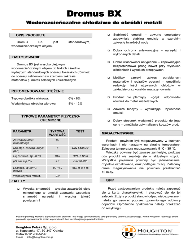 Dromus BX Wodorozcieńczalne chłodziwo do obróbki metali OPIS PRODUKTU Dromus BX jest wodorozcieńczalnym olejem. Stabilność emulsji – zawarte emulgatory zapewniają stabilną emulsję w szerokim zakresie twardości wody Dobra ochrona antykorozyjna – narzędzi i wykonanych detali Dobre właściwości antypienne – zapewniające bezproblemowa pracę nawet przy wysokich ciśnieniach i wysokich przepływach Możliwy szeroki zakres obrabianych materiałów i rodzajów operacji – umożliwia redukcję ilości używanych chłodziw w zakładzie oraz kosztów magazynowania Produkt nie plamiący –gdyż również do metali nieżelaznych odpowiedni Zawiera biocydy – wydłużając emulsji żywotność Dobry stosunek wydajność produktu do jego ceny – umożliwia optymalizacje kosztów prod. standardowym, ZASTOSOWANIE Dromus BX jest wysoko olejowym wodorozcieńczalnym olejem do lekkich i średnio wydajnych standardowych operacji tokarskich (również do operacji szlifierskich) w szerokim zakresie materiałów tj. metali żelaznych i nieżelaznych. REKOMENDOWANE STĘŻENIE Typowa obróbka wiórowa: 6% - 8% Wydajniejsza obróbka wiórowa: 8% - 12% TYPOWE PARAMETRY FIZYCZNOCHEMICZNE PARAMETR TYPOWA WARTOŚĆ TEST Zawartość oleju mineralnego 80 Min.stęż. zabezp. antyk. (0-0) 6 DIN 51360/2 Ciężar właś. @ 20 ºC 910 DIN D 1298 pH emulsji 5% 9.1 DIN 51396 80-110 ASTM D 445 Lepkość. @ 20 ºC, mm2/s Współczynnik refrakt. Produkt powinien być magazynowany w suchych warunkach i nie narażany na skrajne temperatury. o o Zalecana temperatura magazynowania 5 C - 35 C. Wieczka powinny być zawsze zamknięte, podczas gdy produkt nie znajduje się w aktualnym użyciu. Wszystkie pojemniki powinny być jednoznacznie, czytelnie oznakowane, oraz podlegać rotacji. Zalecany okres magazynowania nie powinien przekraczać 12 m-cy. 0.9 BHP ZALETY MAGAZYNOWANIE Wysoka smarność – wysoka zawartość oleju mineralnego w emulsji zapewnia wspaniałą smarność narzędzi i wysoką jakość powierzchni Przed zastosowaniem produktu należy zapoznać się z kartą charakterystyki i stosować się do jej zaleceń. Zużyty produkt stanowi odpad niebezpieczny i należy go usuwać poprzez uprawnionego odbiorcę odpadów. Opróżnione opakowania należy przekazać do recyklingu. Podane powyżej wielkości są wartościami średnimi i nie mogą być traktowane jako parametry odbioru jakościowego. Firma Houghton rezerwuje sobie prawo do wprowadzania zmian w produktach bez wcześniejszego powiadomienia. Houghton Polska Sp. z o.o. ul. Kapelanka 17, 30-347 Kraków tel/fax 0-12 266-52-40 E-mail [email protected]
