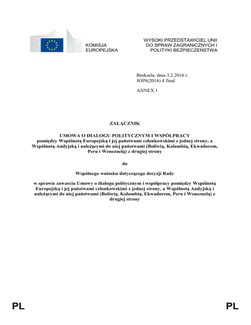 WYSOKI PRZEDSTAWICIEL UNII DO SPRAW ZAGRANICZNYCH I POLITYKI BEZPIECZEŃSTWA KOMISJA EUROPEJSKA Bruksela, dnia 3.2.2016 r. JOIN(2016) 4 final ANNEX 1 ZAŁĄCZNIK UMOWA O DIALOGU POLITYCZNYM I WSPÓŁPRACY pomiędzy Wspólnotą Europejską i jej państwami członkowskimi z jednej strony, a Wspólnotą Andyjską i należącymi do niej państwami (Boliwią, Kolumbią, Ekwadorem, Peru i Wenezuelą) z drugiej strony do Wspólnego wniosku dotyczącego decyzji Rady w sprawie zawarcia Umowy o dialogu politycznym i współpracy pomiędzy Wspólnotą Europejską i jej państwami członkowskimi z jednej strony, a Wspólnotą Andyjską i należącymi do niej państwami (Boliwią, Kolumbią, Ekwadorem, Peru i Wenezuelą) z drugiej strony PL PL ZAŁĄCZNIK UMOWA O DIALOGU POLITYCZNYM I WSPÓŁPRACY pomiędzy Wspólnotą Europejską i jej państwami członkowskimi z jednej strony, a Wspólnotą Andyjską i należącymi do niej państwami (Boliwią, Kolumbią, Ekwadorem, Peru i Wenezuelą) z drugiej strony KRÓLESTWO BELGII, KRÓLESTWO DANII, REPUBLIKA FEDERALNA NIEMIEC, REPUBLIKA GRECKA, KRÓLESTWO HISZPANII, REPUBLIKA FRANCUSKA, IRLANDIA, REPUBLIKA WŁOSKA, WIELKIE KSIĘSTWO LUKSEMBURGA, KRÓLESTWO NIDERLANDÓW, REPUBLIKA AUSTRII, REPUBLIKA PORTUGALSKA, REPUBLIKA FINLANDII, KRÓLESTWO SZWECJI, ZJEDNOCZONE KRÓLESTWO WIELKIEJ BRYTANII I IRLANDII PÓŁNOCNEJ, Umawiające się Strony Traktatu ustanawiającego Wspólnotę Europejską oraz Traktatu o Unii Europejskiej, zwane dalej „państwami członkowskimi” oraz WSPÓLNOTA EUROPEJSKA, z jednej strony, oraz WSPÓLNOTA ANDYJSKA I NALEŻĄCE DO NIEJ PAŃSTWA, REPUBLIKA BOLIWII, REPUBLIKA KOLUMBII, REPUBLIKA EKWADORU, REPUBLIKA PERU, BOLIWARIAŃSKA REPUBLIKA WENEZUELI z drugiej strony, ZWAŻYWSZY na tradycyjne historyczne i kulturowe więzi między Stronami oraz chęć zacieśnienia łączących je stosunków, w oparciu o istniejące mechanizmy, które te stosunki regulują; PL 2 PL ZWAŻYWSZY, że niniejsza nowa Umowa o dialogu politycznym i współpracy ma w znaczący sposób przyczynić się do pogłębienia i rozszerzenia stosunków Unii Europejskiej i Wspólnoty Andyjskiej, obejmując nowe dziedziny będące przedmiotem zainteresowania obu Stron; POTWIERDZAJĄC poszanowanie dla zasad demokracji i podstawowych praw człowieka, zawartych w Powszechnej Deklaracji Praw Człowieka, i dla przepisów międzynarodowego prawa humanitarnego; PRZYWOŁUJĄC swoje zaangażowanie na rzecz zasady państwa prawa i dobrych rządów; PRZEŚWIADCZENI o znaczeniu walki z narkotykami i powiązaną z nimi przestępczością, toczonej w oparciu o zasady współodpowiedzialności, w drodze wszechstronnych, wyważonych i multilateralnych działań; PODKREŚLAJĄC swoje zaangażowanie w prowadzenie wspólnych działań, zmierzających do realizacji wyznaczonych celów, jakimi są eliminacja ubóstwa, sprawiedliwość i spójność społeczna, sprawiedliwy i zrównoważony rozwój, w tym kwestie podatności na klęski żywiołowe, zachowania środowiska naturalnego i jego ochrony oraz bioróżnorodności, wzmocnienia poszanowania praw człowieka, instytucji demokratycznych i zasady dobrych rządów oraz stopniowej integracji krajów andyjskich z gospodarką światową; PODKREŚLAJĄC znaczenie, jakie Strony przywiązują do konsolidacji dialogu politycznego dotyczącego leżących we wspólnym interesie zagadnień bilateralnych, regionalnych i międzynarodowych, jak i do mechanizmów dialogu, jak zostało to określone we wspólnej deklaracji Unii Europejskiej i Wspólnoty Andyjskiej w sprawie dialogu politycznego, podpisanej w Rzymie dnia 30 czerwca 1996 r.; PODKREŚLAJĄC potrzebę rozbudowania programu współpracy, regulowanego Umową ramową o współpracy między Europejską Wspólnotą Gospodarczą a Umową z Kartageny i jej państwami członkowskimi: Republiką Boliwii, Republiką Kolumbii, Republiką Ekwadoru, Republiką Peru oraz Republiką Wenezueli, podpisaną w 1993 r. (zwana dalej „umową ramową o współpracy z 1993 r.”); UZNAJĄC potrzebę pogłębienia procesu integracji regionalnej, zliberalizowania handlu i przeprowadzenia reformy gospodarczej w krajach Wspólnoty Andyjskiej oraz intensyfikacji działań w zakresie zapobiegania konfliktom w celu ustanowienia andyjskiej strefy pokoju, zgodnie z zobowiązaniami z Limy (Andyjską kartą na rzecz pokoju i bezpieczeństwa, ograniczenia i kontroli wydatków na obronę zewnętrzną); ŚWIADOMI konieczności promowania w krajach regionu andyjskiego zrównoważonego rozwoju poprzez partnerstwo na rzecz rozwoju, w którym uczestniczyłyby wszystkie zainteresowane strony, w tym zorganizowane społeczeństwo obywatelskie i sektor prywatny, zgodnie z zasadami określonymi w konsensusie z Monterrey i deklaracji z Johannesburga oraz planie realizacji z Johannesburga; PRZEŚWIADCZENI o konieczności nawiązania współpracy w kwestiach migracji, azylu i uchodźców; PODKREŚLAJĄC chęć współpracy na forach międzynarodowych; ŚWIADOMI konieczności konsolidowania stosunków między Unią Europejską a Wspólnotą Andyjską w celu wzmocnienia mechanizmów, na których stosunki te się opierają, tak aby móc dostosować się do nowej dynamiki stosunków międzynarodowych w globalnym świecie pełnym wzajemnych zależności; PL 3 PL MAJĄC NA UWADZE strategiczne partnerstwo Unii Europejskiej z Ameryką Łacińską i krajami Karaibów, zawiązane na szczycie w Rio w 1999 r. i potwierdzone na szczycie w Madrycie w 2002 r.; oraz PONOWNIE POTWIERDZAJĄC w niniejszych ramach konieczność promowania wymiany niezbędnej, aby powstać mogły warunki do rozwijania stosunków między Unią Europejską i Wspólnotą Andyjską, opierających się na solidnych i obustronnie korzystnych podstawach; POSTANOWILI ZAWRZEĆ NINIEJSZĄ UMOWĘ: TYTUŁ I CELE, CHARAKTER I ZAKRES UMOWY Artykuł 1 Zasady 1. Poszanowanie zasad demokracji i podstawowych praw człowieka, zawartych w Powszechnej Deklaracji Praw Człowieka, jak również zasady