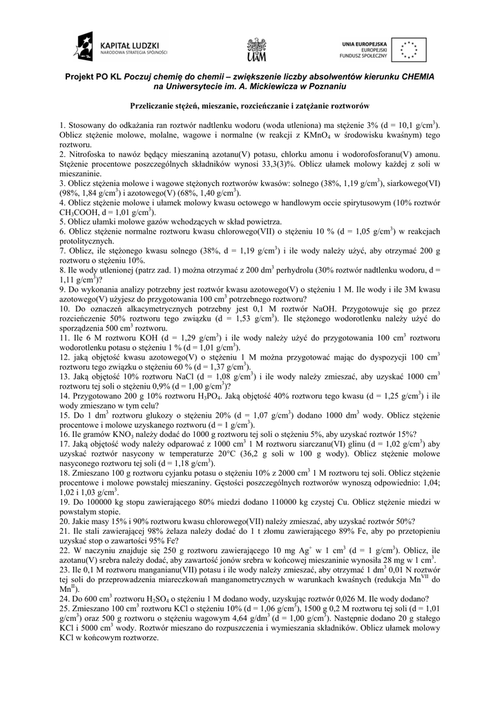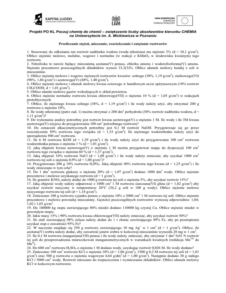 Projekt PO KL Poczuj chemię do chemii – zwiększenie liczby absolwentów kierunku CHEMIA na Uniwersytecie im. A. Mickiewicza w Poznaniu Przeliczanie stężeń, mieszanie, rozcieńczanie i zatężanie roztworów 1. Stosowany do odkażania ran roztwór nadtlenku wodoru (woda utleniona) ma stężenie 3% (d = 10,1 g/cm3). Oblicz stężenie molowe, molalne, wagowe i normalne (w reakcji z KMnO4 w środowisku kwaśnym) tego roztworu. 2. Nitrofoska to nawóz będący mieszaniną azotanu(V) potasu, chlorku amonu i wodorofosforanu(V) amonu. Stężenie procentowe poszczególnych składników wynosi 33,3(3)%. Oblicz ułamek molowy każdej z soli w mieszaninie. 3. Oblicz stężenia molowe i wagowe stężonych roztworów kwasów: solnego (38%, 1,19 g/cm3), siarkowego(VI) (98%, 1,84 g/cm3) i azotowego(V) (68%, 1,40 g/cm3). 4. Oblicz stężenie molowe i ułamek molowy kwasu octowego w handlowym occie spirytusowym (10% roztwór CH3COOH, d = 1,01 g/cm3). 5. Oblicz ułamki molowe gazów wchodzących w skład powietrza. 6. Oblicz stężenie normalne roztworu kwasu chlorowego(VII) o stężeniu 10 % (d = 1,05 g/cm3) w reakcjach protolitycznych. 7. Oblicz, ile stężonego kwasu solnego (38%, d = 1,19 g/cm3) i ile wody należy użyć, aby otrzymać 200 g roztworu o stężeniu 10%. 8. Ile wody utlenionej (patrz zad. 1) można otrzymać z 200 dm3 perhydrolu (30% roztwór nadtlenku wodoru, d = 1,11 g/cm3)? 9. Do wykonania analizy potrzebny jest roztwór kwasu azotowego(V) o stężeniu 1 M. Ile wody i ile 3M kwasu azotowego(V) użyjesz do przygotowania 100 cm3 potrzebnego roztworu? 10. Do oznaczeń alkacymetrycznych potrzebny jest 0,1 M roztwór NaOH. Przygotowuje się go przez rozcieńczenie 50% roztworu tego związku (d = 1,53 g/cm3). Ile stężonego wodorotlenku należy użyć do sporządzenia 500 cm3 roztworu. 11. Ile 6 M roztworu KOH (d = 1,29 g/cm3) i ile wody należy użyć do przygotowania 100 cm3 roztworu wodorotlenku potasu o stężeniu 1 % (d = 1,01 g/cm3). 12. jaką objętość kwasu azotowego(V) o stężeniu 1 M można przygotować mając do dyspozycji 100 cm3 roztworu tego związku o stężeniu 60 % (d = 1,37 g/cm3). 13. Jaką objętość 10% roztworu NaCl (d = 1,08 g/cm3) i ile wody należy zmieszać, aby uzyskać 1000 cm3 roztworu tej soli o stężeniu 0,9% (d = 1,00 g/cm3)? 14. Przygotowano 200 g 10% roztworu H3PO4. Jaką objętość 40% roztworu tego kwasu (d = 1,25 g/cm3) i ile wody zmieszano w tym celu? 15. Do 1 dm3 roztworu glukozy o stężeniu 20% (d = 1,07 g/cm3) dodano 1000 dm3 wody. Oblicz stężenie procentowe i molowe uzyskanego roztworu (d = 1 g/cm3). 16. Ile gramów KNO3 należy dodać do 1000 g roztworu tej soli o stężeniu 5%, aby uzyskać roztwór 15%? 17. Jaką objętość wody należy odparować z 1000 cm3 1 M roztworu siarczanu(VI) glinu (d = 1,02 g/cm3) aby uzyskać roztwór nasycony w temperaturze 20°C (36,2 g soli w 100 g wody). Oblicz stężenie molowe nasyconego roztworu tej soli (d = 1,18 g/cm3). 18. Zmieszano 100 g roztworu cyjanku potasu o stężeniu 10% z 2000 cm3 1 M roztworu tej soli. Oblicz stężenie procentowe i molowe powstałej mieszaniny. Gęstości poszczególnych roztworów wynoszą odpowiednio: 1,04; 1,02 i 1,03 g/cm3. 19. Do 100000 kg stopu zawierającego 80% miedzi dodano 110000 kg czystej Cu. Oblicz stężenie miedzi w powstałym stopie. 20. Jakie masy 15% i 90% roztworu kwasu chlorowego(VII) należy zmieszać, aby uzyskać roztwór 50%? 21. Ile stali zawierającej 98% żelaza należy dodać do 1 t złomu zawierającego 89% Fe, aby po przetopieniu uzyskać stop o zawartości 95% Fe? 22. W naczyniu znajduje się 250 g roztworu zawierającego 10 mg Ag+ w 1 cm3 (d = 1 g/cm3). Oblicz, ile azotanu(V) srebra należy dodać, aby zawartość jonów srebra w końcowej mieszaninie wynosiła 28 mg w 1 cm3. 23. Ile 0,1 M roztworu manganianu(VII) potasu i ile wody należy zmieszać, aby otrzymać 1 dm3 0,01 N roztwór tej soli do przeprowadzenia miareczkowań manganometrycznych w warunkach kwaśnych (redukcja MnVII do MnII). 24. Do 600 cm3 roztworu H2SO4 o stężeniu 1 M dodano wody, uzyskując roztwór 0,026 M. Ile wody dodano? 25. Zmieszano 100 cm3 roztworu KCl o stężeniu 10% (d = 1,06 g/cm3), 1500 g 0,2 M roztworu tej soli (d = 1,01 g/cm3) oraz 500 g roztworu o stężeniu wagowym 4,64 g/dm3 (d = 1,00 g/cm3). Następnie dodano 20 g stałego KCl i 5000 cm3 wody. Roztwór mieszano do rozpuszczenia i wymieszania składników. Oblicz ułamek molowy KCl w końcowym roztworze.