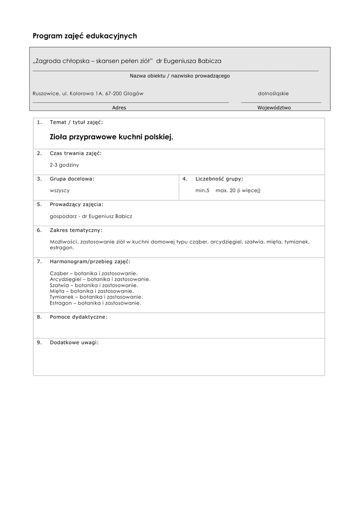 Program zajęć edukacyjnych „Zagroda chłopska – skansen pełen ziół” dr Eugeniusza Babicza ______________________________________________________________________________________________________________________ Nazwa obiektu / nazwisko prowadzącego Ruszowice, ul. Kolorowa 1A, 67-200 Glogów _________________________________________________________________________________ Adres 1. dolnośląskie _________________________________ Województwo Temat / tytuł zajęć: Zioła przyprawowe kuchni polskiej. 2. Czas trwania zajęć: 2-3 godziny 3. Grupa docelowa: wszyscy 5. 4. Liczebność grupy: min.5 max. 20 (i więcej) Prowadzący zajęcia: gospodarz - dr Eugeniusz Babicz 6. Zakres tematyczny: Możliwości, zastosowanie ziół w kuchni domowej typu cząber, arcydzięgiel, szałwia, mięta, tymianek, estragon. 7. Harmonogram/przebieg zajęć: Cząber – botanika i zastosowanie. Arcydzięgiel – botanika i zastosowanie. Szałwia – botanika i zastosowanie. Mięta – botanika i zastosowanie. Tymianek – botanika i zastosowanie. Estragon – botanika i zastosowanie. 8. Pomoce dydaktyczne: 9. Dodatkowe uwagi:
