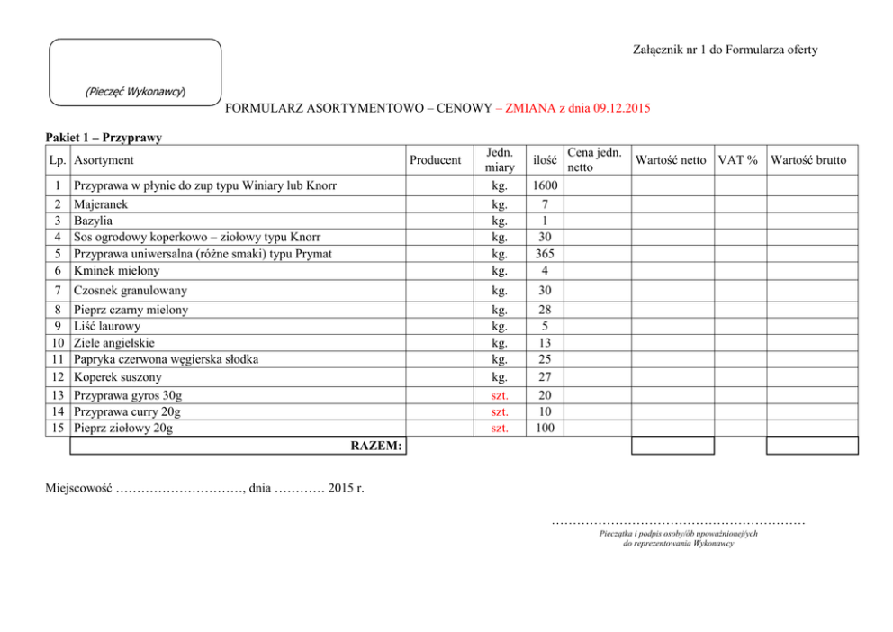 Załącznik nr 1 do Formularza oferty (Pieczęć Wykonawcy) FORMULARZ ASORTYMENTOWO – CENOWY – ZMIANA z dnia 09.12.2015 Pakiet 1 – Przyprawy Lp. Asortyment Producent Jedn. miary kg. kg. kg. kg. kg. kg. 1600 7 1 30 365 4 ilość 1 2 3 4 5 6 Przyprawa w płynie do zup typu Winiary lub Knorr Majeranek Bazylia Sos ogrodowy koperkowo – ziołowy typu Knorr Przyprawa uniwersalna (różne smaki) typu Prymat Kminek mielony 7 Czosnek granulowany kg. 30 8 9 10 11 12 13 14 15 Pieprz czarny mielony Liść laurowy Ziele angielskie Papryka czerwona węgierska słodka Koperek suszony Przyprawa gyros 30g Przyprawa curry 20g Pieprz ziołowy 20g kg. kg. kg. kg. kg. szt. szt. szt. 28 5 13 25 27 20 10 100 Cena jedn. netto Wartość netto VAT % Wartość brutto RAZEM: Miejscowość …………………………, dnia ………… 2015 r. …………………………………………………… Pieczątka i podpis osoby/ób upoważnionej/ych do reprezentowania Wykonawcy