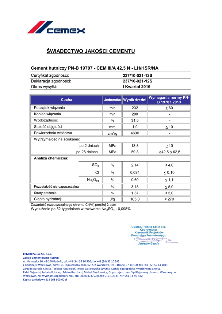 ŚWIADECTWO JAKOŚCI CEMENTU Cement hutniczy PN-B 19707 - CEM III/A 42,5 N - LH/HSR/NA Certyfikat zgodności: Deklaracja zgodności: Okres wysyłki: 237/10-021-12S 237/10-021-12S I Kwartał 2016 Cecha Jednostka Wynik średni Wymagania normy PNB 19707:2013 Początek wiązania min 232 > 60 Koniec wiązania min 290 - % 31,5 - mm 1,0 < 10 cm2/g 4630 - po 2 dniach MPa 13,3 > 10 po 28 dniach MPa 59,3 >42,5 < 62,5 SO3 % 2,14 < 4,0 Cl % 0,094 < 0,10 Na2Oeq % 0,60 < 1,1 Pozostałość nierozpuszczalna % 3,13 < 5,0 Straty prażenia % 1,37 < 5,0 J/g 185,0 < 270 Wodożądność Stałość objętości Powierzchnia właściwa Wytrzymałość na ściskanie: Analiza chemiczna: Ciepło hydratacji Zawartość rozpuszczalnego chromu Cr(VI) poniżej 2 ppm Wydłużenie po 52 tygodniach w roztworze Na 2SO4 - 0,098% CEMEX Polska Sp. z o.o. Zakład Cementownia Rudniki ul. Mstowska 10, 42-240 Rudniki, tel. +48 (34) 32 10 500, fax +48 (34) 32 10 545 z siedzibą w Warszawie, adres: ul. Łopuszańska 38 D, 02-232 Warszawa, tel. +48 (22) 57 14 100, fax +48 (22) 57 14 1011 Zarząd: Marcelo Catala, Tadeusz Radzięciak, Iwona Górakowska-Szyszka, Kamila Skorupińska, Włodzimierz Chołuj, Rafał Gajewski, Izabela Rokicka, Adrian Burchard, Michał Daszkiewicz; Organ rejestrowy: Sąd Rejonowy dla m.st. Warszawy w Warszawie, XIII Wydział Gospodarczy KRS, KRS 0000037375, Regon 012192639, NIP 951-14-96-432, Kapitał zakładowy 314 268 600,00 zł