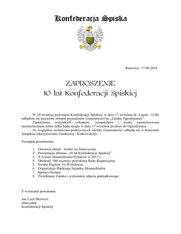 Ratowice, 17.08.2016 ZAPROSZENIE 10 lat Konfederacji Spiskiej W 10 rocznicę powstania Konfederacji Spiskiej, w dniu 17 września br. o godz. 12.00, odbędzie się uroczyste otwarte posiedzenie Generalności na „Zamku Ogrodzieniec”. Zapraszamy wszystkich członków, sympatyków i osoby zainteresowane monarchizmem, które tylko będą mogły w dniu 17 września przybyć do Ogrodzieńca. Ze względów techniczno-praktycznych obrady Generalności odbędą się w Karczmie Jurajskiej (skrzyżowanie Zamkowej i Krakowskiej). Porządek posiedzenia: 1. 2. 3. 4. 5. 6. 7. 8. Otwarcie obrad – krótki rys historyczny Prezentacja albumu „10 lat Konfederacji Spiskiej” X Forum Monarchistów Polskich w 2017 r. Obchody 100 rocznicy powołania Rady Regencyjnej Święto Piastów we Wrocławiu Organizacja Śląskiego Sejmiku Monarchistów Sprawy bieżące Zwiedzanie Zamku i wykonanie zdjęcia pamiątkowego Z wyrazami poważania Jan Lech Skowera Marszałek Konfederacji Spiskiej