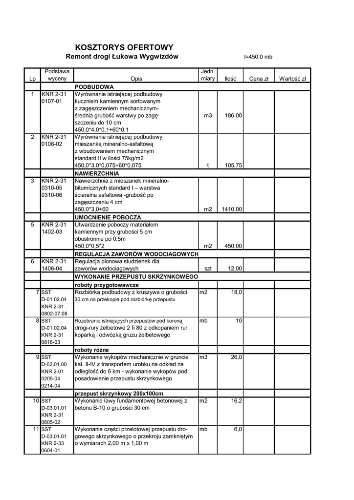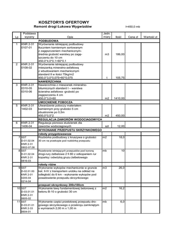 KOSZTORYS OFERTOWY Remont drogi Łukowa Wygwizdów Lp 1 2 3 5 6 Podstawa wyceny KNR 2-31 0107-01 KNR 2-31 0108-02 KNR 2-31 0310-05 0310-06 KNR 2-31 1402-03 KNR 2-31 1406-04 7 SST D-01.02.04 KNR 2-31 0802-07,08 8 SST D-01.02.04 KNR 2-31 0816-03 9 SST D-02.01.00 KNR 2-01 0205-04 0214-04 10 SST D-03.01.01 KNR 2-31 0605-02 11 SST D-03.01.01 KNR 2-33 0604-01 Opis l=450,0 mb Jedn. miary PODBUDOWA Wyrównanie istniejącej podbudowy tłuczniem kamiennym sortowanym z zagęszczeniem mechanicznymśrednia grubość warstwy po zagęm3 szczeniu do 10 cm 450,0*4,0*0,1+60*0,1 Wyrównanie istniejącej podbudowy mieszanką mineralno-asfaltową z wbudowaniem mechanicznym standard II w ilości 75kg/m2 450,0*3,0*0,075+60*0,075 t NAWIERZCHNIA Nawierzchnia z mieszanek mineralnobitumicznych standard I – warstwa ścieralna asfaltowa -grubość po zagęszczeniu 4 cm 450,0*3,0+60 m2 UMOCNIENIE POBOCZA Utwardzenie poboczy materiałem kamiennym przy grubości 5 cm obustronnie po 0,5m 450,0*0,5*2 m2 REGULACJA ZAWORÓW WODOCIAGOWYCH Regulacja pionowa studzienek dla zaworów wodociagowych szt WYKONANIE PRZEPUSTU SKRZYNKOWEGO roboty przygotowawcze Rozbiórka podbudowy z kruszywa o grubości m2 Ilość 186,00 105,75 1410,00 450,00 12,00 18,0 30 cm na przekopie pod rozbiórkę przepustu Rozebranie istniejących przepustów pod koroną mb 10 m3 26,0 m2 16,2 mb 6,0 drogi-rury Ŝelbetowe 2 fi 80 z odkopaniem rur koparką i odwózką gruzu Ŝelbetowego roboty róŜne Wykonanie wykopów mechanicznie w gruncie kat. II-IV z transportem urobku na odkład na odległość do 6 km - wykonanie wykopów pod posadowienie przepustu skrzynkowego przepust skrzynkowy 200x100cm Wykonanie ławy fundamentowej betonowej z betonu B-10 o grubości 30 cm Wykonanie części przelotowej przepustu drogowego skrzynkowego o przekroju zamkniętym o wymiarach 2,00 m x 1,00 m Cena zł Wartość zł 12 SST D-03.01.01 KNR 2-33 0606-02 13 SST D-04.02.01 KNR 2-01 0504-04 14 SST D-04.06.01 KNR 2-31 0109-01 15 SST D-04.04.03 KNR 231 0114-05 16 SST D-05.03.15 KNR AT-03 0203-01 17 SST Wykonanie ścianek czołowych przepustów z betonu B-30 wraz z wykonaniem zbrojenia i izolacji ścian lepikiem m3 6,82 Wykonanie i zagęszczenie mechanicze zasypki z piasku o grubości 80 cm m2 12,0 m2 12,0 m2 12,0 m2 27,0 m2 18,0 m2 18,0 m2 64,00 Ustawienie barier ochronnych stalowych jednostronnych mb 8,0 Ustawienie barier ochronnych stalowych jednostronnych-zakończenia barier (4 szt. zakończeń) mb 16,0 podbudowa drogi na przepuscie Podbudowa betonowa z dylatacją - ochrona izolacji grubej (papa zgrzewalna) o grubości warstwy po zagęszczeniu 10,0 cm z betonu konstrukcyjnego B-25 Wykonanie podbudowy zasadniczej z kruszywa stabilizowanego mechanicznie o grubości 20 cm podbudowa poza przepustem skrzynkowym odtworzenie nawierzchni UłoŜenie geosiatki polipropylenowej zapobiegającej przenoszeniu oddzielenia się drogi od starej nawierzchni - według instrukcji (specyfikacji) producenta, geosiatka o wytrzymałości 20 x 20 kN na rozciąganie Wykonanie nawierzchni z betonu asfaltowego D-05.03.05 KNR 2-31 0310-01 18 SST D-05.03.05 KNR 2-31 0310-05,06 dla ruchu KR 1 - warstwa wiąŜąca z betonu 19 SST Umocnienie skarp i dna rowu płytami aŜurowymi asfaltowego o grubości 4 cm Wykonanie nawierzchni z betonu asfaltowego dla ruchu KR 1 - warstwa ścieralna z betonu asfa- ltowego o grubości 4 cm roboty wykończeniowe D-06.01.03 KNR 2-11 0411-01 (wypełnienie wolnych przestrzeni humusem) o wymiarach 60 x 40 x 10 cm urządzenia bezpieczeństwa ruchu 20 SST D-07.05.01 KNR 2-31 0704-02 21 SST D-07.05.01 KNR 2-31 0704-06 RAZEM WARTOŚĆ ROBÓT PODATEK VAT ( 22%) RAZEM WARTOŚĆ BRUTTO