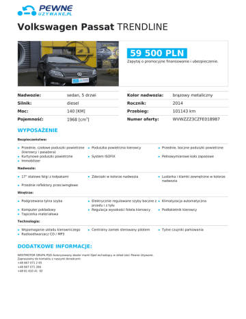 Volkswagen Passat TRENDLINE 59 500 PLN Zapytaj o promocyjne finansowanie i ubezpieczenie. Nadwozie: sedan, 5 drzwi Kolor nadwozia: brązowy metaliczny Silnik: diesel Rocznik: 2014 Moc: 140 [KM] Przebieg: 101143 km Pojemność: 1968 [cm ] Numer oferty: WVWZZZ3CZFE018987 3 WYPOSAŻENIE Bezpieczeństwo: Przednie, czołowe poduszki powietrzne (kierowcy i pasażera) Kurtynowe poduszki powietrzne Immobilizer Poduszka powietrzna kierowcy Przednie, boczne poduszki powietrzne System ISOFIX Pełnowymiarowe koło zapasowe Zderzaki w kolorze nadwozia Lusterka i klamki zewnętrzne w kolorze nadwozia Elektrycznie regulowane szyby boczne z przodu i z tyłu Regulacja wysokości fotela kierowcy Klimatyzacja automatyczna Centralny zamek sterowany pilotem Tylne czujniki parkowania Nadwozie: 17" stalowe felgi z kołpakami Przednie reflektory przeciwmgłowe Wnętrze: Podgrzewana tylna szyba Komputer pokładowy Tapicerka materiałowa Podłokietnik kierowcy Technologia: Wspomaganie układu kierowniczego Radioodtwarzacz CD / MP3 DODATKOWE INFORMACJE: WESTMOTOR GRUPA PGD Autoryzowany dealer marki Opel wchodzący w skład sieci Pewne Używane. Zapraszamy do kontaktu z naszymi doradcami: +48 667 071 2 65 +48 667 071 266 +48 61 610 41 02 Volkswagen Passat TRENDLINE Na samochód wystawiamy fakturę VAT 23%. Kupujący nie ponosi opłaty skarbowej. Możliwość odliczenia VAT przy zakupie na firmę. Oferujemy korzystne formy finansowania zakupu samochodu oraz ubezpieczenia komunikacyjne. Miejsce ekspozycji: Autoryzowany Dealer Opel WESTMOTOR Grupa PGD ul. Obornicka 125 62-002 Suchy Las GPS: 52°28'37.4"N 16°52'12.9"E Pewne Używane Poznań, Suchy Las ul. Obornicka 125, tel.:61 610 41 02 www.blog.pgd.pl Nota prawna Dane zawarte w niniejszej propozycji handlowej mają wyłącznie charakter informacyjny. Podane informacje nie stanowią oferty ani zapewnienia, w szczególności w rozumieniu art. 66 § 1 oraz art. 5561 Kodeksu cywilnego. Wiążące ustalenie ceny, wyposażenia oraz specyfikacji samochodu następuje w pisemnej umowie sprzedaży/zamówienia samochodu. Ze względu na ograniczenia techniczne (np. odwzorowanie kolorów przez monitor lub sposób wydruku), kolory przedstawione w niniejszej propozycji handlowej mogą się różnić od rzeczywistych kolorów nadwozia i tapicerki. Niniejsza propozycja handlowa oraz wszelkie załączniki z nią związane są poufne i nie mogą być przekazywane osobom trzecim. Prezentowane zdjęcia mogą zawierać wyposażenie opcjonalne (akcesoryjne), dodatkowo płatne. Warunki oferty maja charakter orientacyjny i mogą zostać zmienione w momencie uaktualnienia cen lub warunków promocji.