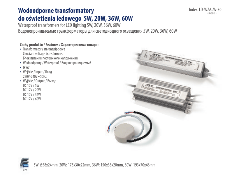 Wodoodporne transformatory do oświetlenia ledowego 5W, 20W, 36W, 60W Waterproof transformers for LED lighting 5W, 20W, 36W, 60W Водонепроницаемые трансформаторы для светодиодного освещения 5W, 20W, 36W, 60W Cechy produktu / Features / Характеристика товара: Transformatory stałonapięciowe Constant voltage transformers Блок питания постоянного напряжения Wodoodporny / Waterproof / Водонепроницаемый IP 67 Wejście / Input / Вход 220V-240V~50Hz Wyjście / Output / Выход DC 12V / 5W DC 12V / 20W DC 12V / 36W DC 12V / 60W 5W: Ø58x24mm, 20W: 175x30x22mm, 36W: 150x38x20mm, 60W: 193x70x46mm size Index: LD-WZA..W-30 (model)