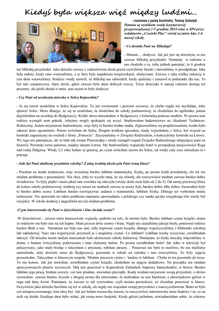 Kiedyś była większa więź między ludźmi… - rozmowa z panią burmistrz, Teresą Substyk. Pytania są wynikiem sondy korytarzowej przeprowadzonej 1-5 grudnia 2014 roku w SP4 przez redaktorów ,,Czwórki Plus" wśród uczniów klas 1-6 naszej szkoły. - Co dostała Pani na Mikołaja? - Hmmm… słodycze. Jak już jest się dorosłym, to nie zawsze Mikołaj przychodzi. Niemniej w rodzinie u nas chodziło o to, żeby jednak pamiętać, że 6 grudnia ten Mikołaj przychodzi. Jako dziecko zawsze z rodzeństwem dzień przed czyściliśmy buciki i stawialiśmy w przedpokoju. Jaka była radość, kiedy rano wstawaliśmy, a te buty były napełnione książeczkami, słodyczami. Zawsze z taką wielką radością w tym dniu wstawaliśmy. Rodzice wtedy mówili, że Mikołaj nas odwiedził, kiedy spaliśmy i zostawił te podarunki dla nas. To był taki sympatyczny, fajny dzień, gdzie zawsze było dużo dobrych rzeczy. Teraz dzieciaki w naszej rodzinie dostają też prezenty, ale jeżeli chodzi o mnie, tym razem to były słodycze. - Czy Pani od urodzenia mieszka w Solcu Kujawskim? - Ja się nawet urodziłam w Solcu Kujawskim. To już ewenement i powiem szczerze, że chyba nigdy nie myślałam, żeby opuścić Solec. Może dlatego, że się tu urodziłam, tu chodziłam do szkoły podstawowej, tu chodziłam do ogólniaka, potem dojeżdżałam na uczelnię do Bydgoszczy. Krótki okres mieszkałam w Bydgoszczy z koleżanką podczas studiów. Po prostu nasi rodzice wynajęli nam pokoik, żebyśmy mogły spokojnie się uczyć. Studiowałam budownictwo na Akademii TechniczoRolnicznej. Jestem inżynierem budowlanym, więc były to bardzo trudne studia. Zajmowaliśmy się projektowaniem, trzeba było zdawać dużo egzaminów. Potem wróciłam do Solca. Drugim krótkim epizodem, kiedy wyjechałam z Solca, był wyjazd na kontrakt zagraniczny na wschód z firmy „Pomorze”. Zaczynaliśmy w Związku Radzieckim, a kończyliśmy kontrakt na Łotwie. Wy tego nie pamiętacie, ale to była tak zwana Pierestrojka i wtedy nastąpił rozpad Związku Radzieckiego (dopytajcie pani na historii). Powstały nowe państwa, między innymi Łotwa. My budowaliśmy wspaniały hotel w przepięknej miejscowości Ryga nad rzeką Dałgawą. Wtedy 2,5 roku byłam za granicą, po czym wróciłam znowu do Solca, od wtedy cały czas mieszkam tu i pracuję. - Jaki był Pani ulubiony przedmiot szkolny? Z jaką średnią ukończyła Pani ósmą klasę? - Poszłam na studia techniczne, więc wcześniej bardzo lubiłam matematykę, fizykę, po prostu ścisłe przedmioty, ale też nie miałam problemu z pozostałymi. Nie chcę, żeby to wyszło tutaj, że się chwalę, ale rzeczywiście miałam zawsze bardzo dobre świadectwa. To były piątki i może jakaś tam czwórka się zdarzyła (wtedy skala ocen była od 2 do 5). Od samej pierwszej klasy do końca szkoły podstawowej, średniej czy nawet na studiach zawsze te oceny były bardzo dobre albo dobre. Generalnie były to bardzo dobre oceny. Lubiłam bardzo rozwiązywać zadania z matematyki, lubiłam fizykę. Dlatego też wybrałam studia techniczne. Nie sprawiało mi także problemu napisanie opowiadania z polskiego czy nauka języka rosyjskiego (bo wtedy był rosyjski). W szkole średniej z angielskim też nie miałam problemu. -Czym interesowała się Pani w dzieciństwie i kim chciała zostać? -W dzieciństwie... zawsze mnie interesowały wyjazdy, podróże na tyle, ile można było. Bardzo lubiłam czytać książki, mimo że rodziców nie było stać na ich kupno. Mam jeszcze dwie siostry i brata. Nigdy nie zaznaliśmy jakiejś biedy, ponieważ rodzice bardzo dbali o nas. Natomiast nie było nas stać, żeby kupować często książki, dlatego wypożyczaliśmy z biblioteki szkolnej lub zakładowej. Nasz tato wypożyczał, przynosił je i mogliśmy czytać. Co lubiłam? Lubiłam trochę wyszywać, uwielbiałam tańczyć. Od dziecka moim małym marzeniem było ukończenie szkoły baletowej. Pamiętam, że kiedy muzykę włączaliśmy w domu, z bratem ćwiczyliśmy podrzucanie i inne elementy baletu. Po prostu uwielbiałam balet! Jak tylko w telewizji był pokazywany, jako mały brzdąc z tańczyłam z artystami, robiłam piruety… Ponieważ nie było to możliwe, bo nie mieliśmy samochodu, żeby dowieźć mnie do Bydgoszczy, pozostała w szkole na rytmika i tam ćwiczyliśmy. To były zajęcia pozaszkolne. Tańczyłam w klasowym zespole. Miałam poczucie rytmu i bardzo to lubiłam. Chyba to mi pozostało do teraz. To nie koniec. Jak już mówiłam, uwielbiałam czytać książki, chodziłam na zajęcia dodatkowe. Na początku nie miałam sprecyzowanych planów życiowych. Mój tato pracował w Kujawskich Zakładach Naprawy Samochodów, w biurze. Bardzo lubiłam jego pracę, brałam zeszyty, coś tam pisałam, stawiałam pieczątki. Kiedy miałam narysować swoją przyszłość, o dziwo rysowałam zawsze biurko, krzesło z drugiej strony dla interesanta. Ja siedziałam za tym biurkiem, a obowiązkowo gdzieś w rogu stał duży kwiat. Pamiętam, że zawsze to tak rysowałam, czyli można powiedzieć, że chciałam pracować w biurze. Oczywiście jako dziecko bawiłam się też w szkołę, ale nigdy nie wiązałam swojej przyszłości z nauczycielstwem. Biuro to było coś niesprecyzowanego, kim chcę być. Jak już byłam troszeczkę starsza, to rzeczywiście interesowały mnie budowy i to, co na nich się działo. Każdego dnia było widać, jak rosną nowe budynki. Kiedy gdzieś jechałam, uświadamiałam sobie, że ciekawe budowle mają związek z moim zawodem w przyszłości. Później jeszcze jedna rzecz się ujawniła. Lubiłam rozmawiać z różnymi ludźmi, obserwować ich zachowania. Miałam do wyboru: psychologię, bo mnie interesowały zachowania ludzi, pomoc im, rozmowa, ale musiałabym wtedy wyjechać Poznania, a nie było mnie stać na to. Dlatego wybrałam budownictwo. To mnie fascynowało, że się buduje, że coś powstaje. Wtedy jeszcze nie miałam wyobrażenia