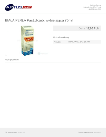 Apteka Avena Królewiecka 12c, Płock +48 502 666 011 BIAŁA PERŁA Past.d/zęb. wybielająca 75ml Cena: 17,95 PLN Opis słownikowy Producent APIPOL-FARMA SP. Z O.O. PPF Opis produktu Plik wygenerowano: 09-03-2017 Powered by TCPDF (www.tcpdf.org) Oprogramowanie sklepu: AptusShop