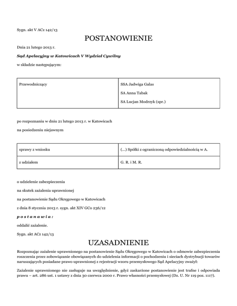 Sygn. akt V ACz 142/13 POSTANOWIENIE Dnia 21 lutego 2013 r. Sąd Apelacyjny w Katowicach V Wydział Cywilny w składzie następującym: Przewodniczący SSA Jadwiga Galas SA Anna Tabak SA Lucjan Modrzyk (spr.) po rozpoznaniu w dniu 21 lutego 2013 r. w Katowicach na posiedzeniu niejawnym sprawy z wniosku (...) Spółki z ograniczoną odpowiedzialnością w A. z udziałem G. R. i M. R. o udzielenie zabezpieczenia na skutek zażalenia uprawnionej na postanowienie Sądu Okręgowego w Katowicach z dnia 8 stycznia 2013 r. sygn. akt XIV GCo 236/12 postanawia: oddalić zażalenie. Sygn. akt ACz 142/13 UZASADNIENIE Rozpoznając zażalenie uprawnionego na postanowienie Sądu Okręgowego w Katowicach o odmowie zabezpieczenia roszczenia przez zobowiązanie obowiązanych do udzielenia informacji o pochodzeniu i sieciach dystrybucji towarów naruszających posiadane prawo uprawnionej z rejestracji wzoru przemysłowego Sąd Apelacyjny zważył: Zażalenie uprawnionego nie zasługuje na uwzględnienie, gdyż zaskarżone postanowienie jest trafne i odpowiada prawu – art. 286 ust. 1 ustawy z dnia 30 czerwca 2000 r. Prawo własności przemysłowej (Dz. U. Nr 119 poz. 1117). Zgodnie z tym przepisem w sprawach o naruszenie własności przemysłowej a w szczególności w sprawach o zaniechanie naruszeń prawa z rejestracji ze wzoru przemysłowego (art. 287 ust 1 p.w.p.) sąd może zabezpieczyć roszczenie przez zobowiązanie naruszającego prawo ochronne do udzielenia informacji, które są niezbędne do dochodzenia roszczeń, o pochodzeniu i sieciach dystrybucji towarów lub usług naruszających prawo ochronne jeżeli naruszenie takich praw jest wysoce prawdopodobne. Takie sformułowanie jest odmienne od treści art. 7301 § 1 k.p.c. zgodnie z którym wystarczające jest uprawdopodobnienie roszczenia. Jednakże nawet do zabezpieczenia informacyjnego zastosowanie mają zasady dotyczące uprawdopodobnienia roszczenia z obostrzeniem przewidzianym treścią art. 286 ust. 1 p.w.p. Zwrócić zatem należy uwagę na zasady jakie obowiązują sąd przy ocenie czy spełniona została przesłanka uprawdopodobnienia roszczenia. Roszczenie jest uprawdopodobnione jeżeli bez głębszego wnikania we wszystkie możliwe aspekty prawne i faktyczne, istnieje na pierwszy rzut oka znaczna szansa, że w świetle przytoczonych we wniosku twierdzeń popartych dowodami roszczenie przysługuje osobie uprawnionej. Dotyczy to także podstawy prawnej która powinna zostać uprawdopodobniona w tym znaczeniu, że dochodzone roszczenie znajduje uzasadnienie w podstawie normatywnej. Zarówno art. 7301 § 1 k.p.c. jak i art. 287 ust. 1 p.w.p. nie nakładają na uprawnionego obowiązku udowodnienia roszczenia jednak ten ostatni przepis dotyczący zabezpieczenia informacyjnego nakłada na uprawnionego obowiązek uprawdopodobnienia graniczącego z pewnością, że roszczenie jest zasadne. Sąd orzekający także na tej podstawie prawnej uprawniony jest ocenić rangę przesłanek uwiarygodniających roszczenie przez ich porównanie z przesłankami, które podważają uprawdopodobnienie roszczenia. Dotyczy to zarówno sytuacji, gdy wniosek o zabezpieczenie roszczenia został złożony w toku postępowania jak również sytuacji gdy materiał dowodowy dołączony do wniosku zawiera stanowisko zobowiązanego . W niniejszej sprawie nie sposób uznać, iż roszczenie uprawnionego posiadającego prawo z rejestracji wzorca przemysłowego zostało uprawdopodobnione w stopniu graniczącym z pewnością o zasadności roszczenia. Z przedstawionej dokumentacji dotyczącej rejestracji wzoru przemysłowego wynika, że prawo z rejestracji dotyczy (co do figur l i 2) talerza w formie trójkąta o dwóch bokach równych, przy czym w figurze pierwszej wszystkie rogi talerza są zaokrąglone. Natomiast jak wynika z wniosku o zabezpieczenie zobowiązani produkują talerz o figurze trójkąta o bokach różnej długości i różnych kątach. Nie przesądzając na tym etapie postępowania o zasadności powództwa nie można bez przeprowadzenia dowodu z oględzin towarów a także dowodu z opinii biegłego ocenić, czy wytwarzane przez zobowiązanego talerze są na tyle podobne do towarów uprawnionej, że stanowi to naruszenie praw powódki z rejestracji wzoru przemysłowego. Oznacza to, że brak jest podstaw do uznania że uprawniona uprawdopodobniła w sposób graniczący z pewnością zasadność swojego roszczenia. Z tych przyczyn zażalenie uprawnionej jest bezpodstawne i zgodnie z art. 385 k.p.c. w zw. z art. 397 § 2 k.p.c. podlega oddaleniu.