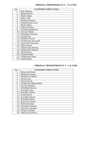 ODDZIAŁ PREDSZKOLNY 4 – 5 LATKI Lp. 1. 2. 3. 4. 5. 6. 7. 8. 9. 10. 11. 12. 13. 14. 15. 16. 17. 18. 19. 20. 21. 22. NAZWISKO I IMIE UCZNIA Bełz Mikołaj Bidiuk Dawid Bielec Kinga Bober Julia Bondyra Klaudia Chmielewska Liwia Dyjak Jakub Gierczak Oskar Grechuta Bartłomiej Greszta Natalia Hołodniak Wiktoria Łyś Bartosz Mołdoch Dawid Niedźwiecki Krzysztof Nowosad Tymoteusz Pałka Adrian Sokołowska Patrycja Sokołowski Mateusz Struk Oliwia Szpindla Rafał Walkowiak Jakub Zięba Hubert ODDZIAŁ PRZEDSZKOLNY 5 – 6 LATKI Lp. 1. 2. 3. 4. 5. 6. 7. 8. 9. 10. 11. 12. 13. 14. 15. 16. 17. 18. 19. NAZWISKO I IMIE UCZNIA Bojarczuk Hanna Bondyra Krystian Denkiewicz Miłosz Drozd Lena Drózd Dawid Dziaduszek Maksymilian Greszta Gabriela Hołodniak Bartosz Juszczak Anna Kawałko Natalia Kimak Karol Kowalski Marcel Kukiełka Hubert Pawelczyk Judyta Piskor Krystian Śliwińska Julianna Wawręty Antonina Wilgos Gabriela Zakrzewska Oliwia KLASA I SZKOŁY PODSTAWOWEJ Lp. 1. 2. 3. 4. 5. 6. 7. 8. 9. 10. 11. 12. 13. 14. 15. 16. 17. NAZWISKO I IMIĘ UCZNIA Adamczyk Antoni Bednarczyk Dominik Bidiuk Olivier Bondyra Paweł Brzozowski Paweł Chwała Michał Gałan Karol Harasim Lena Mazurkiewicz Karol Radliński Wojciech Rosicka Martyna Samborska Julia Sobczuk Mikołaj Sokołowski Wojciech Szewczuk Dominik Wojewódka Amelia Zięba Kacper KLASA I A GIMNAZJUM Lp. 1. 2. 3. 4. 5. 6. 7. 8. 9. 10. 11. 12. 13. 14. 15. 16. 17. 18. 19. 20. 21. 22. 23. 24. 25. 26. NAZWISKO I IMIĘ UCZNIA Bochenko Karolina Dudziński Maksym Głowacka Zuzanna Gontarz Weronika Harasim Dominik Jargieło Jakub Kanarek Nikodem Kniaź Miłosz Krzyżanowska Eryka Kudyk Dariusz Kukiełka Kacper Kyc Julia Lenczewska Angelika Michońska Gabriela Ożga Martyna Pawlak Amelia Sobczuk Jakub Sokołowski Konrad Strzałka Katarzyna Uściak Kamil Wawręty Weronika Zając Tomasz Zakrzewski Dawid Zielonka Kacper Żołopa Paulina Wieliczko Jakub KLASA I B GIMNAZJUM Lp. 1. 2. 3. 4. 5. 6. 7. 8. 9. 10. 11. 12. 13. 14. 15. 16. 17. 18. 19. 20. 21. 22. 23. 24. 25. NAZWISKO I IMIĘ UCZNIA Bartoń Vanessa Bełech Melisa Biront Iwona Bobel Anna Bondyra Michał Bulak Tomasz Iwaniak Grzegorz Kawa Kacper Koniec Bartłomiej Kościelniak Filip Kucharski Dawid Kyc Wiktor Łygas Ewelina Majda Julia Makowski Dawid Pasieczna Oliwia Pawlak Kamila Samborska Patrycja Smyk Wiktoria Stręciwilk Małgorzata Szpyra Damian Tymura Aleksandra Wnuk Łukasz Wojewódka Natalia Lisiewicz Mikołaj KLASA I C GIMNAZJUM Lp. 1. 2. 3. 4. 5. 6. 7. 8. 9. 10. 11. 12. 13. 14. 15. 16. 17. 18. 19. 20. 21. 22. 23. 24. 25. NAZWISKO I IMIĘ UCZNIA Artymiak Maciej Burcon Łukasz Czapka Patrycja Czubek Ernest Czuwara Łukasz Frańczuk Dominika Gluza Patrycja Jakowicki Angelika Jedlikowski Damian Kawala Sebastian Kuźma Jakub Łyś Aleksandra Machałek Klaudia Pakuła Kacper Pupiec Natalia Pupiec Weronika Soboń Wojciech Sowa Jakub Szewczyk Karol Szponar Kacper Teterycz Kacper Wąsek Jakub Zams Iwona Zych Karolina Stręciwilk Bartłomiej