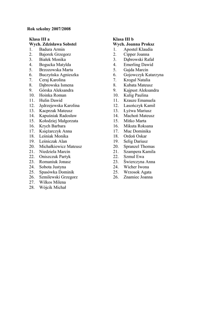 Rok szkolny 2007/2008 Klasa III a Wych. Zdzisława Sobstel 1. Badura Armin 2. Bajorek Grzegorz 3. Białek Monika 4. Bogucka Matylda 5. Brzozowska Marta 6. Buczyńska Agnieszka 7. Ceraj Karolina 8. Dąbrowska Ismena 9. Górska Aleksandra 10. Hoinka Roman 11. Hulin Dawid 12. Jędrzejewska Karolina 13. Kacprzak Mateusz 14. Kapuśniak Radosław 15. Kołodziej Małgorzata 16. Krych Barbara 17. Księżarczyk Anna 18. Leśniak Monika 19. Leśniczak Alan 20. Michałkiewicz Mateusz 21. Niedziela Marcin 22. Oniszczuk Partyk 23. Romaniuk Jonasz 24. Sobota Justyna 25. Spasówka Dominik 26. Szmilewski Grzegorz 27. Wilkos Milena 28. Wójcik Michał Klasa III b Wych. Joanna Proksz 1. Apostel Klaudia 2. Cipper Joanna 3. Dąbrowski Rafał 4. Emerling Dawid 5. Gajda Marcin 6. Gojowczyk Katarzyna 7. Krogul Natalia 8. Kubata Mateusz 9. Kajpust Aleksandra 10. Kulig Paulina 11. Krauze Emanuela 12. Lasończyk Kamil 13. Łyżwa Mariusz 14. Machoń Mateusz 15. Mitko Marta 16. Mikuta Roksana 17. Muc Dominika 18. Ordoń Oskar 19. Selig Dariusz 20. Spranzel Thomas 21. Szampera Kamila 22. Szmul Ewa 23. Świerczyna Anna 24. Wicher Iwona 25. Wrzosok Agata 26. Znamiec Joanna Klasa III c Wych. Bogusława Wlazło 1. Balicki Mateusz 2. Bartosiak Angelika 3. Borończyk Roksana 4. Buchta Marta 5. Buczek Jakub 6. Całkosińska Paula 7. Chrzęstek Katarzyna 8. Fait Patrycja 9. Hajnrych Bartłomiej 10. Kaczan Daria 11. Krzemiński Bartosz 12. Łabus Łukasz 13. Morawiec Anna 14. Niwińska Sabina 15. Nowak Manuel 16. Popek Dawid 17. Przewłocka Olga 18. Rieger Monika 19. Sienkiewicz Maja 20. Selig Magdalena 21. Sledz Nikola 22. Steter Joanna 23. Szneider Adam 24. Szopa Natalia 25. Twardzisz Karolina 26. Wanat Agnieszka Klasa III d Wych. Dorota Fuhrmann 1. Bomba Krzysztof 2. Bujak Jakub 3. Dulog Dawid 4. Dzielecki Igor 5. Gomza Tomasz 6. Jachowicz Krzysztof 7. Janik Aleksandra 8. Kaczmarczyk Wioleta 9. Kozioł Małgorzata 10. Kroczek Katarzyna 11. Kulesza Magdalena 12. Oleksy Aleksandra 13. Pajączkowska Agnieszka 14. Rodak Paweł 15. Rokstein Izabela 16. Sekuła Robert 17. Stal Jarosław 18. Stańkowska Joanna 19. Stańkowska Katarzyna 20. Wandrowskai Mateusz 21. Wąsiołek Paweł 22. Wiecha Daniel 23. Wróbel Sandra 24. Wykurz Łukasz 25. Zadka Arkadiusz 26. Zając Sandra 27. Zaremba Michaela Klasa 6 a Wych. Krystyna Gonta 1. Chmielewski Bartosz 2. Dahms Adam Mateusz 3. Dąbkowski Artur 4. Fuks Kamil 5. Fronczek Aleksandra 6. Gajowy Damian 7. Gruszka Arkadiusz 8. Godlewska Eugenia 9. Jadeszko Denis 10. Kalisz Daria 11. Kameduła Maksym 12. Kamerski Michał 13. Kauczor Weronika 14. Kołodziejek Paulina 15. Korbiel Jarosław 16. KurekWeronika 17. Lebiedzińska Anna 18. Makuch Grzegorz 19. Małysiak Remigiusz 20. Mizik Marcin 21. Myczewska Katarzyna 22. Nalepka Aleksander 23. Najwer Mateusz 24. Parnowska Liwia 25. Rauza Remigiusz 26. Szaja Bartosz 27. Szpularz Anna 28. Waniowski Wiktor 29. Wójcik Magdalena 30. Zapotoczny Dariusz Klasa 6 b Wych. Krystyna Pawełczyk 1. Bagińska Anna 2. Blania Krzysztof 3. Budźko Marlena 4. Czarnecki Łukasz 5. Duszak Magdalena 6. Gagon Kamil 7. Gołębiowski Dawid 8. Gołębiowski Mateusz 9. Graca Dariusz 10. Grzella Dawid 11. Jadasz Oliver 12. Kisiel Arkadiusz 13. Konieczna Angelika 14. Kwaśnicki Sylwester 15. Meszyński Bartłomiej 16. Oniszczuk Paulina 17. Pełka Edyta 18. Pocełujko Karolina 19. Podgórska Agata 20. Post Patryk 21. Ryppa Amelia 22. Szczepaniak Mateusz 23. Sułek Kamil 24. Skórka Dawid 25. Wilkos Aleksandra 26. Zajączkowska Aleksandra 27. Zygmunt Amadeusz