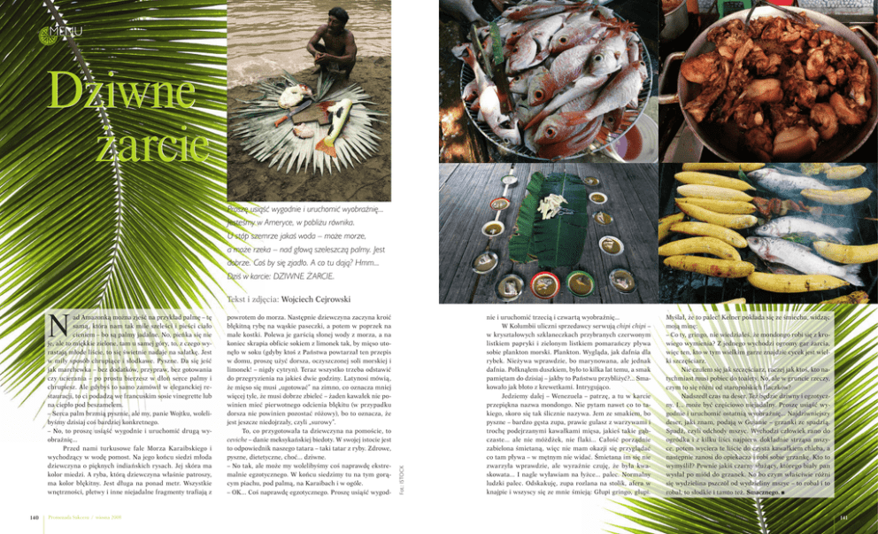 MENU Dziwne żarcie Proszę usiąść wygodnie i uruchomić wyobraźnię... Jesteśmy w Ameryce, w pobliżu równika. U stóp szemrze jakaś woda – może morze, a może rzeka – nad głową szeleszczą palmy. Jest dobrze. Coś by się zjadło. A co tu dają? Hmm... Dziś w karcie: DZIWNE ŻARCIE. N ad Amazonką można zjeść na przykład palmę – tę samą, która nam tak mile szeleści i pieści ciało cieniem – bo są palmy jadalne. No, pieńka się nie je, ale to miękkie zielone, tam u samej góry, to, z czego wyrastają młode liście, to się świetnie nadaje na sałatkę. Jest w miły sposób chrupiące i słodkawe. Pyszne. Da się jeść jak marchewka – bez dodatków, przypraw, bez gotowania czy ucierania – po prostu bierzesz w dłoń serce palmy i chrupiesz. Ale gdybyś to samo zamówił w eleganckiej restauracji, to ci podadzą we francuskim sosie vinegrette lub na ciepło pod beszamelem. – Serca palm brzmią pysznie, ale my, panie Wojtku, wolelibyśmy dzisiaj coś bardziej konkretnego. – No, to proszę usiąść wygodnie i uruchomić drugą wyobraźnię... Przed nami turkusowe fale Morza Karaibskiego i wychodzący w wodę pomost. Na jego końcu siedzi młoda dziewczyna o pięknych indiańskich rysach. Jej skóra ma kolor miedzi. A ryba, którą dziewczyna właśnie patroszy, ma kolor błękitny. Jest długa na ponad metr. Wszystkie wnętrzności, płetwy i inne niejadalne fragmenty trafiają z 140 Promenada Sukcesu / wiosna 2008 powrotem do morza. Następnie dziewczyna zaczyna kroić błękitną rybę na wąskie paseczki, a potem w poprzek na małe kostki. Polewa je garścią słonej wody z morza, a na koniec skrapia obficie sokiem z limonek tak, by mięso utonęło w soku (gdyby ktoś z Państwa powtarzał ten przepis w domu, proszę użyć dorsza, oczyszczonej soli morskiej i limonek! – nigdy cytryn). Teraz wszystko trzeba odstawić do przegryzienia na jakieś dwie godziny. Latynosi mówią, że mięso się musi „ugotować” na zimno, co oznacza mniej więcej tyle, że musi dobrze zbieleć – żaden kawałek nie powinien mieć pierwotnego odcienia błękitu (w przypadku dorsza nie powinien pozostać różowy), bo to oznacza, że jest jeszcze niedojrzały, czyli „surowy”. To, co przygotowała ta dziewczyna na pomoście, to ceviche – danie meksykańskiej biedoty. W swojej istocie jest to odpowiednik naszego tatara – taki tatar z ryby. Zdrowe, pyszne, dietetyczne, choć... dziwne. – No tak, ale może my wolelibyśmy coś naprawdę ekstremalnie egzotycznego. W końcu siedzimy tu na tym gorącym piachu, pod palmą, na Karaibach i w ogóle. – OK... Coś naprawdę egzotycznego. Proszę usiąść wygod- Fot.: ISTOCK Tekst i zdjęcia: Wojciech Cejrowski nie i uruchomić trzecią i czwartą wyobraźnię... W Kolumbii uliczni sprzedawcy serwują chipi chipi – w kryształowych szklaneczkach przybranych czerwonym listkiem papryki i zielonym listkiem pomarańczy pływa sobie plankton morski. Plankton. Wygląda, jak dafnia dla rybek. Nieżywa wprawdzie, bo marynowana, ale jednak dafnia. Połknąłem duszkiem, było to kilka lat temu, a smak pamiętam do dzisiaj – jakby to Państwu przybliżyć?... Smakowało jak błoto z krewetkami. Intrygująco. Jedziemy dalej – Wenezuela – patrzę, a tu w karcie przepiękna nazwa mondongo. Nie pytam nawet co to takiego, skoro się tak ślicznie nazywa. Jem ze smakiem, bo pyszne – bardzo gęsta zupa, prawie gulasz z warzywami i trochę podejrzanymi kawałkami mięsa, jakieś takie gąbczaste... ale nie móżdżek, nie flaki... Całość porządnie zabielona śmietaną, więc nie mam okazji się przyglądać co tam pływa – w mętnym nie widać. Śmietana im się nie zwarzyła wprawdzie, ale wyraźnie czuję, że była kwaskowata... I nagle wyławiam na łyżce... palec. Normalny ludzki palec. Odskakuję, zupa rozlana na stolik, afera w knajpie i wszyscy się ze mnie śmieją: Głupi gringo, głupi. Myślał, że to palec! Kelner pokłada się ze śmiechu, widząc moją minę: – Co ty, gringo, nie wiedziałeś, że mondongo robi się z krowiego wymienia? Z jednego wychodzi ogromy gar żarcia, więc ten, kto w tym wielkim garze znajdzie cycek jest wielki szczęściarz. Nie czułem się jak szczęściarz, raczej jak ktoś, kto natychmiast musi pobiec do toalety. No, ale w gruncie rzeczy, czym to się różni od staropolskich flaczków? Nadszedł czas na deser. Też będzie dziwny i egzotyczny. I... może być częściowo niejadalny. Proszę usiąść wygodnie i uruchomić ostatnią wyobraźnię... Najdziwniejszy deser, jaki znam, podają w Gujanie – grzanki ze spadzią. Spadź, czyli odchody mszyc. Wychodzi człowiek rano do ogródka i z kilku liści najpierw dokładnie strząsa mszyce, potem wyciera te liście do czysta kawałkiem chleba, a następnie zanosi do opiekacza i robi sobie grzankę. Kto to wymyślił? Pewnie jakiś czarny służący, którego biały pan wysłał po miód do grzanek. No bo czym właściwie różni się wydzielina pszczół od wydzieliny mszyc – to robal i to robal, to słodkie i tamto też. Smacznego. g 141
