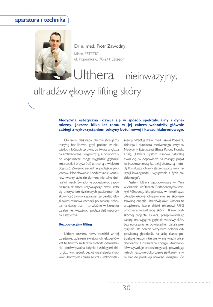 aparatura i technika Dr n. med. Piotr Zawodny Klinika ESTETIC ul. Kopernika 6, 70-241 Szczecin Ulthera – nieinwazyjny, ultradźwiękowy lifting skóry Medycyna estetyczna rozwija się w sposób spektakularny i dynamiczny. Jeszcze kilka lat temu w jej zakres wchodziły głównie zabiegi z wykorzystaniem toksyny botulinowej i kwasu hialuronowego. Owszem, dziś nadal chętnie stosujemy toksynę botulinową, gdyż podana w niewielkich ilościach sprawia, że twarz wygląda na zrelaksowaną i wypoczętą, a nowoczesne wypełniacze mogą wygładzić głębokie zmarszczki i przywrócić utraconą z wiekiem objętość. Zmieniło się jednak podejście pacjentów. Modelowanie i podkreślanie konturów twarzy stało się domeną nie tylko dojrzałych osób. Świadome podejście do zapobiegania skutkom upływającego czasu stało się priorytetem dzisiejszych pacjentów. Ich aktywność życiowa sprawia, że bardzo długi okres rekonwalescencji po zabiegu schodzi na dalszy plan. I to właśnie w kierunku działań nieinwazyjnych podąża dziś medycyna estetyczna. Bezoperacyjny lifting Ulthera otwiera nowy rozdział w tej dziedzinie, zdaniem światowych ekspertów jest to bardzo skuteczna metoda odmładzania, porównywalna jedynie z zabiegami chirurgicznymi, jednak bez użycia skalpela, skutków ubocznych i długiego czasu rekonwale- scencji. Według dra n. med. Jasona Poznera, chirurga i dyrektora medycznego Instytutu Medycyny Estetycznej (Boca Raton, Florida, USA), „Ulthera System stanowi naturalną ewolucję, w odpowiedzi na rosnący popyt na bezpieczniejszą, bardziej skuteczną metodę likwidującą objawy starzenia przy minimalizacji inwazyjności i wyłączenia z życia codziennego”. System Ulthera wyprodukowany w Mesa w Arizonie, w Stanach Zjednoczonych Ameryki Północnej, jako pierwszy w historii łączy ultradźwiękowe obrazowanie ze skoncentrowaną energią ultradźwięków. Ulthera to urządzenie, które dzięki ekranowi USG umożliwia wizualizację skóry i tkanki podskórnej pacjenta. Lekarz, przeprowadzając zabieg, ma wgląd w głębokie warstwy skóry bez naruszania jej powierzchni. Ustala precyzyjnie, ale przede wszystkim dobiera odpowiednią głębokość, na jakiej tkanka potrzebuje terapii i kieruje w nią wiązki ultradźwięków. Dostarczana energia ultradźwięków wywołuje proces koagulacji, powodując natychmiastowe obkurczenie się tkanek i stymuluje do produkcji nowego kolagenu. Co 30 A B Ryc. 1. Efekt zabiegu Ulthera. A – pacjentka przed zabiegiem, B – pacjentka 360 dni po zabiegu istotne – energia ultradźwięków działa głęboko, lecz pozostawia nienaruszony naskórek. Nasze ponad dwuletnie doświadczenie z tym systemem, kontrola, przewidywalność oraz niezwykła precyzja w wykonywaniu zabiegów gwarantują pacjentom wysoki poziom efektywności zabiegu. Oddziaływanie na różnych poziomach skóry Doświadczenie w przeprowadzanych terapiach odmładzających nauczyło nas holistycznego podejścia do pacjenta jako jednostki indywidualnej. Priorytetem naszych działań jest zaspokojenie potrzeb i oczekiwań pacjentów w każdym wieku. Terapia Ulthera może być zastosowana u pacjentów jako terapia zapobiegająca skutkom upływu czasu, jako kompleksowa terapia przeciwstarzeniowa lub terapia skojarzona. Ulthera posiada możliwość wykonania zabiegu na różnych poziomach tkanek. Obecnie w swojej ofercie wykorzystujemy zastosowanie systemu emitującego energię na trzech różnych głę- bokościach, co pozwala na równomiernie przemodelowanie tkanek. Tak dobrana terapia powoduje nie tylko oddziaływanie na fibroblasty (komórki, które wytwarzają kolagen i elastynę), ale również na powierzchniowy system mięśniowo-powięziowy, dając efekt liftingu. Po ponad dwuletniej pracy z terapią Ulthera standardem postępowania stała się praca na trzech głębokościach tkanek. Zastosowanie tego systemu pozwala na osiągnięcie celu, jakim jest napięcie tkanki podskórnej i uniesienia skóry. Już jeden zabieg może być wystarczający, aby osiągnąć zadowalający efekt, oczywiście uzależnione jest to od stanu skóry poddawanego zabiegowi i celów terapii. W trakcie aplikacji energii pacjent może odczuwać pewien dyskomfort, jednak jest to jedynie efekt tymczasowy. W przypadku osób, które posiadają niski próg bólu znieczulamy powierzchnię zabiegową. Skóra po zabiegu nie wymaga rekonwalescencji i można po nim od razu wrócić do codziennej aktywności. Na skórze może wystąpić jedynie łagodny rumień, utrzymujący się nie dłużej niż 2-3 godzin. 32 A B Ryc. 2. Efekt zabiegu Ulthera. A – pacjentka przed zabiegiem, B – pacjentka 360 dni po zabiegu Rezultaty zabiegu Ulthera przeciwdziała siłom grawitacji, zmniejsza narastające z wiekiem zwiotczenie tkanek. Efektem zabiegu wykonywanego na okolicy twarzy jest m.in. wyraźne uniesienie brwi i górnych powiek. Dzięki temu spojrzenie staje się bardziej otwarte, a twarz nabiera odświeżonego, młodszego wyrazu i wyglądu. Efekt liftingu w postaci podniesienia i zwiększenia napięcia skóry można także osiągnąć w innych newralgicznych obsza- 33 rach, które wpływają wyraźnie na kształt twarzy, podbródka, szyi oraz dekoltu. Modelowanie jest wyjątkowo precyzyjne, a odmładzanie skóry spektakularne. U wielu pacjentów już jeden zabieg sprawia, że widać zauważalne efekty. Skóra jest wygładzona, zmarszczki stają się mniej widoczne lub są zredukowane w znaczącym stopniu. Poprawia się napięcie i jędrność skóry – staje się ona wyraźnie bardziej elastyczna, sprężysta i jędrna. Terapia przy użyciu systemu Ulthera powoduje oddziaływanie, nie tylko na kolagen i elastynę, ale również na powierzchniowy system mięśniowo-powięziowy, którego efekty po zabiegu porównywalne są do liftingu twarzy. Trwałość efektu zależy od indywidualnych predyspozycji pacjenta. Lecz bezdyskusyjnie napięcie skóry zwiększa się przez pierwsze trzy miesiące po zabiegu (