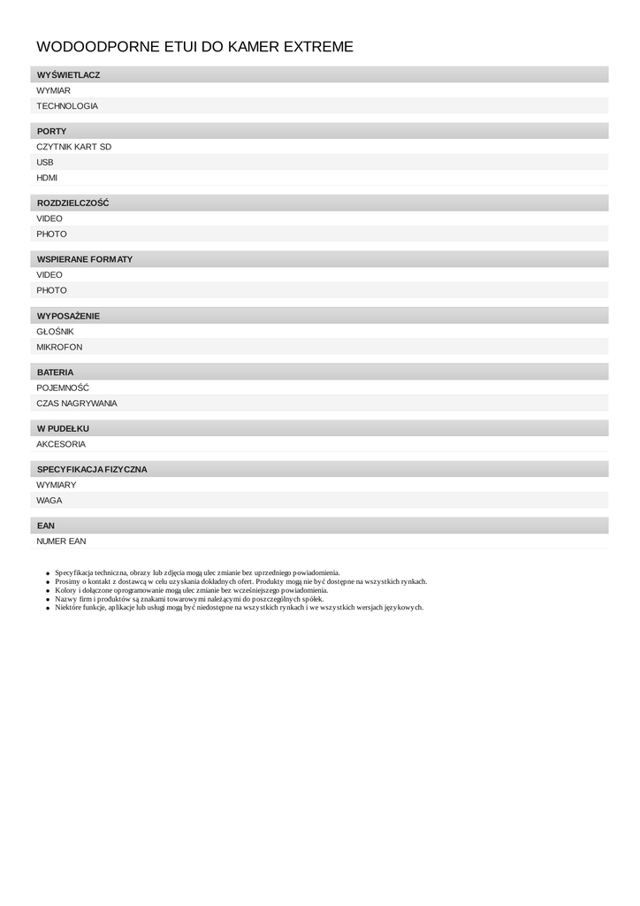 WODOODPORNE ETUI DO KAMER EXTREME WYŚWIETLACZ WYMIAR TECHNOLOGIA PORTY CZYTNIK KART SD USB HDMI ROZDZIELCZOŚĆ VIDEO PHOTO WSPIERANE FORM ATY VIDEO PHOTO WYPOSAŻENIE GŁOŚNIK MIKROFON BATERIA POJEMNOŚĆ CZAS NAGRYWANIA W PUDEŁKU AKCESORIA SPECYFIKACJA FIZYCZNA WYMIARY WAGA EAN NUMER EAN Specyfikacja techniczna, obrazy lub zdjęcia mogą ulec zmianie bez uprzedniego powiadomienia. Prosimy o kontakt z dostawcą w celu uzyskania dokładnych ofert. Produkty mogą nie być dostępne na wszystkich rynkach. Kolory i dołączone oprogramowanie mogą ulec zmianie bez wcześniejszego powiadomienia. Nazwy firm i produktów są znakami towarowymi należącymi do poszczególnych spółek. Niektóre funkcje, aplikacje lub usługi mogą być niedostępne na wszystkich rynkach i we wszystkich wersjach językowych.