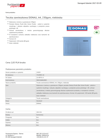 Starogard Gdański 2017-03-09 Karta produktu: Teczka zawieszkowa DONAU, A4, 230gsm, niebieska Wykonana z kartonu o gramaturze 230gsm Posiada Zielony Punkt (Der Grüne Punkt) - udział w systemie recyklingu i odzysku odpadów wynikający z przepisów prawa polskiego i UE Uchwyt zawieszkowy z metalu gwarantującego dłuższe użytkowanie produktu W komplecie ruchoma zakładka indeksowa oraz kartoniki do opisów Format: A4 Pojemność: 220 kartek (80 gsm) Kolor niebieski Cena 2,83 PLN brutto Podstawowe parametry produktu Numer produktu w systemie 15029 Nr dostawcy 7410905-10 Nr Celcen 21-00751-5 Kod kreskowy 9003106062805 Nazwa produktu Teczka zawieszkowa DONAU, A4, 230gsm, niebieska Opis Wykonana z kartonu o gramaturze 230gsm; posiada Zielony Punkt (Der Grüne Punkt) - udział w systemie recyklingu i odzysku odpadów wynikający z przepisów prawa polskiego i UE; uchwyt zawieszkowy z metalu gwarantującego dłuższe użytkowanie produktu; w komplecie ruchoma zakładka indeksowa oraz kartoniki do opisów; format: A4; pojemność: 220 kartek (80 gsm); kolor niebieski Kategoria Teczki zawieszkowe Klasa Standard Marka DONAU Cecha W ofercie od 2013-01 Rodzaj Kartonowy Przegrody B.d. Indeks B.d. Etykieta B.d. Okleina B.d. Hurtowania Papieru - Borma ul. Sambora 3 83-200 Starogard Gdański NIP: 592 10 36 627 REGON: 190916154 +48 (58) 56 221 37 Starogard Gdański 2017-03-09 Karta katalogowa produktu cd. Teczka zawieszkowa DONAU, A4, 230gsm, niebieska Kieszenie B.d. Produkt Teczka Materiał Karton Typ Standard Wymiary Format A4 Rozmiar B.d. Wymiary (mm) B.d. Grubość (mm) B.d. Gramatura (g/m2) 230 Ilość Ilość kartek B.d. Wspólny słownik zamówień CPV 22850000-3 Skoroszyty i podobne wyroby Certyfikaty Hit Hit Nowy produkt w ofercie Standard Kolor Kolor Niebieski Pozostałe zdjęcia produktu Serdecznie zapraszamy do współpracy Hurtowania Papieru - Borma zespół. Hurtowania Papieru - Borma ul. Sambora 3 83-200 Starogard Gdański NIP: 592 10 36 627 REGON: 190916154 +48 (58) 56 221 37