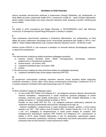 INFORMACJA PRZETARGOWA dotyczy sprzedaży nieruchomości położonej w miejscowości Chałupki Dębiańskie, woj. podkarpackie, na którą składa się prawo użytkowania działki 247/4 o powierzchni 0,2288 ha – obręb Chałupki Dębniańskie, gmina Leżajsk, powiat leżajski oraz prawo własności zabudowy trwale związanej z gruntem zlokalizowanej na w/w działce. I. Dla działki nr 247/4 prowadzona jest Księga Wieczysta nr RZ1E/00006303/4 przez Sąd Rejonowy w Łańcucie, IX Zamiejscowy Wydział Ksiąg Wieczystych z siedzibą w Leżajsku. II. Cena wywoławcza nieruchomości położonej w Chałupkach Dębniańskich, woj. podkarpackie, na którą składa się prawo użytkowania wieczystego gruntu oznaczonego geodezyjnie jako działka nr 247/4 o pow. 2 2288 m , obręb Chałupki Dębniańskie wraz z prawem własności zabudowy wynosi – 99 200,00 zł netto. Wadium wynosi 9 920,00 zł i jest wnoszone w pieniądzu na rachunek bankowy Sprzedającego wskazany w regulaminie przetargowym. III. 1.Na nieruchomości znajdują się obiekty budowlane podlegające sprzedaży: a) budynek stacyjny Grodzisko Dolne. Obiekt 2-kondygnacyjny, wolnostojący, podpiwniczony z nieużytkowym poddaszem; b) studnia kopana – rok budowy 1900; c) urządzenia oświetlenia placu rok budowy 1980; d) szambo 2. Na nieruchomości znajdują się niżej wymienione obiekty nie podlegające sprzedaży: a) urządzenia oświetlenia placu lampy będące własnością PKP PLK; częściowo IV. Po pozytywnym rozstrzygnięciu przetargu warunkiem zawarcia umowy sprzedaży będzie wyłączenie 2 przedmiotu sprzedaży z umowy najmu, która dotyczy pomieszczenia technicznego o powierzchni 8,75 m w budynku stacyjnym Grodzisko Dolne wykorzystywanego przez TK Telekom. V. W akcie notarialnym znajdą się następujące zapisy: na rzecz spółki PKP Polskie Linie Kolejowe S.A. i jej następców prawnych nabywca nieruchomości ustanowi nieodpłatną i nieograniczoną w czasie służebność gruntową polegającą na prawie przejazdu, przechodu przez działkę ewidencyjną nr 247/4, obręb Chałupki Dębniańskie w celu dostępu do peronu nr 1 (zlokalizowanego na działce nr 247/1); Ponadto na rzecz spółki PKP PLK S.A. i jej następców prawnych każdoczesny właściciel lub użytkownik wieczysty przedmiotowej nieruchomości zobowiąże się do tego, że: - ustanowi nieodpłatną i nieograniczoną w czasie służebność przesyłu, zgodnie z normą prawną 1 4 zawartą w art. 305 – 305 ustawy z dnia 23 kwietnia 1964 r. Kodeks Cywilny (Dz. U. Nr 16, poz. 93 z póź. zm.), polegającą na nieograniczonym w czasie prawie dostępu do urządzeń, kabli energetycznych stanowiących własności PKP Polskich Linii Kolejowych S.A. usytuowanych na działce nr 247/4, obręb Chałupki Dębniańskie w celu ich eksploatacji, wykonywania napraw, remontów, konserwacji, przebudowy, rozbudowy i modernizacji oraz prawie wykonywania wykopów, przekopów przez tę nieruchomość w wyżej wymienionych celach; - ustanowi nieodpłatne prawo użytkowania części działki nr 247/4, obręb Chałupki Dębniańskie polegające na nieograniczonym czasowo prawie dostępu, eksploatacji i konserwacji urządzeń, kabli energetycznych i srk będących własnością PKP Polskich Linii Kolejowych S.A., zlokalizowanych na obciążonej działce, - nie będzie występował w przyszłości z roszczeniami do PKP Polskie Linie Kolejowe S.A. lub każdorazowego Zarządcy linii kolejowej z tytułu uciążliwości wynikających z sąsiedztwa linii kolejowej; - wykona własnym kosztem i staraniem konieczne prace mające na celu dostosowanie do wszystkich obowiązujących i zmienionych w przyszłości przepisów, w tym m. in. w zakresie ochrony środowiska, ochrony przeciwpożarowej itp. jeśli takie prace będą wynikały z negatywnego oddziaływania na znajdującą się w sąsiedztwie linii kolejowej nieruchomość; - udostępnią teren bezpłatnie dla PKP Polskie Linie Kolejowe S.A. lub każdorazowego Zarządcy linii kolejowej dla celów utrzymaniowych, remontowych, inwestycyjnych oraz nie będą pobierali opłat za wszelkie uzgodnienia, pozwolenia itp.; - zobowiąże się do tego, że zagospodarowanie przedmiotowej działki oraz wykonywanie wszelkich robót ziemnych i budowlanych powinno być wykonane zgodnie z obowiązującymi przepisami, uzgodnione (wraz z projektem) z właściwą terytorialnie jednostką organizacyjną PKP Polskich Linii Kolejowych S.A.; - nie będzie adaptował budynku stacyjnego na budynek mieszkalny, co może skutkować problemem ochrony akustycznej przed hałasem i wibracjami związanymi z uwagi na położenie budynku dworca w odległości mniejszej niż wymagana w art. 53 ust. 1 i 2 ustawy o transporcie kolejowym; na rzecz spółki TK Telekom Sp. z o.o. i jej następców prawnych nabywca nieruchomości ustanowi nieodpłatną i nieograniczoną w czasie służebności przesyłu, zgodnie z normą prawną zawartą w art. 1 4 305 – 305 ustawy z dnia 23 kwietnia 1964 r. Kodeks Cywilny (Dz. U. Nr 16, poz. 93 z póź. zm.), polegająca na prawie wstępu na przedmiotową nieruchomość i wykonywania robót związanych z konserwacją, usuwaniem awarii oraz przebudową i modernizacją istniejącej infrastruktury tj. kanalizacji i kabla teletechnicznego. Dodatkowo obowiązuje zakaz wykonywania prac ziemnych, budowlanych, utwardzania terenu w pasie ułożenia kabla lub kanalizacji bez uprzedniego uzgodnienia z TK Telekom. Ponadto, powinien być zapewniony bezpłatny i nieograniczony w czasie dostęp do pomieszczenia technicznego dla potrzeb łączności (wraz z urządzeniami) dzierżawionego w budynku dworca Grodzisko Dolne. Prawo nieodpłatnego użytkowania ograniczone do części nieruchomości – wspomnianego pomieszczenia.; na rzecz spółki PKP Energetyka S.A. i jej następców prawnych nabywca nieruchomości ustanowi nieodpłatną i nieograniczoną w czasie służebność przesyłu, zgodnie z normą prawną zawartą w art. 1 4 305 – 305 ustawy z dnia 23 k