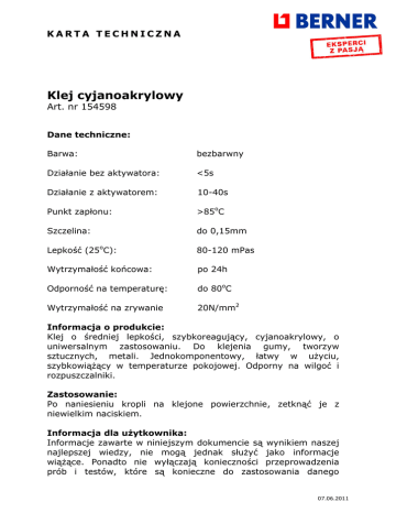 KARTA TECHNICZNA Klej cyjanoakrylowy Art. nr 154598 Dane techniczne: Barwa: bezbarwny Działanie bez aktywatora: <5s Działanie z aktywatorem: 10-40s Punkt zapłonu: >85oC Szczelina: do 0,15mm Lepkość (25oC): 80-120 mPas Wytrzymałość końcowa: po 24h Odporność na temperaturę: do 80oC Wytrzymałość na zrywanie 20N/mm2 Informacja o produkcie: Klej o średniej lepkości, szybkoreagujący, cyjanoakrylowy, o uniwersalnym zastosowaniu. Do klejenia gumy, tworzyw sztucznych, metali. Jednokomponentowy, łatwy w użyciu, szybkowiążący w temperaturze pokojowej. Odporny na wilgoć i rozpuszczalniki. Zastosowanie: Po naniesieniu kropli na klejone powierzchnie, zetknąć je z niewielkim naciskiem. Informacja dla użytkownika: Informacje zawarte w niniejszym dokumencie są wynikiem naszej najlepszej wiedzy, nie mogą jednak służyć jako informacje wiążące. Ponadto nie wyłączają konieczności przeprowadzenia prób i testów, które są konieczne do zastosowania danego 07.06.2011