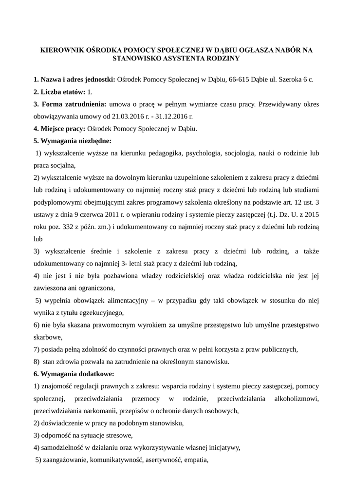 KIEROWNIK OŚRODKA POMOCY SPOŁECZNEJ W DĄBIU OGŁASZA NABÓR NA STANOWISKO ASYSTENTA RODZINY 1. Nazwa i adres jednostki: Ośrodek Pomocy Społecznej w Dąbiu, 66-615 Dąbie ul. Szeroka 6 c. 2. Liczba etatów: 1. 3. Forma zatrudnienia: umowa o pracę w pełnym wymiarze czasu pracy. Przewidywany okres obowiązywania umowy od 21.03.2016 r. - 31.12.2016 r. 4. Miejsce pracy: Ośrodek Pomocy Społecznej w Dąbiu. 5. Wymagania niezbędne: 1) wykształcenie wyższe na kierunku pedagogika, psychologia, socjologia, nauki o rodzinie lub praca socjalna, 2) wykształcenie wyższe na dowolnym kierunku uzupełnione szkoleniem z zakresu pracy z dziećmi lub rodziną i udokumentowany co najmniej roczny staż pracy z dziećmi lub rodziną lub studiami podyplomowymi obejmującymi zakres programowy szkolenia określony na podstawie art. 12 ust. 3 ustawy z dnia 9 czerwca 2011 r. o wpieraniu rodziny i systemie pieczy zastępczej (t.j. Dz. U. z 2015 roku poz. 332 z późn. zm.) i udokumentowany co najmniej roczny staż pracy z dziećmi lub rodziną lub 3) wykształcenie średnie i szkolenie z zakresu pracy z dziećmi lub rodziną, a także udokumentowany co najmniej 3- letni staż pracy z dziećmi lub rodziną, 4) nie jest i nie była pozbawiona władzy rodzicielskiej oraz władza rodzicielska nie jest jej zawieszona ani ograniczona, 5) wypełnia obowiązek alimentacyjny – w przypadku gdy taki obowiązek w stosunku do niej wynika z tytułu egzekucyjnego, 6) nie była skazana prawomocnym wyrokiem za umyślne przestępstwo lub umyślne przestępstwo skarbowe, 7) posiada pełną zdolność do czynności prawnych oraz w pełni korzysta z praw publicznych, 8) stan zdrowia pozwala na zatrudnienie na określonym stanowisku. 6. Wymagania dodatkowe: 1) znajomość regulacji prawnych z zakresu: wsparcia rodziny i systemu pieczy zastępczej, pomocy społecznej, przeciwdziałania przemocy w rodzinie, przeciwdziałania przeciwdziałania narkomanii, przepisów o ochronie danych osobowych, 2) doświadczenie w pracy na podobnym stanowisku, 3) odporność na sytuacje stresowe, 4) samodzielność w działaniu oraz wykorzystywanie własnej inicjatywy, 5) zaangażowanie, komunikatywność, asertywność, empatia, alkoholizmowi, 6) łatwość w nawiązywaniu kontaktów interpersonalnych, 7) umiejętność zachowania bezstronności w kontakcie z rodziną. 8) posiadanie prawo jazdy kat. B i własnego samochodu osobowego, 9) wysoka kultura osobista, 10) umiejętność prowadzenia pracy z klientem, w szczególności z klientem trudnym, 11) wiedza i doświadczenie w zakresie prawidłowego funkcjonowania rodziny, 12) znajomość lokalnego środowiska oraz umiejętność nawiązywania współpracy z innymi jednostkami i instytucjami. 7. Zakres zadań wykonywanych na stanowisku: 1. Do podstawowych obowiązków należeć będzie praca z rodziną w miejscu jej zamieszkania lub w miejscu wskazanym przez rodzinę. 2. Do zadań asystenta należy w szczególności: 1) opracowanie i realizacja planu pracy z rodziną we współpracy z członkami rodziny i w konsultacji z pracownikiem socjalnym, 2) udzielanie pomocy rodzinom w poprawie ich sytuacji życiowej, w tym w zdobywaniu umiejętności prawidłowego prowadzenia gospodarstwa domowego, 3) udzielanie pomocy rodzinom rozwiązywaniu problemów socjalnych, 4) udzielanie pomocy rodzinom w rozwiązywaniu problemów psychologicznych, 5) udzielanie pomocy rodzinom w rozwiązywaniu problemów wychowawczych z dziećmi, 6) wspieranie aktywności społecznej rodzin, 7) motywowanie członków rodziny do podnoszenia kwalifikacji zawodowych, 8) udzielenie pomocy w poszukiwaniu, podejmowaniu i utrzymaniu pracy zarobkowej, 9) podejmowanie działań interwencyjnych i zaradczych w sytuacjach zagrożenia bezpieczeństwa dzieci i rodzin, 10) prowadzenie indywidualnych konsultacji wychowawczych dla rodziców i dzieci, 11) prowadzenie dokumentacji pracy z rodziną 12) dokonywanie okresowej oceny sytuacji rodziny, 13) sporządzanie, na wniosek sądu, opinii o rodzinie i jej członkach, 14) współpraca z jednostkami administracji rządowej i samorządowej, właściwymi organizacjami pozarządowymi oraz innymi podmiotami i osobami specjalizującymi się w działaniach na rzecz dziecka i rodziny, 15) współpraca z zespołem interdyscyplinarnym lub grupą roboczą lub innymi podmiotami, których pomoc przy wykonywaniu zadań uzna się za niezbędną. 8. Wymagane dokumenty: 1) CV wraz z listem motywacyjnym 2) kserokopie dyplomów potwierdzających wykształcenie oraz kserokopie zaświadczeń o ukończonych kursach i szkoleniach, świadectw pracy, 3) kserokopię dowodu osobistego, 4) oświadczenie o niekaralności za przestępstwo popełnione umyślnie lub umyślne przestępstwo skarbowe, 5) oświadczenie o posiadaniu pełnej zdolności do czynności prawnych i korzystaniu z pełni praw publicznych 6) Oświadczenie kandydata o braku przeciwskazań pozwalającym mi na wykonywanie pracy na stanowisku asystenta rodziny, 7) Oświadczenie, że kandydat nie jestem pozbawiony władzy rodzicielskiej oraz władza rodzicielska nie jest mi zawieszona ani ograniczona. 8) oświadczenie, że kandydat wypełnia obowiązek alimentacyjny -w przypadku gdy taki obowiązek w stosunku do niego wynika z tytułu egzekucyjnego. 9. Dodatkowe informacje: Wymagane dokumenty aplikacyjne należy składać osobiście lub korespondencyjnie, w zamkniętej kopercie do Ośrodka Pomocy Społecznej w Dąbiu, 66-615 Dąbie ul. Szeroka 6c z dopiskiem nabór na stanowisko asystent rodziny w terminie do 21 marca 2016 r. do godz. 15.00. Aplikacje, które wpłyną do Ośrodka po wyżej określonym terminie nie będą rozpatrywane. Jednocześnie zastrzegamy sobie prawo kontaktu tylko z wybranymi kandydatami, którzy spełnią wymagania formalne zawarte w ogłoszeniu.