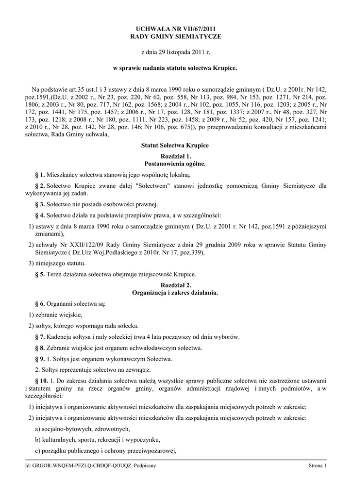 UCHWAŁA NR VII/67/2011 RADY GMINY SIEMIATYCZE z dnia 29 listopada 2011 r. w sprawie nadania statutu sołectwa Krupice. Na podstawie art.35 ust.1 i 3 ustawy z dnia 8 marca 1990 roku o samorządzie gminnym ( Dz.U. z 2001r. Nr 142, poz.1591,(Dz.U. z 2002 r., Nr 23, poz. 220, Nr 62, poz. 558, Nr 113, poz. 984, Nr 153, poz. 1271, Nr 214, poz. 1806; z 2003 r., Nr 80, poz. 717, Nr 162, poz. 1568; z 2004 r., Nr 102, poz. 1055, Nr 116, poz. 1203; z 2005 r., Nr 172, poz. 1441, Nr 175, poz. 1457; z 2006 r., Nr 17, poz. 128, Nr 181, poz. 1337; z 2007 r., Nr 48, poz. 327, Nr 173, poz. 1218; z 2008 r., Nr 180, poz. 1111, Nr 223, poz. 1458; z 2009 r., Nr 52, poz. 420, Nr 157, poz. 1241; z 2010 r., Nr 28, poz. 142, Nr 28, poz. 146; Nr 106, poz. 675)), po przeprowadzeniu konsultacji z mieszkańcami sołectwa, Rada Gminy uchwala, Statut Sołectwa Krupice Rozdział 1. Postanowienia ogólne. § 1. Mieszkańcy sołectwa stanowią jego wspólnotę lokalną. § 2. Sołectwo Krupice zwane dalej "Sołectwem" stanowi jednostkę pomocniczą Gminy Siemiatycze dla wykonywania jej zadań. § 3. Sołectwo nie posiada osobowości prawnej. § 4. Sołectwo działa na podstawie przepisów prawa, a w szczególności: 1) ustawy z dnia 8 marca 1990 roku o samorządzie gminnym ( Dz.U. z 2001 r. Nr 142, poz.1591 z późniejszymi zmianami), 2) uchwały Nr XXII/122/09 Rady Gminy Siemiatycze z dnia 29 grudnia 2009 roku w sprawie Statutu Gminy Siemiatycze ( Dz.Urz.Woj.Podlaskiego z 2010r. Nr 17, poz.339), 3) niniejszego statutu. § 5. Teren działania sołectwa obejmuje miejscowość Krupice. Rozdział 2. Organizacja i zakres działania. § 6. Organami sołectwa są: 1) zebranie wiejskie, 2) sołtys, którego wspomaga rada sołecka. § 7. Kadencja sołtysa i rady sołeckiej trwa 4 lata począwszy od dnia wyborów. § 8. Zebranie wiejskie jest organem uchwałodawczym sołectwa. § 9. 1. Sołtys jest organem wykonawczym Sołectwa. 2. Sołtys reprezentuje sołectwo na zewnątrz. § 10. 1. Do zakresu działania sołectwa należą wszystkie sprawy publiczne sołectwa nie zastrzeżone ustawami i statutem gminy na rzecz organów gminy, organów administracji rządowej i innych podmiotów, a w szczególności: 1) inicjatywa i organizowanie aktywności mieszkańców dla zaspakajania miejscowych potrzeb w zakresie: 2) inicjatywa i organizowanie aktywności mieszkańców dla zaspakajania miejscowych potrzeb w zakresie: a) socjalnobytowych, zdrowotnych, b) kulturalnych, sportu, rekreacji i wypoczynku, c) porządku publicznego i ochrony przeciwpożarowej, Id: GRGORWNQEMPFZLQCBDQFQOUQZ. Podpisany Strona 1 d) ochrony środowiska, 3) kształtowanie zasad współżycia społecznego, 4) sprawowanie kontroli społecznej dotyczącej spraw publicznych o znaczeniu miejscowoym, 5) opiniowanie projektów uchwał rady gminy w sprawach o podstawowym znaczeniu dla mieszkańców sołectwa lub innych sprawach w jakich o taką opinię wystąpi rada gminy, 6) występowanie do rady gminy o rozpatrzenie spraw publicznych sołectwa lub jego części, których załatwienie wykracza poza mozliwości sołectwa, 7) współpraca z radnymi , którzy kandydowali z okręgu w skład którego wchodzi sołectwo, 8) organizowanie przez mieszkańców sołectwa wspólnych prac społecznie użytecznych, 2. Sołectwo nie prowadzi samodzielnej gospodarki finansowej. 3. Sołectwo zarządza przyznanym mu mieniem komunalnym w zakresie zwykłego zarządu, w tym: 1) załatwia bieżące sprawy związane z eksploatacją mienia, 2) zapewnia utrzymanie mienia w stanie niepogorszonym. 4. Rada Gminy określa wysokość środków finansowych przeznaczonych w danym roku do dyspozycji sołectwa. § 11. Zadania sołectwa realizowane są poprzez: 1) podejmowanie uchwał przez zebranie wiejskie w sprawach należących do zakresu działania sołectwa, 2) wyrażanie opinii i występowanie z wioskami do organów gminy o rozpatrzenie spraw, których załatwienie wykracza poza możliwości mieszkańców sołectwa, 3) współuczestnictwo w organizowaniu przez organy gminy konsultacji, spotkań z mieszkańcami. Rozdział 3. Zebranie wiejskie. § 12. 1. Do kompetencji zebrania wiejskiego należy: 1) wybór i odwołanie sołtysa, rady sołeckiej lub jej poszczególnych członków, 2) opiniowanie spraw istotnych dla sołectwa i jego mieszkańców, 3) opiniowanie w części dotyczącej sołectwa przedstawionych do konsultacji projektów uchwał rady gminy, 4) wnioskowanie do rady gminy o ujęcie zadań do planu społecznogospodarczego w zakresie dotyczącym sołectwa, 2. Uchwały opinie, wnioski zebrania wiejskiego Sołtys przekazuje Wójtowi Gminy w ciągu 7 dni. 3. Wójt Gminy jest zobowiązany ustosunkować się do podejmowanych przez zebranie wiejskie uchwał, wniosków w terminie 30 dni od daty zgłoszenia ich na piśmie. § 13. Zebranie wiejskie wybiera, odwołuje sołtysa i radę sołecką, a także co najmniej raz w roku dokonuje oceny ich działalności. § 14. W zebraniu wiejskim biorą udział mieszkańcy sołectwa posiadający czynne prawo wyborcze do rad gmin. § 15. 1. Zebranie wiejskie zwoływane jest przez sołtysa z własnej inicjatywy lub na wniosek: 1) co najmniej 1/10 mieszkańcow uprawnionych do udziału w zebraniu, 2) Wójta Gminy, 3) Rady Gminy. 2. Termin i miejsce zebrania wiejskiego podaje sołtys do publicznej wiadomości w sposób przyjęty w sołectwie, na co najmniej 2 dni przed zebraniem. Id: GRGORWNQEMPFZLQCBDQFQOUQZ. Podpisany Strona 2 3. Zawiadomienie o zebraniu powinno zawierać informację na czyj wniosek zebranie jest zwołane, określenie daty, godziny i miejsca zebrania oraz proponowany porządek zebrania. 4. Projekt porządku obrad powinien być uzgodniony z radą sołecką. § 16. Zebranie wiejskie jest ważne, gdy zostało zwołane zgodnie z § 14 niniejszego statutu bez względu na ilość uczestniczących w nim mieszkańców. § 17. 1. Zebraniu wiejskiemu przewodniczy sołtys. 2. Zebranie może wybrać innego przewodniczącego obrad. § 18. Uchwały na zebraniu zap