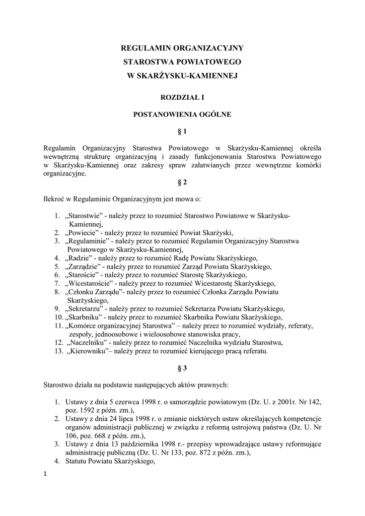 REGULAMIN ORGANIZACYJNY STAROSTWA POWIATOWEGO W SKARŻYSKU-KAMIENNEJ ROZDZIAŁ I POSTANOWIENIA OGÓLNE §1 Regulamin Organizacyjny Starostwa Powiatowego w Skarżysku-Kamiennej określa wewnętrzną strukturę organizacyjną i zasady funkcjonowania Starostwa Powiatowego w Skarżysku-Kamiennej oraz zakresy spraw załatwianych przez wewnętrzne komórki organizacyjne. §2 Ilekroć w Regulaminie Organizacyjnym jest mowa o: 1. „Starostwie” - należy przez to rozumieć Starostwo Powiatowe w SkarżyskuKamiennej, 2. „Powiecie” - należy przez to rozumieć Powiat Skarżyski, 3. „Regulaminie” - należy przez to rozumieć Regulamin Organizacyjny Starostwa Powiatowego w Skarżysku-Kamiennej, 4. „Radzie” - należy przez to rozumieć Radę Powiatu Skarżyskiego, 5. „Zarządzie” - należy przez to rozumieć Zarząd Powiatu Skarżyskiego, 6. „Staroście” - należy przez to rozumieć Starostę Skarżyskiego, 7. „Wicestaroście” - należy przez to rozumieć Wicestarostę Skarżyskiego, 8. „Członku Zarządu”- należy przez to rozumieć Członka Zarządu Powiatu Skarżyskiego, 9. „Sekretarzu” - należy przez to rozumieć Sekretarza Powiatu Skarżyskiego, 10. „Skarbniku” - należy przez to rozumieć Skarbnika Powiatu Skarżyskiego, 11. „Komórce organizacyjnej Starostwa” – należy przez to rozumieć wydziały, referaty, zespoły, jednoosobowe i wieloosobowe stanowiska pracy, 12. „Naczelniku” - należy przez to rozumieć Naczelnika wydziału Starostwa, 13. „Kierowniku”– należy przez to rozumieć kierującego pracą referatu. §3 Starostwo działa na podstawie następujących aktów prawnych: 1. Ustawy z dnia 5 czerwca 1998 r. o samorządzie powiatowym (Dz. U. z 2001r. Nr 142, poz. 1592 z późn. zm.), 2. Ustawy z dnia 24 lipca 1998 r. o zmianie niektórych ustaw określających kompetencje organów administracji publicznej w związku z reformą ustrojową państwa (Dz. U. Nr 106, poz. 668 z późn. zm.), 3. Ustawy z dnia 13 października 1998 r.- przepisy wprowadzające ustawy reformujące administrację publiczną (Dz. U. Nr 133, poz. 872 z późn. zm.), 4. Statutu Powiatu Skarżyskiego, 1 5. Regulaminu Organizacyjnego Starostwa Powiatowego w Skarżysku-Kamiennej. §4 1. Starostwo jest jednostką budżetową przy pomocy której Zarząd Powiatu wykonuje zadania Powiatu. 2. Siedzibą Starostwa jest miasto Skarżysko-Kamienna ul. Konarskiego 20. §5 Starostwo Powiatowe wykonuje określone ustawami: 1. 2. 3. 4. Zadania publiczne o charakterze ponadgminnym, Zadania z zakresu administracji rządowej, Wynikające z innych ustaw szczególnych, Zadania powierzone w drodze porozumień zawartych z organami administracji rządowej lub samorządowej, 5. Zadania wynikające z uchwał Rady i Zarządu Powiatu. §6 1. W swoich działaniach Starostwo kieruje się zasadami: praworządności, służebności wobec społeczności lokalnej, racjonalnego gospodarowania mieniem Powiatu, planowania pracy i podziału kompetencji, wzajemnego współdziałania oraz racjonalnego doboru wykwalifikowanej kadry. 2. Pracownicy Starostwa w wykonywaniu swoich obowiązków i zadań Starostwa działają na podstawie i w granicach prawa i zobowiązani są do ścisłego jego przestrzegania. 3. Zasady postępowania oraz standardy zachowania pracowników Starostwa związane z wykonywaniem przez nich obowiązków służbowych określa Kodeks Postępowania Etycznego Pracowników Starostwa Powiatowego w Skarżysku-Kamiennej. ROZDZIAŁ II STRUKTURA ZARZĄDZANIA §7 1. Kierownikiem Starostwa i zwierzchnikiem służbowym pracowników Starostwa jest Starosta, będący jednocześnie Przewodniczącym Zarządu Powiatu. 2. Starostę, Wicestarostę, Członków Zarządu wybiera Rada Powiatu w drodze uchwały. 3. Skarbnika Powiatu powołuje Rada Powiatu na wniosek Starosty. 4. Sekretarza Powiatu, Naczelników, Powiatowego Rzecznika Konsumentów i pracowników zatrudnia Starosta. 5. Starosta, Wicestarosta, Członkowie Zarządu, Sekretarz Powiatu i Skarbnik Powiatu kierują, zarządzają podległymi wydziałami oraz koordynują pracę jednostek organizacyjnych powiatu zgodnie z obowiązującym schematem organizacyjnym, który stanowi załącznik do niniejszego Regulaminu. 6. Wydziałami kierują Naczelnicy zatrudnieni przez Starostę. 2 7. Utworzonymi referatami kierują kierownicy, podlegający bezpośrednio Naczelnikowi wydziału. 8. Kierowanie danym referatem może być powierzone przez Starostę Naczelnikowi wydziału. 9. Naczelnicy wydziałów zapewniają zgodne z prawem wykonywanie przypisanych wydziałom zadań i w tym zakresie ponoszą odpowiedzialność przed Starostą. 10. Naczelnicy wydziałów i kierownicy odpowiedzialni są za: 1) należytą organizację komórek organizacyjnych, 2) bezpośredni nadzór nad poprawnym i sprawnym wypełnianiem obowiązków służbowych, 3) przyjmowanie i załatwianie spraw interesantów, 4) właściwe użytkowanie i zabezpieczanie powierzonego im mienia, 5) przestrzeganie dyscypliny budżetowej. 11. Naczelnicy wydziałów mogą zostać upoważnieni przez Starostę do prowadzenia i załatwiania w jego imieniu spraw, w tym do wydawania w jego imieniu decyzji administracyjnych, postanowień, pozwoleń, zezwoleń i zaświadczeń w indywidualnych sprawach z zakresu administracji publicznej należącej do zadań wydziału i stanowiących kompetencje Powiatu lub Starosty. ROZDZIAŁ III ORGANIZACJA STAROSTWA §8 1. Strukturę organizacyjną Starostwa ustala Starosta przy współudziale Wicestarosty, Członków Zarządu, Sekretarza i Skarbnika Powiatu. 2. Wewnętrznymi komórkami organizacyjnymi Starostwa są: wydziały, referaty, zespoły oraz stanowiska pracy. 3. Wydziały stanowią podstawowe komórki organizacyjne, zajmujące się określoną problematyką lub pokrewnymi zagadnieniami w sposób kompleksowy, których realizacja w jednej komórce organizacyjnej umożliwia prawidłowe zarządzanie. 4. Zespoły są komórkami organizacyjnymi niższego rzędu, które tworzy
