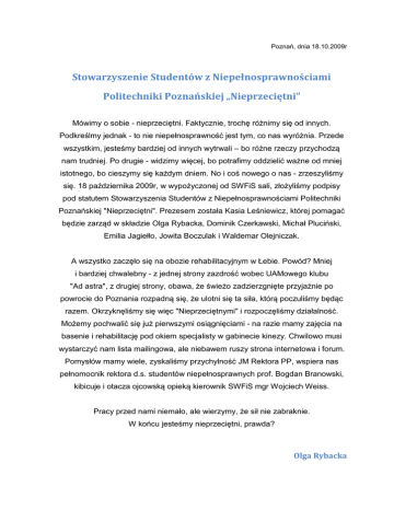 Poznań, dnia 18.10.2009r Stowarzyszenie Studentów z Niepełnosprawnościami Politechniki Poznańskiej „Nieprzeciętni” Mówimy o sobie - nieprzeciętni. Faktycznie, trochę różnimy się od innych. Podkreślmy jednak - to nie niepełnosprawność jest tym, co nas wyróżnia. Przede wszystkim, jesteśmy bardziej od innych wytrwali – bo różne rzeczy przychodzą nam trudniej. Po drugie - widzimy więcej, bo potrafimy oddzielić ważne od mniej istotnego, bo cieszymy się każdym dniem. No i coś nowego o nas - zrzeszyliśmy się. 18 października 2009r, w wypożyczonej od SWFiS sali, złożyliśmy podpisy pod statutem Stowarzyszenia Studentów z Niepełnosprawnościami Politechniki Poznańskiej "Nieprzeciętni". Prezesem została Kasia Leśniewicz, której pomagać będzie zarząd w składzie Olga Rybacka, Dominik Czerkawski, Michał Pluciński, Emilia Jagiełło, Jowita Boczulak i Waldemar Olejniczak. A wszystko zaczęło się na obozie rehabilitacyjnym w Łebie. Powód? Mniej i bardziej chwalebny - z jednej strony zazdrość wobec UAMowego klubu "Ad astra", z drugiej strony, obawa, że świeżo zadzierzgnięte przyjaźnie po powrocie do Poznania rozpadną się, że ulotni się ta siła, którą poczuliśmy będąc razem. Okrzyknęliśmy się więc "Nieprzeciętnymi" i rozpoczęliśmy działalność. Możemy pochwalić się już pierwszymi osiągnięciami - na razie mamy zajęcia na basenie i rehabilitację pod okiem specjalisty w gabinecie kinezy. Chwilowo musi wystarczyć nam lista mailingowa, ale niebawem ruszy strona internetowa i forum. Pomysłów mamy wiele, zyskaliśmy przychylność JM Rektora PP, wspiera nas pełnomocnik rektora d.s. studentów niepełnosprawnych prof. Bogdan Branowski, kibicuje i otacza ojcowską opieką kierownik SWFiS mgr Wojciech Weiss. Pracy przed nami niemało, ale wierzymy, że sił nie zabraknie. W końcu jesteśmy nieprzeciętni, prawda? Olga Rybacka