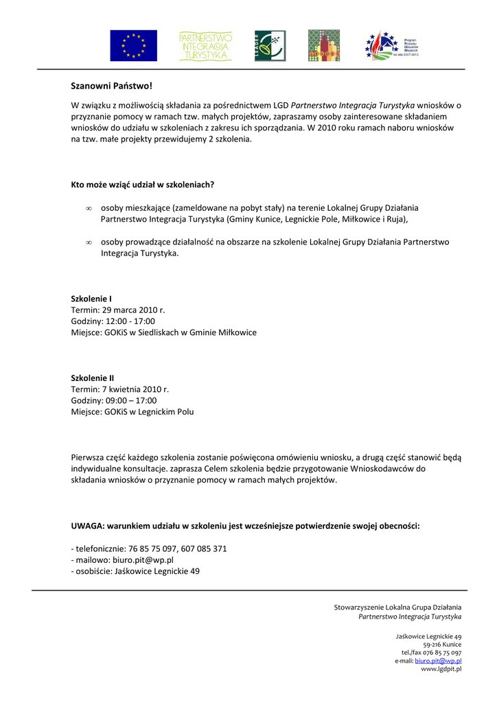 Szanowni Państwo! W związku z możliwością składania za pośrednictwem LGD Partnerstwo Integracja Turystyka wniosków o przyznanie pomocy w ramach tzw. małych projektów, zapraszamy osoby zainteresowane składaniem wniosków do udziału w szkoleniach z zakresu ich sporządzania. W 2010 roku ramach naboru wniosków na tzw. małe projekty przewidujemy 2 szkolenia. Kto może wziąć udział w szkoleniach? • osoby mieszkające (zameldowane na pobyt stały) na terenie Lokalnej Grupy Działania Partnerstwo Integracja Turystyka (Gminy Kunice, Legnickie Pole, Miłkowice i Ruja), • osoby prowadzące działalność na obszarze na szkolenie Lokalnej Grupy Działania Partnerstwo Integracja Turystyka. Szkolenie I Termin: 29 marca 2010 r. Godziny: 12:00 - 17:00 Miejsce: GOKiS w Siedliskach w Gminie Miłkowice Szkolenie II Termin: 7 kwietnia 2010 r. Godziny: 09:00 – 17:00 Miejsce: GOKiS w Legnickim Polu Pierwsza część każdego szkolenia zostanie poświęcona omówieniu wniosku, a drugą część stanowić będą indywidualne konsultacje. zaprasza Celem szkolenia będzie przygotowanie Wnioskodawców do składania wniosków o przyznanie pomocy w ramach małych projektów. UWAGA: warunkiem udziału w szkoleniu jest wcześniejsze potwierdzenie swojej obecności: - telefonicznie: 76 85 75 097, 607 085 371 - mailowo: [email protected] - osobiście: Jaśkowice Legnickie 49 Stowarzyszenie Lokalna Grupa Działania Partnerstwo Integracja Turystyka Jaśkowice Legnickie 49 59-216 Kunice tel./fax 076 85 75 097 e-mali: [email protected] www.lgdpit.pl
