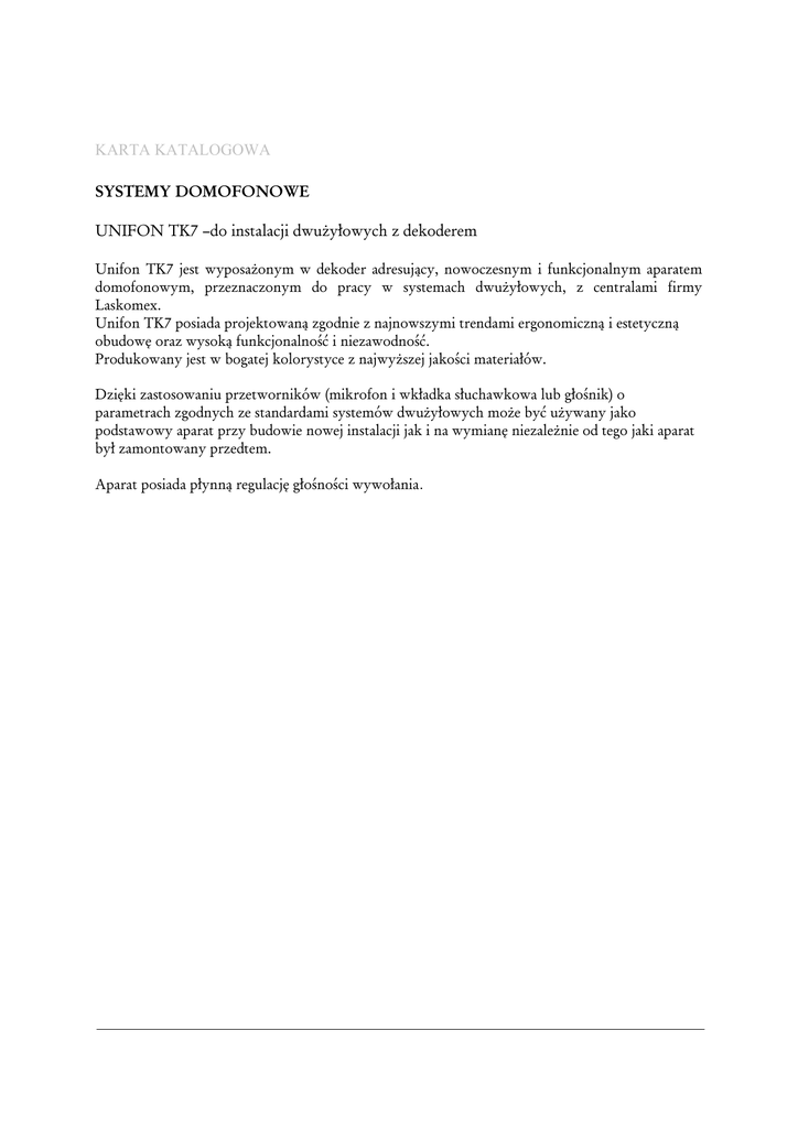 KARTA KATALOGOWA SYSTEMY DOMOFONOWE UNIFON TK7 –do instalacji dwużyłowych z dekoderem Unifon TK7 jest wyposażonym w dekoder adresujący, nowoczesnym i funkcjonalnym aparatem domofonowym, przeznaczonym do pracy w systemach dwużyłowych, z centralami firmy Laskomex. Unifon TK7 posiada projektowaną zgodnie z najnowszymi trendami ergonomiczną i estetyczną obudowę oraz wysoką funkcjonalność i niezawodność. Produkowany jest w bogatej kolorystyce z najwyższej jakości materiałów. Dzięki zastosowaniu przetworników (mikrofon i wkładka słuchawkowa lub głośnik) o parametrach zgodnych ze standardami systemów dwużyłowych może być używany jako podstawowy aparat przy budowie nowej instalacji jak i na wymianę niezależnie od tego jaki aparat był zamontowany przedtem. Aparat posiada płynną regulację głośności wywołania. KARTA KATALOGOWA 1. Dane techniczne: Wkładka słuchawkowa o impedancji ok.50 - 140 Ohm, - Przycisk otwierania zamka i przycisk funkcyjny, max napięcie 24V przy maksymalnym prądzie wynoszącym 1A - Wymiary: wys. 205 mm, szer. 80 mm, gł. 50 mm. - Zakres temperatur pracy -5 do +45 °C - Waga: 250 g. 2. Okablowanie: - - Dwużyłowe spolaryzowane (+-) Typ kabla: YTDY 2 x 0,5 YTKSY 2 x 0,5