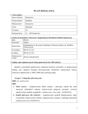 PLAN DZIAŁANIA 1. Adres gminy Nazwa Gminy Sosnowica Województwo lubelskie Miejscowość Sosnowica Ulica Spokojna Nr domu 10 Kod pocztowy 21 – 230 Sosnowica 2. Osoba do kontaktów roboczych z Regionalnym Ośrodkiem Polityki Społecznej Dorota Imię Nazwisko Wojno Stanowisko Podinspektor ds. Rozwoju Lokalnego i Promocji Gminy, ds. Środków Pomocowych Nr telefonu 082 59 12 152 Nr faksu 082 59 12 152 Adres poczty e-mail [email protected] 3. Ogólny opis zaplanowanych usług społecznych (ok. 500 znaków) Zgodnie z potrzebami społecznymi, ustalonymi podczas warsztatów ze społecznością lokalną oraz zapisami Strategii Rozwiązywania Problemów Społecznych Gminy Sosnowica zaplanowano w 2008 i 2009 roku realizację usług: Grupa I - Usługi dla osób starszych: 2008: nie zrealizowano 2009: 1. Klub seniora - zorganizowanie klubu tradycji i zdrowego seniora dla osób starszych, miłośników tradycji, kultywowania ginących zawodów, równieŜ organizowanie spotkań, pogadanek . (zaplanowany koszt sługi - 16.000,00 zł); 2. Zespół śpiewaczy dla seniorów – organizowanie spotkań integracyjnych, zajęć z muzykiem, kultywowanie tradycji, organizowania wyjazdu, wspólnego śpiewania (zaplanowany koszt 10.000,00 zł). 1 Grupa II - Usługi dla dzieci i młodzieŜy 2008: nie zrealizowano 2009: 1. Aktywni rodzice dzieciom – utworzenie grupy rodziców, która wspólnie przygotuje program i podejmie się działań organizacyjnych imprezy integracyjnej z okazji dnia dziecka (zaplanowany koszt usługi 7.000,00 zł); 2. Wolontariat w gminie – utworzenie grupy integracyjnej, stworzenie struktur pomocy woluntarystycznej przez doświadczonego instruktora, podejmowanie równieŜ działań na rzecz lokalnej społeczności, w tym współpraca w ramach realizacji innych usług PPWOW ( zaplanowany koszt - 7.000,00 zł); 3. Zajęcia integracyjne młodzieŜy w świetlicach wiejskich podczas wakacji – zagospodarowanie czasu wolnego w okresie wakacyjnym, w tym równieŜ organizowanie działań, w trakcie których dzieci i młodzieŜ będzie nabywała nowych umiejętności, zasad współdziałania w grupie na rzecz innych (przewidziany koszt usługi 12.000,00 zł). Grupa III - Usługi dla rodzin: 2008: nie zrealizowano 2009: 1. Gminne Centrum Rozwoju Rodzin – wsparcie dla rodzin w trudnych sytuacjach Ŝyciowych poprzez usługi psychologiczne, usługi prawne. Zorganizowanie równieŜ cyklu szkoleń np.: warsztaty przedsiębiorczości, sprzedaŜ bezpośrednia, mała gastronomia w turystyce wiejskiej (planowany koszt usługi 26.000,00 zł). Grupa IV - Usługi łączone dla dzieci i młodzieŜy, osób starszych oraz rodzin: 2008: 1. Rozwijanie i wspomaganie istniejących świetlic wiejskich – 31.728,95 zł; 2. Zagospodarowanie czasu wolnego całej społeczności gminy - 7.000,00 zł; 3. Aktywizacja społeczna kobiet – 3.911,87 zł. 2009: 4. Wigilia Sosnowicka – zorganizowanie wigilii dla całej społeczności gmin np.: pod gołym niebem z choinką (zaplanowany koszt usługi 5.332,32 zł.) 2 Grupa V - Wsparcie szkoleniowe 2008; nie zrealizowano 2009: 1. Wsparcie szkoleniowe w zakresie między innymi budowania partnerstwa, wolontariatu, Projektów (planowany koszt usługi 13.997,02 zł). 4. Czy planowane usługi są zgodne z zapisami w planach strategicznych gminy (w tym w strategii rozwiązywania problemów społecznych, jeśli istnieje)? TAK Proszę zacytować odpowiednie zapisy: 19 listopada 2008 roku została zatwierdzona Gminna Strategia Rozwiązywania Problemów Społecznych przez Radą Gminę Sosnowica Uchwałą Nr XXI/148/08. 7 stycznia 2008 roku Regionalny Ośrodek Polityki Społecznej w Lublinie zatwierdził zaktualizowaną Strategię Rozwiązywania Problemów Społecznych Gminy Sosnowica, która jest zgodna z wymogami Podręcznika Realizacji Programu PoniŜsze usługi zrealizowane w 2008 roku oraz planowane w 2009 roku wpisują się w zakres w/w Strategii w poszczególne obszary priorytetowe polityki społecznej w Gminie Sosnowica: 1. Pomoc społeczna, zdrowia i bezpieczeństwo mieszkańców 2. Edukacja i rynek pracy, kultura i rekreacja 3. Aktywność społeczna i integracja poprzez określone cele strategiczne, w które usługi się wpisują: Grupa I - Usługi dla osób starszych: 1. Klub seniora – wpisuje się w cel strategiczny „Zmniejszenie poziomu bezradności i izolacji społecznej” (str.100) oraz w cel strategiczny „Organizowanie czasu wolnego mieszkańcom” (str.105) 2. Zespół śpiewaczy dla seniorów – usługa wpisuje się w cel strategiczny: „Zmniejszenie poziomu bezradności i izolacji społecznej” (ztr.100) oraz w cel strategiczny „Kultowanie tradycji i obyczajów” (str.105) 3 Grupa II - Usługi dla dzieci i młodzieŜy 1. Aktywni rodzice dzieciom usługa wpisuje się w cel strategiczny „organizowanie czasu wolnego mieszkańcom” (str.105) 2. Wolontariat w gminie usługa wpisuje się w cel strategiczny „zmniejszenie poziomu bezradności i izolacji społecznej” (str.100) jak równieŜ moŜna wpisać w cel strategiczny „Aktywizacja i integracja społeczna” 3. Zajęcia integracyjne młodzieŜy w świetlicach wiejskich podczas wakacji – usługa wpisuje się z cel strategiczny „Poprawa bezpieczeństwa” Grupa III - Usługi dla rodzin: 1. Gminne Centrum Rozwoju Rodzin – usługa wpisuje się w cel strategiczny „Zwiększenie aktywności zawodowej i społecznej” (str.101), usługa równieŜ wpisuje się w inne cele strategiczne „Profilaktyka i rozwiązywania problemów z nałogiem” (str.102), „Zwiększenie aktywności zawodowej i społecznej” oraz „Kształtowanie przedsiębiorczości” (str.103) Grupa IV - Usługi łączone dla dzieci i młodzieŜy, osób starszych oraz rodzin: 1. Rozwijanie i wspomaganie istniejących świetlic wiejskich usługa wpisuje się w cel strategiczny „Aktywizacja i integracja społeczna” (str.104-105) 2. Zagospodarowanie czasu wolnego całej społeczności gminy usługa wpisuje się w cele strateg