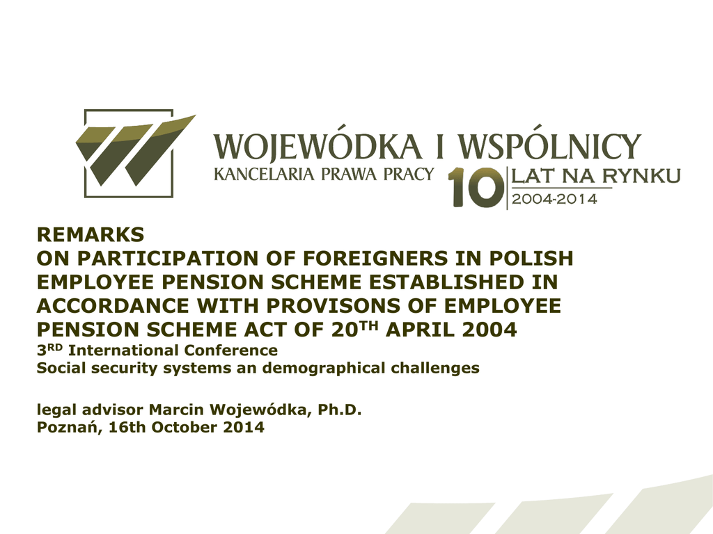 REMARKS ON PARTICIPATION OF FOREIGNERS IN POLISH EMPLOYEE PENSION SCHEME ESTABLISHED IN ACCORDANCE WITH PROVISONS OF EMPLOYEE PENSION SCHEME ACT OF 20TH APRIL 2004 3RD International Conference Social security systems an demographical challenges legal advisor Marcin Wojewódka, Ph.D. Poznań, 16th October 2014 Pension system in Poland MANDATORY PILLARS I PILLAR II PILLAR VOLUNTARY PILLARS III PILLAR EMPLOYEE PENSIONSCHEMES (EPS) SOCIAL SECURITY FUND OPEN PENSION FUND INDIVIDUAL PENSION ACCOUNTS (IKE) INDIVIDUAL PENSION PROVIDENCE ACCOUNT (IKZE) 2 ACCESSION OF FOREIGNERS TO EPS 3 Legal conditions of accession to EPS Art. 5 ust. 1 of the Employee Pension Scheme Act Prawo do uczestnictwa w programie przysługuje pracownikowi, który jest zatrudniony u danego pracodawcy, nie krócej niż 3 miesiące, chyba że umowa zakładowa stanowi inaczej. Right to participium – an employee, who is employed by the employer for not less than three months, has a right to participate in the program, unless the company pension agreement provides otherwise. 4 Legal conditions of accession to EPS Art. 2 pkt 2) of the Employee Pension Scheme Act Pracownik – osoba zatrudniona, w pełnym lub niepełnym wymiarze czasu pracy, na podstawie umowy o pracę, powołania, wyboru, mianowania, spółdzielczej umowy o pracę, osoba zatrudniona na podstawie umowy zawartej w wyniku powołania lub wyboru do organu reprezentującego osobę prawną oraz członek rolniczej spółdzielni produkcyjnej lub spółdzielni kółek rolniczych; Employee - a person employed full-time or part-time work, on the basis of a contract of employment, appointment, election, appointment, co-operative labor contract, a person employed under a contract as a result of appointment or election to a body representing a legal person and a member of an agricultural cooperative production or cooperative agricultural circles; 5 Legal conditions of accession to EPS Art. 18 ust. 1 of the Employee Pension Scheme Act Przystąpienie pracownika do programu na warunkach określonych w umowie zakładowej następuje na podstawie pisemnej deklaracji o przystąpieniu do programu, zwanej dalej „deklaracją”, po upływie jednego miesiąca od jej złożenia, chyba że pracodawca potwierdzi na piśmie przystąpienie do programu w terminie wcześniejszym. Accession of the employee to the EPS takes place under the conditions set forth in the company pension agreement on the basis of a written declaration to join the program, hereinafter referred to as "declaration", after one month of its submission, unless the employer confirms in writing to join the program at an earlier date. 6 AGENDA 1. ACCESSION OF FOREIGNERS TO EPS 2. CONDITIONS OF PARTICIPATION OF FOREIGNERS IN EPS 3. WITHDRAWAL OF FUNDS FROM EPS BY FOREIGNERS 7 Legal conditions of accession to EPS Any person intending to join the EPS must meet the following conditions: To be an employee of an employer running the EPS, Meet the criteria of length of service specified in the company pension agreement (umowa zakładowa), Deliver to the employer declaration of accession to the EPP. 8 Legal conditions of accession to EPS Art. 5 ust. 6 of the Employee Pension Scheme Act Umowa zakładowa nie może przewidywać dla uczestnictwa pracowników w programie żadnych innych warunków poza określonymi ustawą. Company pension agreement may not provide for employee participation in the EPS any other conditions than those specified by the Act on EPS. 9 Legal conditions of accession to EPS of foreigners Conditions of joining the EPS are uniform for all employees. There are no provisions in the Employee Pension Scheme Act that would permit the employer to differentiate in any way joining the citizens of other countries (ie. Citizens of European Union countries or citizens of non-EU countries) to the EPS program in Poland. A foreigner that fulfills the conditions for accession to the EPS is in no way limited with the possibility of accession to EPS in Poland. 10 CONDITIONS OF PARTICIPATION OF FOREIGNERS IN EPS 11 Basic premium paid to EPS Art. 24 ust. 2 of the Employee Pension Scheme Act Kwota wpłacanej składki podstawowej nie może wynagrodzenia uczestnika. przekroczyć 7% The amount of the paid basic premium may not exceed 7% of salary of the participating employee. Art. 2 pkt 15) of the Employee Pension Scheme Act wynagrodzenie – podstawę wymiaru składek na ubezpieczenie emerytalne i rentowe uczestnika w rozumieniu ustawy z dnia 13 października 1998 r. o systemie ubezpieczeń społecznych (Dz. U. z 2013 r. poz. 1442, z późn. zm.10)), bez stosowania ograniczenia, o którym mowa w art. 19 ust. 1 tej ustawy; salary - the contribution basis to the pension scheme participant within the meaning of the Act of 13 October 1998. social insurance system (Journal. Laws of 2013. pos. 1442, as amended. zm.10)), without the use of restriction referred to in art. Paragraph 19. 1 of the Act; 12 Condition for foriegner to be a subject of social security in Poland The employer of the employee participating in the EPS is obliged to pay the basic premium, the amount of which is set up in company pension agreement. However the condition for payment by the employer of the basic contribution is that a participating employee receives a salary from this employer within the meaning of the Act on PPE. And as the per definition in Act of EPS the salary is only the amount that are basis of contributions for compulsory social security – thus the foreigner to be the actual beneficiary of the EPS must be subject to social insurance in Poland. 13 Lack of possibility of differentiate the conditions of participation There are no such provisions in the Employee Pension Scheme Act that would permit to differentiate in any way conditions of participation of any group of participants. It means that this is as well impossible to differentiate the conditions of the participation of the citizens of other countries (ie. Citizens of European Union countries 