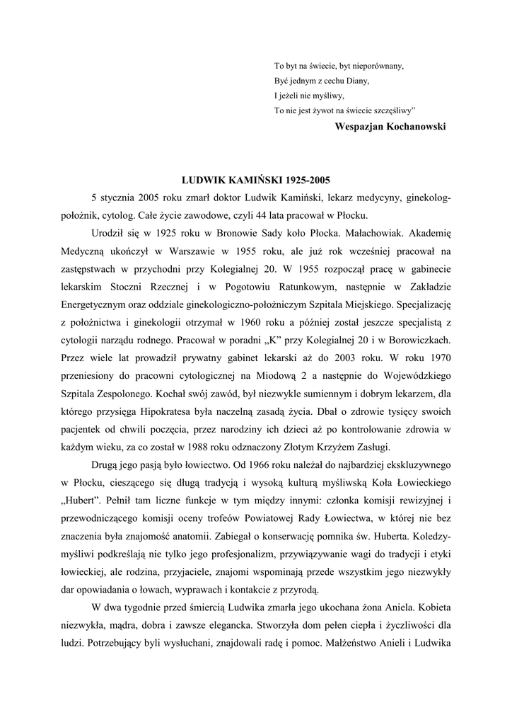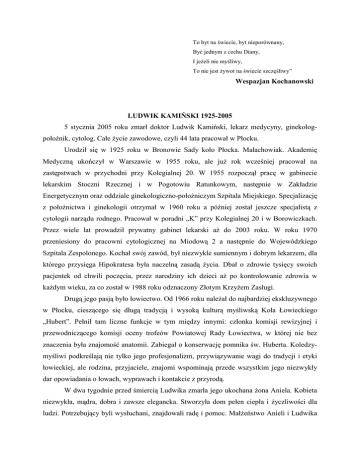 To byt na świecie, byt nieporównany, Być jednym z cechu Diany, I jeżeli nie myśliwy, To nie jest żywot na świecie szczęśliwy” Wespazjan Kochanowski LUDWIK KAMIŃSKI 1925-2005 5 stycznia 2005 roku zmarł doktor Ludwik Kamiński, lekarz medycyny, ginekologpołożnik, cytolog. Całe życie zawodowe, czyli 44 lata pracował w Płocku. Urodził się w 1925 roku w Bronowie Sady koło Płocka. Małachowiak. Akademię Medyczną ukończył w Warszawie w 1955 roku, ale już rok wcześniej pracował na zastępstwach w przychodni przy Kolegialnej 20. W 1955 rozpoczął pracę w gabinecie lekarskim Stoczni Rzecznej i w Pogotowiu Ratunkowym, następnie w Zakładzie Energetycznym oraz oddziale ginekologiczno-położniczym Szpitala Miejskiego. Specjalizację z położnictwa i ginekologii otrzymał w 1960 roku a później został jeszcze specjalistą z cytologii narządu rodnego. Pracował w poradni „K” przy Kolegialnej 20 i w Borowiczkach. Przez wiele lat prowadził prywatny gabinet lekarski aż do 2003 roku. W roku 1970 przeniesiony do pracowni cytologicznej na Miodową 2 a następnie do Wojewódzkiego Szpitala Zespolonego. Kochał swój zawód, był niezwykle sumiennym i dobrym lekarzem, dla którego przysięga Hipokratesa była naczelną zasadą życia. Dbał o zdrowie tysięcy swoich pacjentek od chwili poczęcia, przez narodziny ich dzieci aż po kontrolowanie zdrowia w każdym wieku, za co został w 1988 roku odznaczony Złotym Krzyżem Zasługi. Drugą jego pasją było łowiectwo. Od 1966 roku należał do najbardziej ekskluzywnego w Płocku, cieszącego się długą tradycją i wysoką kulturą myśliwską Koła Łowieckiego „Hubert”. Pełnił tam liczne funkcje w tym między innymi: członka komisji rewizyjnej i przewodniczącego komisji oceny trofeów Powiatowej Rady Łowiectwa, w której nie bez znaczenia była znajomość anatomii. Zabiegał o konserwację pomnika św. Huberta. Koledzymyśliwi podkreślają nie tylko jego profesjonalizm, przywiązywanie wagi do tradycji i etyki łowieckiej, ale rodzina, przyjaciele, znajomi wspominają przede wszystkim jego niezwykły dar opowiadania o łowach, wyprawach i kontakcie z przyrodą. W dwa tygodnie przed śmiercią Ludwika zmarła jego ukochana żona Aniela. Kobieta niezwykła, mądra, dobra i zawsze elegancka. Stworzyła dom pełen ciepła i życzliwości dla ludzi. Potrzebujący byli wysłuchani, znajdowali radę i pomoc. Małżeństwo Anieli i Ludwika Kamińskich można stawiać za wzór. Nie mogli bez siebie żyć. Pozostawili syna Piotra, synową i dwóch wnuków, z których zawsze byli dumni. Zranione przez wiele zawałów serce nie wytrzymało bólu rzeczywistości. Cześć Jego pamięci. Barbara Kacer