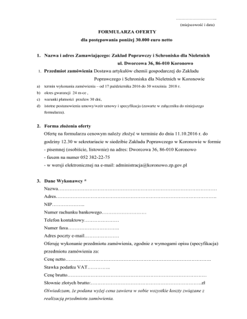 ………………………... (miejscowość i data) FORMULARZA OFERTY dla postępowania poniżej 30.000 euro netto 1. Nazwa i adres Zamawiającego: Zakład Poprawczy i Schronisko dla Nieletnich ul. Dworcowa 36, 86-010 Koronowo 1. Przedmiot zamówienia Dostawa artykułów chemii gospodarczej do Zakładu Poprawczego i Schroniska dla Nieletnich w Koronowie a) termin wykonania zamówienia – od 17 października 2016 do 30 września 2018 r. b) okres gwarancji 24 m-ce , c) warunki płatności przelew 30 dni, d) istotne postanowienia umowy/wzór umowy i specyfikacja (zawarte w załączniku do niniejszego formularza). 2. Forma złożenia oferty Ofertę na formularzu cenowym należy złożyć w terminie do dnia 11.10.2016 r. do godziny 12.30 w sekretariacie w siedzibie Zakładu Poprawczego w Koronowie w formie - pisemnej (osobiście, listownie) na adres: Dworcowa 36, 86-010 Koronowo - faxem na numer 052 382-22-75 - w wersji elektronicznej na e-mail: [email protected] 3. Dane Wykonawcy * Nazwa…………………………………………………………………………………… Adres……………………………………………………………………………………. NIP……………….. Numer rachunku bankowego……………………… Telefon kontaktowy………………… Numer faxu…………………………. Adres poczty e-mail………………… Oferuję wykonanie przedmiotu zamówienia, zgodnie z wymogami opisu (specyfikacja) przedmiotu zamówienia za: Cenę netto……………………………………………………………………………. Stawka podatku VAT………….. Cenę brutto………………………………………………………………………… Słownie złotych brutto:………………………………………………………….zł Oświadczam, że podana wyżej cena zawiera w sobie wszystkie koszty związane z realizacją przedmiotu zamówienia. Deklaruję ponadto: - termin realizacji umowy ……….. - okres gwarancji………… - warunki płatności………. Oświadczam, że: - zapoznałem się z opisem przedmiotu zamówienia oraz treścią wzoru umowy i nie wnoszę do nich zastrzeżeń - w razie wybrania mojej oferty zobowiązuję się do realizacji zamówienia na warunkach określonych w formularzu ofertowym i umowie, w miejscu i terminie określonym przez Zamawiającego. Załącznikami do niniejszego formularza oferty stanowiącymi integralną część oferty są: 1. Oświadczenie o posiadaniu o odpowiedniej kadry i odpowiednich środków do zrealizowania dostawy. 2. Oświadczenie o prowadzeniu działalności gospodarczej. …………………………………. (podpis i pieczęć Wykonawcy lub osoby uprawnionej do reprezentowania Wykonawcy) * Wypełnia Wykonawca RŻ