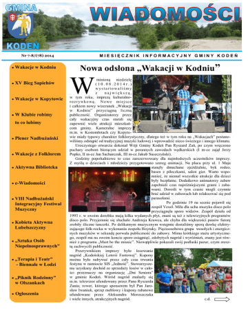 MIESIĘCZNIK INFORMACYJNY GMINY KODEŃ Nr 7-8/(78) 2014 Wakacje w Kodniu XV Bieg Sapiehów Wakacje w Kopytowie W Klubie robimy to co lubimy Plener Nadbużański Wakacje z Folklorem Aktywna Biblioteka e-Wiadomości VIII Nadbużański Integracyjny Festiwal Muzyczny Kobieta Aktywna Lubelszczyzny „Sztuka Osób Niepełnosprawnych” „Terapia i Teatr” - Biennale w Łodzi „Piknik Rodzinny” w Olszankach Ogłoszenia Nowa odsłona „Wakacji w Kodniu” W minioną niedzielę (10.08.2014r.) wystartowaliśmy z największą, w tym roku, imprezą kulturalnor o z r y wk o wą . N o we m i ej s c e i całkiem nowy wizerunek „Wakacji w Kodniu” przyciągną liczną publiczność. Organizatorzy przez cały wakacyjny czas starali się zapewnić wiele atrakcji mieszkańcom gminy. Kameralne imprezy m.in. w Kostomłotach czy Kopytowie miały typowy charakter folklorystyczny, dlatego też w tym roku na „Wakacjach” postanowiliśmy odstąpić od tradycyjnej muzyki ludowej i wprowadzić nieco świeżego i innego klimatu. Uroczystego otwarcia dokonał Wójt Gminy Kodeń Pan Ryszard Zań, po czym wręczono puchary osobom biorącym udział w porannych zawodach wędkarskich (I m-ce zajął Jerzy Popko, II m-ce Jan Sacharczuk, III m-ce Jakub Suszczyński). Godziny popołudniowe to czas zarezerwowany dla najmłodszych uczestników imprezy. Z myślą o dzieciach i młodzieży przygotowano szereg animacji. Na placu przy ul. 1 Maja stanęły dmuchane zjeżdżalnie, byk rodeo, basen z piłeczkami, salon gier. Warto wspomnieć, że niemal wszystkie atrakcje dla dzieci były bezpłatne. Dodatkowo animatorzy zabaw zapełniali czas najróżniejszymi grami i zabawami. Dorośli w tym czasie mogli czynnie brać udział w zabawach lub relaksować się pod parasolami. Po godzinie 19 na scenie pojawił się zespół Vexel. Miła dla ucha muzyka disco polo przyciągnęła sporo widzów. Zespół działa od 1993 r. w swoim dorobku mają kilka wydanych płyt, znani są też z telewizyjnych programów disco polo. Przyjemnie się słuchało Andrzeja Krawca, ale chyba dla większości panów furorę zrobiły śliczne tancerki. Po delikatnym muzycznym wstępnie dostaliśmy sporą dawkę elektryzującego folk-rocku w wykonaniu zespołu Hoyraky. Pięcioosobowa grupa wesołych i energicznych muzyków w sekundę porwała publiczność do zabawy. Mimo krótkiego stażu artystycznego, zespół ma na swoim koncie sporo osiągnięć, zdobytych nagród i wyróżnień, znany jest również z programu „Must be the miusic”. Niewątpliwie pokazali swój podlaski pazur, czym zresztą zachwycili publiczność. Przerywnikiem imprezy było losowanie nagród „Kodeńskiej Loterii Fantowej”. Kupony można było nabywać przez cały czas trwania festynu w namiocie SIS „Jedność”. Stowarzyszenie uzyskany dochód ze sprzedaży losów w całości przeznaczy na organizację „Dni Seniora” w gminie Kodeń. Wśród nagród znalazły się m.in. telewizor ufundowany przez Pana Ryszarda Zania; rower, którego sponsorem był Pan Jarosław Iwaniuk, sprzęt meblowy i kupony rabatowe ufundowane przez Aleksandra Moroszczuka i wiele innych, atrakcyjnych nagród. c.d. MIESIĘCZNIK INFORMACYJNY Tuż przed występem gwiazdy wieczoru oczy wszystkich skierowały się ku górze. Niebo rozświetliło się od sztucznych ogni. Pokaz odbywał się do aranżacji muzycznej David’a Garrett’a. Tuż po pokazie na scenie pojawił się długo oczekiwany zespół „PodobaMiSię”. Muzyka reggae i ska nie często gości na naszych terenach, jednak jak się okazało grono jej miłośników jest duże. Zespół ma na swoim koncie sporo sukcesów, koncertują GMINY KODEŃ po całej Polsce oraz za granicą. Chłopaki z zespołu brali udział w talentshow „Must be the miusic”, gdzie doszli do ścisłego finału. Koncert w Kodniu można uznać za bardzo udany, publiczność bawiła się znakomicie. Na tym jednak nie zakończono. Do godziny trzeciej rano najlepszymi hitami raczyli nas członkowie zespołu Trio Dance. W ich rękach była cała oprawa muzyczna imprezy. Zespół działa na scenie już od wielu lat, do pracy podchodzi profesjonalnie i stara się sprostać wymaganiom publiczności. A jak wiadomo publiczność zadowolona, to taka która następnego dnia czuje imprezę w nogach (nie w głowie). Miejmy nadzieję, że każdy się wybawił i wytańczył jak „Ruda, która tańczy jak szalona”. Był to pierwszy z hitów porywających do tańca, zagrany przez Trio Dance, potem było jeszcze lepiej. Wróćmy jednak na chwilę do kwestii organizacyjnych. Z informacji uzyskanych od służb mundurowych „Wakacje w Kodniu” były spokojną imprezą (strat w ludziach nie było i większych awantur też nie). Uczestnicy festynu nie zakłócali spokoju, wręcz przeciwnie, dało się zaobserwować przyjemny i miły klimat, za co dziękujemy najlepszym uczestnikom imprezy! Dziękujemy również ludziom, którzy poświęcali swój czas i aktywnie STR. 2 zaangażowali się w przedsięwzięcie „Wakacje w Kodniu”. Za organizacją całego festynu stoi Wójt Gminy Kodeń Pan Ryszard Zań, natomiast głównym wykonawcą było Wschodnie Konsorcjum Eventowe - Jarosław Iwaniuk. Serdecznie dziękujemy i zapraszamy za rok. Zdjęcia na str. FB Stowarzyszenie Inicjatyw Społecznych „Jedność” MIESIĘCZNIK J INFORMACYJNY GMINY KODEŃ XV Bieg Sapiehów - Kodeń 2014 ak co roku, w samym środku upalnego lata, tradycyjnie w pierwszą sobotę sierpnia wystartował w Kodniu kolejny XV Bieg Sapiehów, legendarna „piekielna piętnastka”. W tym roku obchodziliśmy mały jubileusz, piętnastolecie Biegu Sapiehów, a przecież zapoczątkowana w 2000 roku impreza przeszła wszelkie wyobrażenia organizatorów. Bieg Sapiehów na trwale wpisał się do kalendarza imprez sportoworekreacyjnych Województwa Lubelskiego, stał się też jedną z ciekawszych tego typu imprez pomiędzy Wisłą a Bugiem. Bieg Sapiehów posiada aspekt nie tylko sportowy, służy również popular