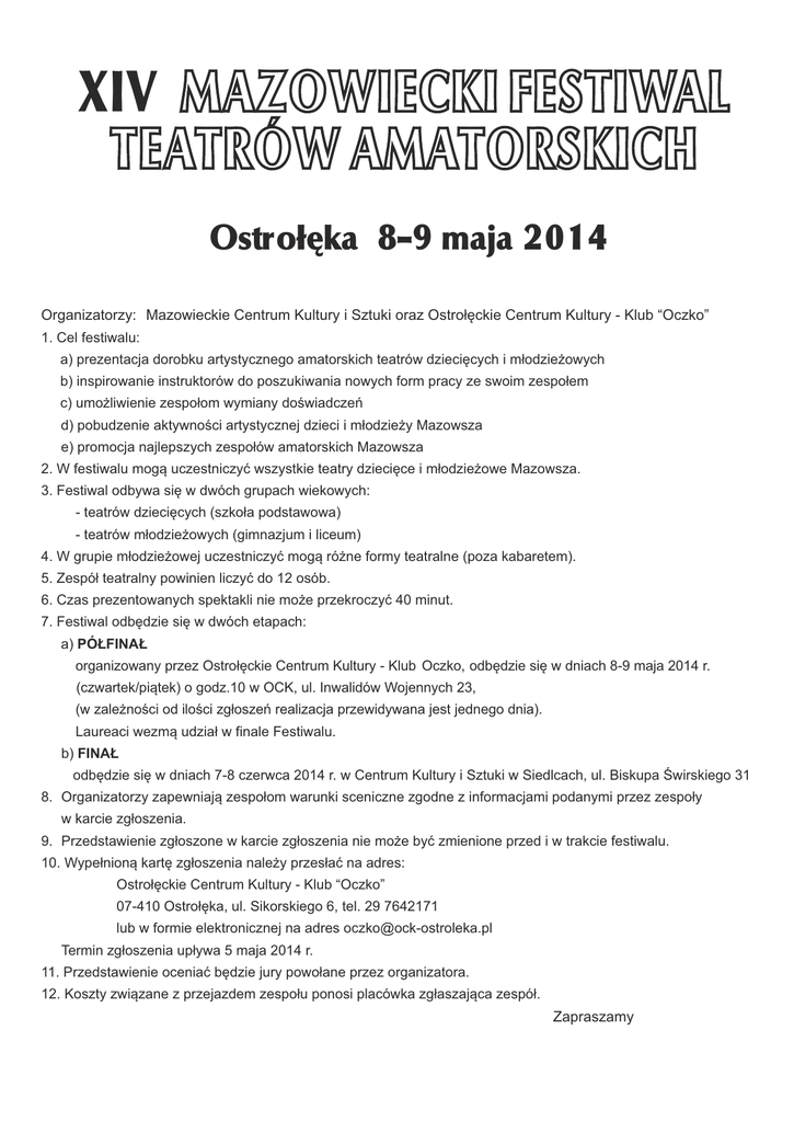 XIV MAZOWIECKI FESTIWAL TEATRÓW AMATORSKICH Ostrołęka 8-9 maja 2014 Organizatorzy: Mazowieckie Centrum Kultury i Sztuki oraz Ostrołęckie Centrum Kultury - Klub “Oczko” 1. Cel festiwalu: a) prezentacja dorobku artystycznego amatorskich teatrów dziecięcych i młodzieżowych b) inspirowanie instruktorów do poszukiwania nowych form pracy ze swoim zespołem c) umożliwienie zespołom wymiany doświadczeń d) pobudzenie aktywności artystycznej dzieci i młodzieży Mazowsza e) promocja najlepszych zespołów amatorskich Mazowsza 2. W festiwalu mogą uczestniczyć wszystkie teatry dziecięce i młodzieżowe Mazowsza. 3. Festiwal odbywa się w dwóch grupach wiekowych: - teatrów dziecięcych (szkoła podstawowa) - teatrów młodzieżowych (gimnazjum i liceum) 4. W grupie młodzieżowej uczestniczyć mogą różne formy teatralne (poza kabaretem). 5. Zespół teatralny powinien liczyć do 12 osób. 6. Czas prezentowanych spektakli nie może przekroczyć 40 minut. 7. Festiwal odbędzie się w dwóch etapach: a) PÓŁFINAŁ organizowany przez Ostrołęckie Centrum Kultury - Klub Oczko, odbędzie się w dniach 8-9 maja 2014 r. (czwartek/piątek) o godz.10 w OCK, ul. Inwalidów Wojennych 23, (w zależności od ilości zgłoszeń realizacja przewidywana jest jednego dnia). Laureaci wezmą udział w finale Festiwalu. b) FINAŁ odbędzie się w dniach 7-8 czerwca 2014 r. w Centrum Kultury i Sztuki w Siedlcach, ul. Biskupa Świrskiego 31 8. Organizatorzy zapewniają zespołom warunki sceniczne zgodne z informacjami podanymi przez zespoły w karcie zgłoszenia. 9. Przedstawienie zgłoszone w karcie zgłoszenia nie może być zmienione przed i w trakcie festiwalu. 10. Wypełnioną kartę zgłoszenia należy przesłać na adres: Ostrołęckie Centrum Kultury - Klub “Oczko” 07-410 Ostrołęka, ul. Sikorskiego 6, tel. 29 7642171 lub w formie elektronicznej na adres [email protected] Termin zgłoszenia upływa 5 maja 2014 r. 11. Przedstawienie oceniać będzie jury powołane przez organizatora. 12. Koszty związane z przejazdem zespołu ponosi placówka zgłaszająca zespół. Zapraszamy XIV MAZOWIECKI FESTIWAL TEATRÓW AMATORSKICH Ostrołęka, 8-9 maja 2014 KARTA ZGŁOSZENIA 1. Nazwa teatru . . . . . . . . . . . . . . . . . . . . . . . . . . . . . . . . . . . . . . . . . . . . . . . . . . . . . . . . . . . . . . . . . . . . . . . . . . . . . . . . 2. Imię i nazwisko kierownika zespołu . . . . . . . . . . . . . . . . . . . . . . . . . . . . . . . . . . . . . . . . . . . . . . . . . . . . . . . . . . . . . . . 3. Kategoria teatru (zaznaczyć x): dziecięca (szkoła podstawowa) młodzieżowa (gimnazjum, liceum) 4. Rodzaj teatru (dot. młodzieżowych): a) większe formy teatralne: . . . . . . . . . . . . . . . . . . . . . . . . . . . . . . . . . . . . . . . . . . . . . . . . . . . . . . . . . . . . . . . . . b) małe formy teatralne (maks. 3 osoby) . . . . . . . . . . . . . . . . . . . . . . . . . . . . . . . . . . . . . . . . . . . . . . . . . . . . . . . c) teatr ruchu, dźwięku, światła, plastyki . . . . . . . . . . . . . . . . . . . . . . . . . . . . . . . . . . . . . . . . . . . . . . . . . . . . . . . 5. Adres do korespondencji: . . . . . . . . . . . . . . . . . . . . . . . . . . . . . . . . . . . . . . . . . . . . . . . . . . . . . . . . . . . . . . . . . . . . . . . . . . . . . . . . . . . . . . . . . . . . . . . . . . . tel. . . . . . . . . . . . . . . . . . . . . . . . 6. Tytuł spektaklu: . . . . . . . . . . . . . . . . . . . . . . . . . . . . . . . . . . . . . . . . . . . . . . . . . . . . . . . . . . . . . . . . . . . . . . . . . . . . . . 7. Imię i nazwisko autora sztuki: . . . . . . . . . . . . . . . . . . . . . . . . . . . . . . . . . . . . . . . . . . . . . . . . . . . . . . . . . . . . . . . . . . . 8. Imię i nazwisko reżysera: . . . . . . . . . . . . . . . . . . . . . . . . . . . . . . . . . . . . . . . . . . . . . . . . . . . . . . . . . . . . . . . . . . . . . . . 9. Imię i nazwisko autora muzyki: . . . . . . . . . . . . . . . . . . . . . . . . . . . . . . . . . . . . . . . . . . . . . . . . . . . . . . . . . . . . . . . . . . 10. Imię i nazwisko autora scenografii: . . . . . . . . . . . . . . . . . . . . . . . . . . . . . . . . . . . . . . . . . . . . . . . . . . . . . . . . . . . . . . . 11. Imię i nazwisko autora choreografii: . . . . . . . . . . . . . . . . . . . . . . . . . . . . . . . . . . . . . . . . . . . . . . . . . . . . . . . . . . . . . . 12. Czas trwania spektaklu: . . . . . . . . . . . . . . . . . . . . . 13. Czas trwania montażu dekoracji: . . . . . . . . . . . . . . 14. Czas trwania demontażu dekoracji: . . . . . . . . . . . . 15. Ilość osób biorących w przedstawieniu: . . . . . . . . 16. Wyposażenie techniczne potrzebne do zrealizowania spektaklu: . . . . . . . . . . . . . . . . . . . . . . . . . . . . . . . . . . . . . . . . . . .............................................................................................. ......................... data, miejscowość ........................ podpis kierownika zespołu ......................... (pieczęć instytucji wysyłającej zespół) UWAGA! Wypełnioną kartę należy wysłać do dnia 5 maja 2014 r. na adres: Klub OCZKO, 07-410 Ostrołęka, ul. Sikorskiego 6 (tel. 29 7642171) lub [email protected]