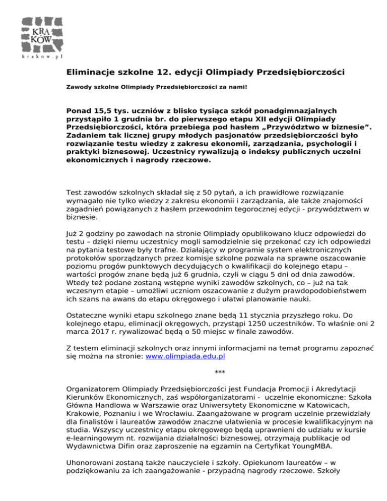 Eliminacje szkolne 12. edycji Olimpiady Przedsiębiorczości Zawody szkolne Olimpiady Przedsiębiorczości za nami! Ponad 15,5 tys. uczniów z blisko tysiąca szkół ponadgimnazjalnych przystąpiło 1 grudnia br. do pierwszego etapu XII edycji Olimpiady Przedsiębiorczości, która przebiega pod hasłem „Przywództwo w biznesie”. Zadaniem tak licznej grupy młodych pasjonatów przedsiębiorczości było rozwiązanie testu wiedzy z zakresu ekonomii, zarządzania, psychologii i praktyki biznesowej. Uczestnicy rywalizują o indeksy publicznych uczelni ekonomicznych i nagrody rzeczowe. Test zawodów szkolnych składał się z 50 pytań, a ich prawidłowe rozwiązanie wymagało nie tylko wiedzy z zakresu ekonomii i zarządzania, ale także znajomości zagadnień powiązanych z hasłem przewodnim tegorocznej edycji - przywództwem w biznesie. Już 2 godziny po zawodach na stronie Olimpiady opublikowano klucz odpowiedzi do testu – dzięki niemu uczestnicy mogli samodzielnie się przekonać czy ich odpowiedzi na pytania testowe były trafne. Działający w programie system elektronicznych protokołów sporządzanych przez komisje szkolne pozwala na sprawne oszacowanie poziomu progów punktowych decydujących o kwalifikacji do kolejnego etapu – wartości progów znane będą już 6 grudnia, czyli w ciągu 5 dni od dnia zawodów. Wtedy też podane zostaną wstępne wyniki zawodów szkolnych, co – już na tak wczesnym etapie – umożliwi uczniom oszacowanie z dużym prawdopodobieństwem ich szans na awans do etapu okręgowego i ułatwi planowanie nauki. Ostateczne wyniki etapu szkolnego znane będą 11 stycznia przyszłego roku. Do kolejnego etapu, eliminacji okręgowych, przystąpi 1250 uczestników. To właśnie oni 2 marca 2017 r. rywalizować będą o 50 miejsc w finale zawodów. Z testem eliminacji szkolnych oraz innymi informacjami na temat programu zapoznać się można na stronie: www.olimpiada.edu.pl *** Organizatorem Olimpiady Przedsiębiorczości jest Fundacja Promocji i Akredytacji Kierunków Ekonomicznych, zaś współorganizatorami - uczelnie ekonomiczne: Szkoła Główna Handlowa w Warszawie oraz Uniwersytety Ekonomiczne w Katowicach, Krakowie, Poznaniu i we Wrocławiu. Zaangażowane w program uczelnie przewidziały dla finalistów i laureatów zawodów znaczne ułatwienia w procesie kwalifikacyjnym na studia. Wszyscy uczestnicy etapu okręgowego będą uprawnieni do udziału w kursie e-learningowym nt. rozwijania działalności biznesowej, otrzymają publikacje od Wydawnictwa Difin oraz zaproszenie na egzamin na Certyfikat YoungMBA. Uhonorowani zostaną także nauczyciele i szkoły. Opiekunom laureatów – w podziękowaniu za ich zaangażowanie - przypadną nagrody rzeczowe. Szkoły zwycięzców zostaną wyróżnione zestawami publikacji, przygotowującymi do kolejnej edycji zawodów. Ufundowana przez firmę Plagiat.pl nagroda specjalna Olimpiady – tablica interaktywna – zostanie rozlosowana wśród szkół zawodników zakwalifikowanych do eliminacji okręgowych, a wszystkie te szkoły otrzymają od Plagiat.pl 50% zniżkę na roczną licencję systemu antyplagiatowego „Antyściąga” i wdrożenie systemu. Ponadto - już na samym początku zawodów - 25 szkołom z małych miejscowości, które zgłoszą największą liczbę zawodników zostanie przekazana książka dotyczącą hasła przewodniego XII edycji zawodów. Wyniki Olimpiady uwzględniane są w Ogólnopolskim Rankingu Szkół Ponadgimnazjalnych, przygotowywanym wspólnie przez „Rzeczpospolitą” i „Perspektywy”. Olimpiada Przedsiębiorczości finansowana jest ze środków Narodowego Banku Polskiego i Polsko-Amerykańskiej Fundacji Wolności – Partnerów Strategicznych Olimpiady oraz z dotacji Ministerstwa Edukacji Narodowej. Projekt wspierają również m.in.: Wydawnictwo Difin, firma Plagiat.pl, Fundacja Edukacyjna Przedsiębiorczości, Krajowa Izba Gospodarcza, Pracodawcy Rzeczypospolitej Polskiej, Stowarzyszenie Nauczycieli Przedsiębiorczości i Edukacji Ekonomicznej oraz Studenckie Forum Business Centre Club. Patronami medialnymi są: „Głos Nauczycielski”, NBPortal oraz Perspektywy.pl. Informacji udziela Biuro Olimpiady Przedsiębiorczości (tel. 22 564 9725, [email protected]). ZAŁĄCZNIK: 1.Pismo Powered by TCPDF (www.tcpdf.org)