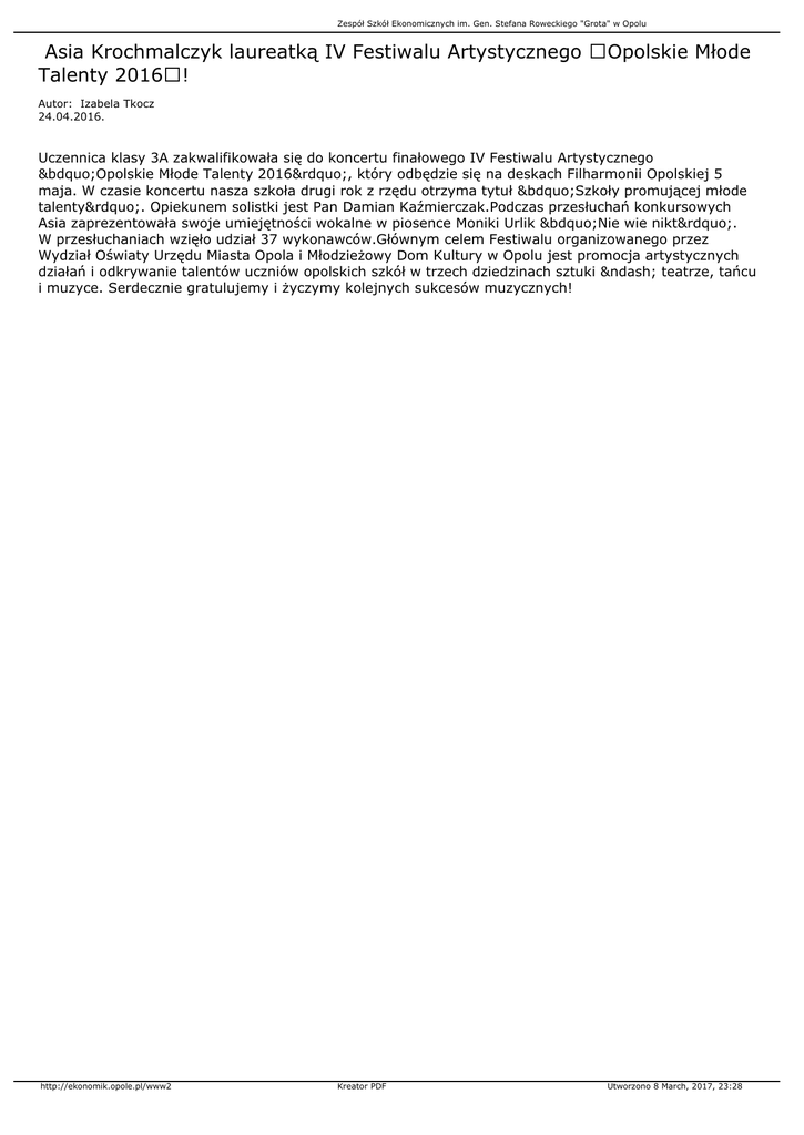 Zespół Szkół Ekonomicznych im. Gen. Stefana Roweckiego "Grota" w Opolu Asia Krochmalczyk laureatką IV Festiwalu Artystycznego Opolskie Młode Talenty 2016! Autor: Izabela Tkocz 24.04.2016. Uczennica klasy 3A zakwalifikowała się do koncertu finałowego IV Festiwalu Artystycznego „Opolskie Młode Talenty 2016”, który odbędzie się na deskach Filharmonii Opolskiej 5 maja. W czasie koncertu nasza szkoła drugi rok z rzędu otrzyma tytuł „Szkoły promującej młode talenty”. Opiekunem solistki jest Pan Damian Kaźmierczak.Podczas przesłuchań konkursowych Asia zaprezentowała swoje umiejętności wokalne w piosence Moniki Urlik „Nie wie nikt”. W przesłuchaniach wzięło udział 37 wykonawców.Głównym celem Festiwalu organizowanego przez Wydział Oświaty Urzędu Miasta Opola i Młodzieżowy Dom Kultury w Opolu jest promocja artystycznych działań i odkrywanie talentów uczniów opolskich szkół w trzech dziedzinach sztuki – teatrze, tańcu i muzyce. Serdecznie gratulujemy i życzymy kolejnych sukcesów muzycznych! http://ekonomik.opole.pl/www2 Kreator PDF Utworzono 8 March, 2017, 23:28